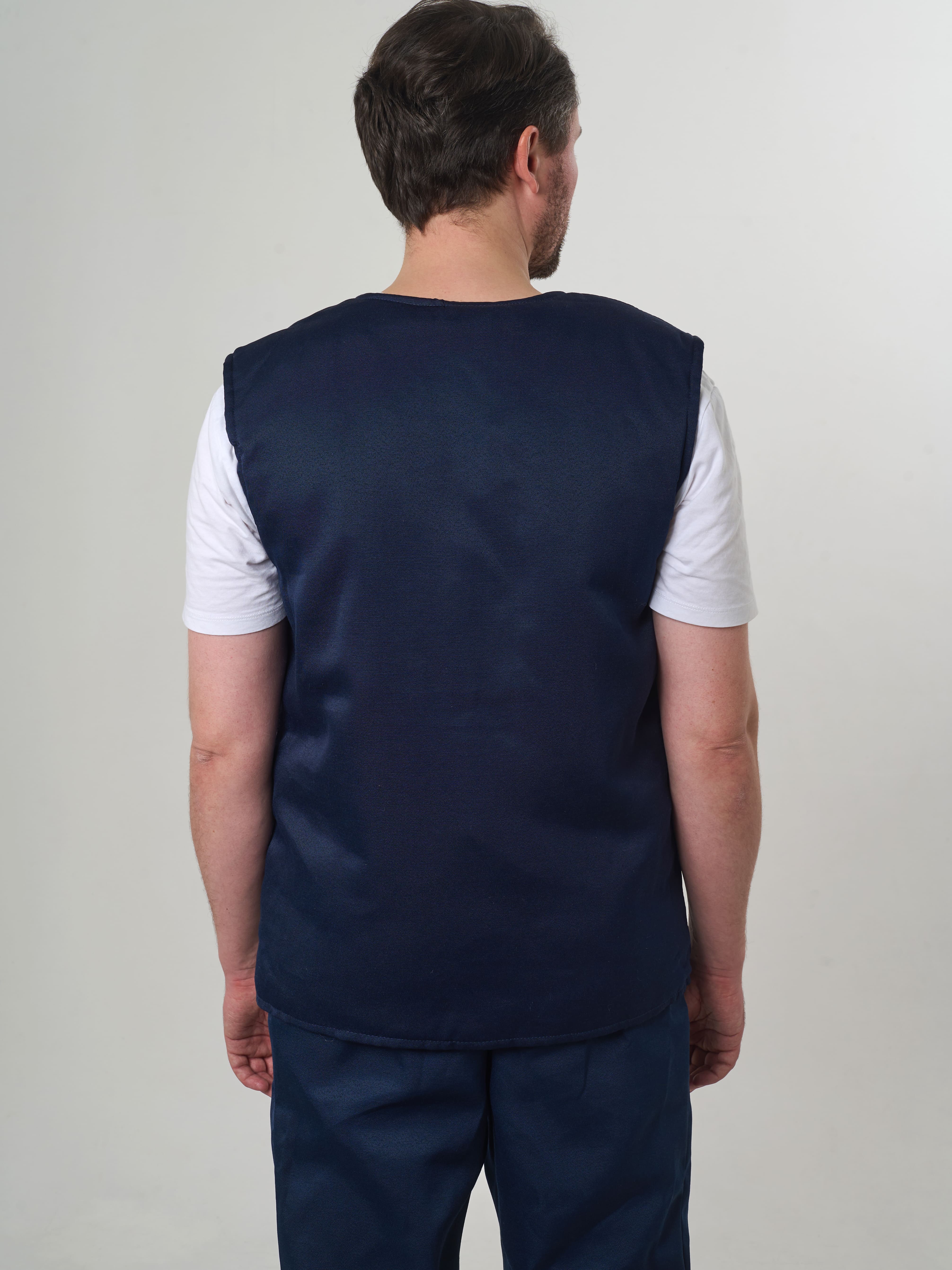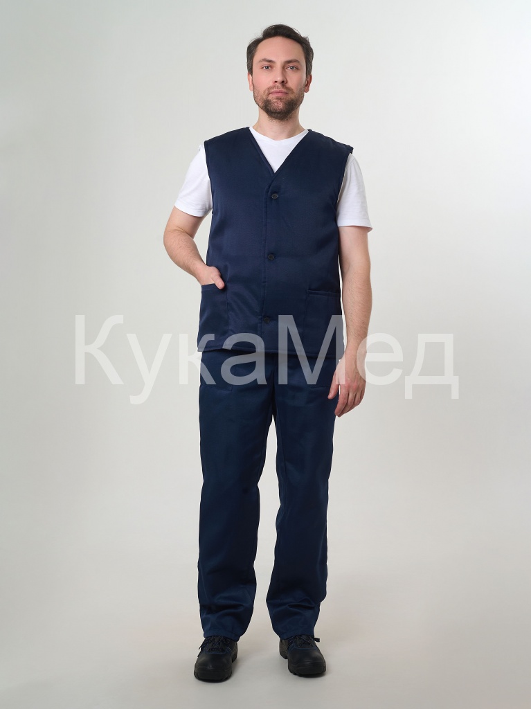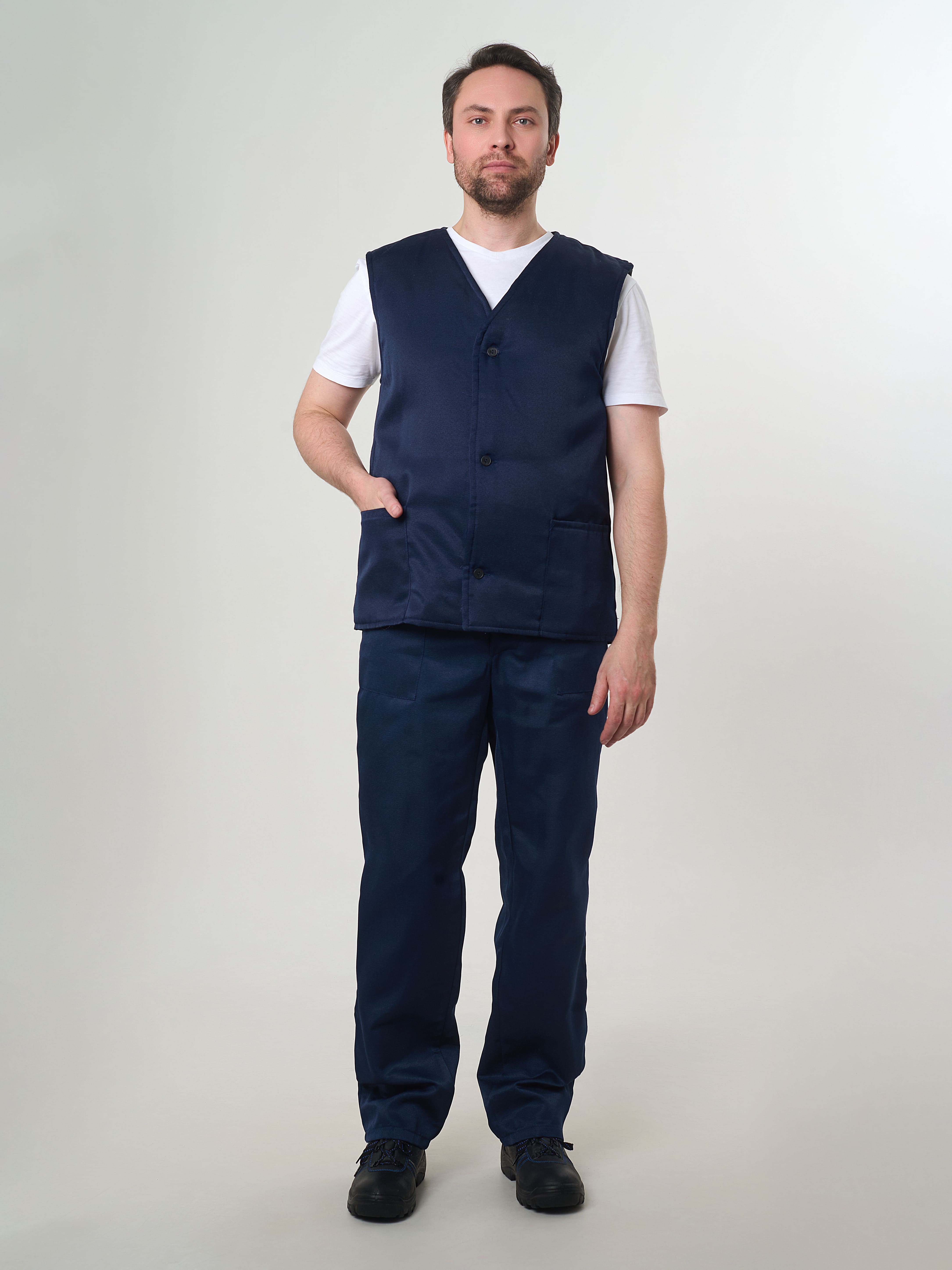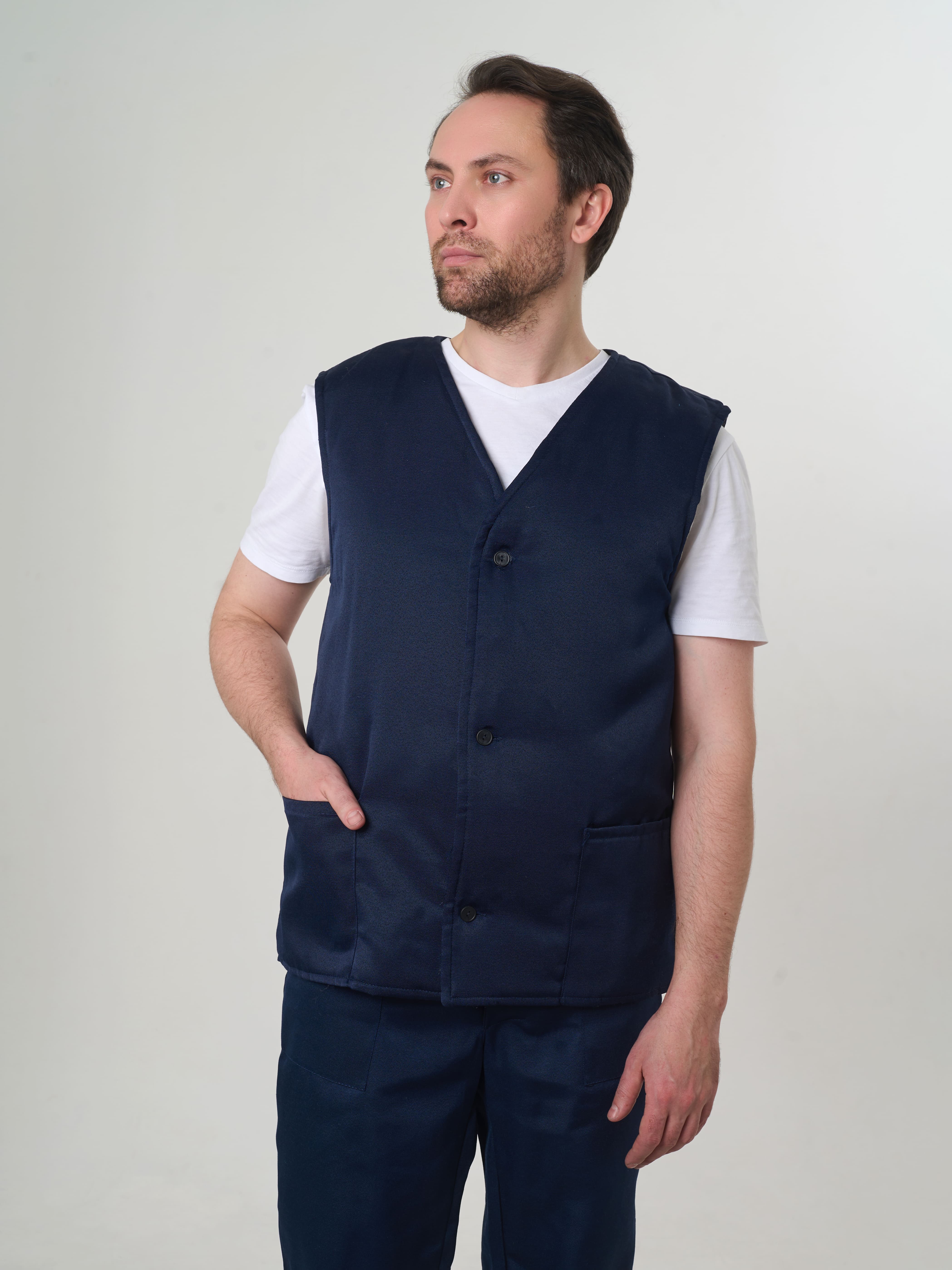 Описание: Жилет прямого силуэта, с V- образным вырезом, с притачной утепленной подкладкой, центральной застежкой на три петли- пуговицы, двумя нижними боковыми накладными карманами.