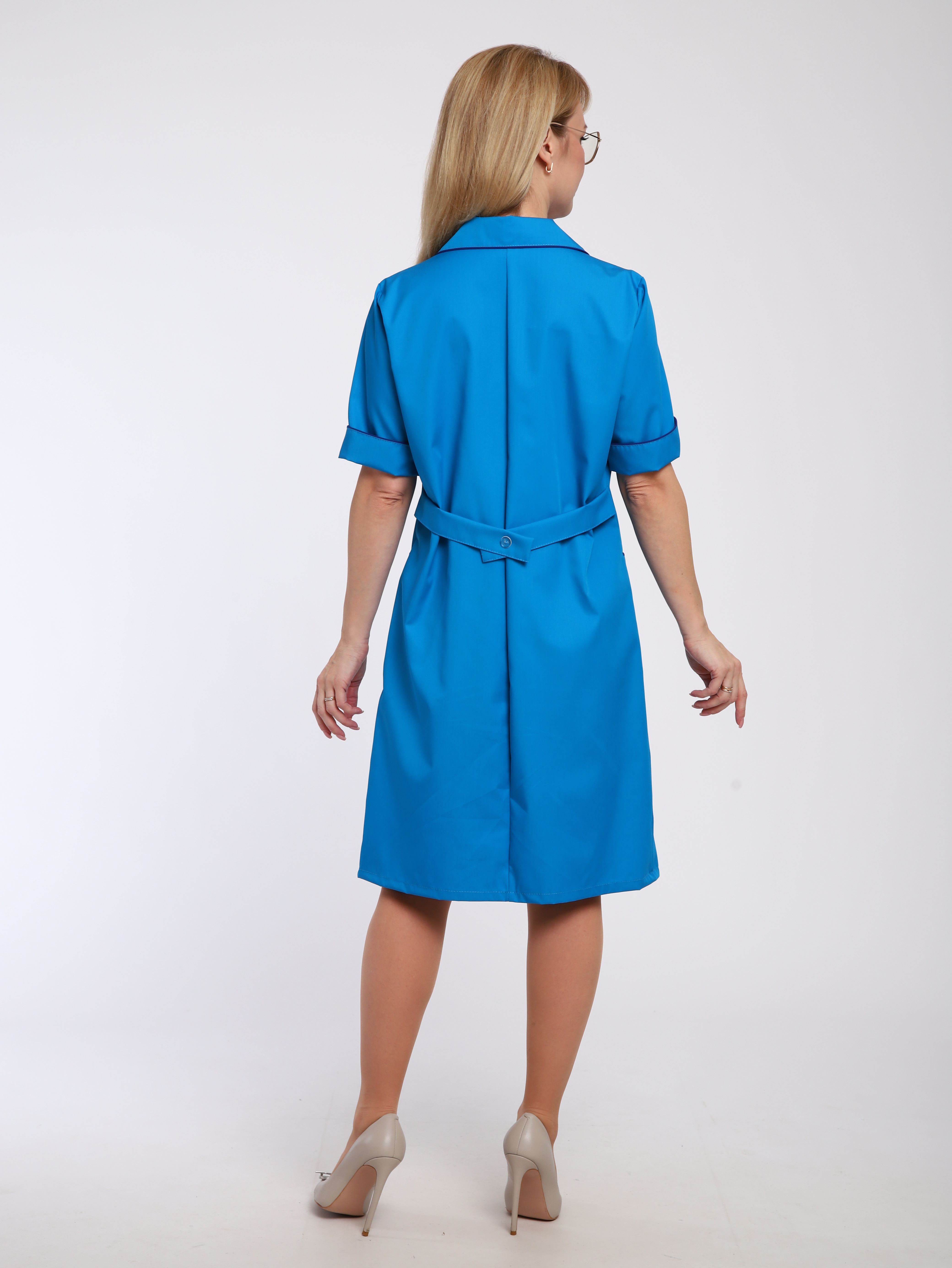 Описание: Халат укороченный полуприлегающего силуэта с коротким рукавом на пуговицах, с отделкой по воротнику, карманам и рукавам.