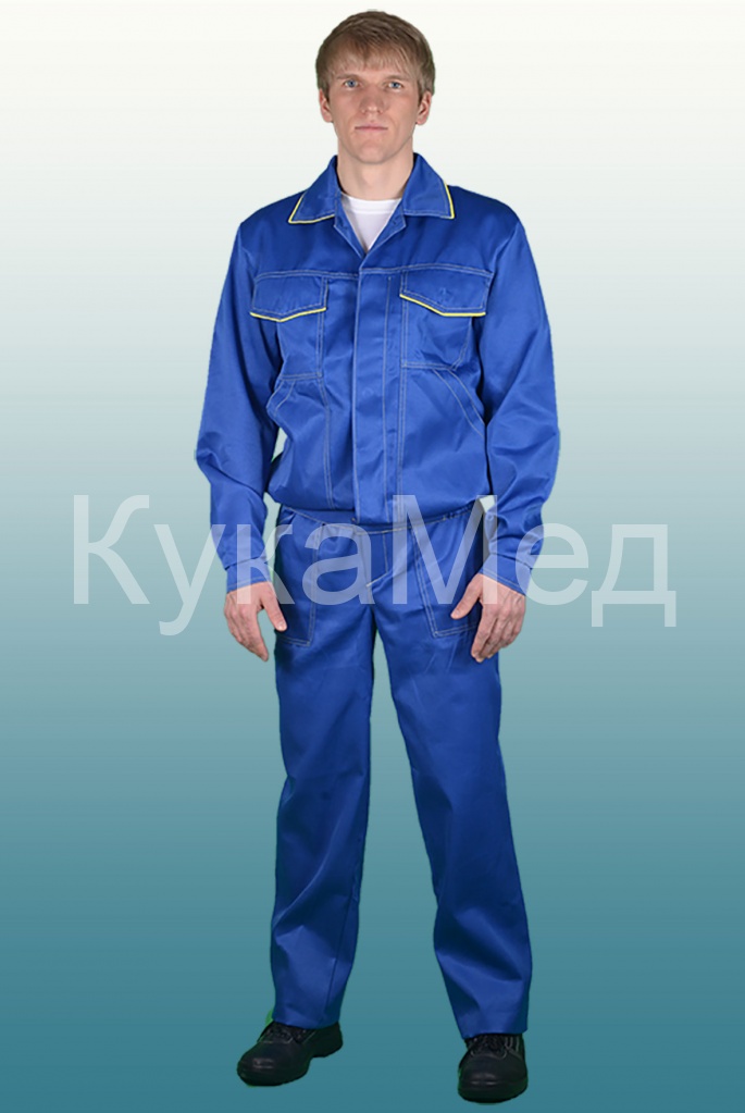 Куртка, укороченная на поясе с супатной застежкой на пуговицы. Костюм однотонный. Сверху воротник два накладных карманах на клапанах с контрастной отделкой, с низу два накладных с косым входом. Полукомбинезон с боковыми накладными карманами и накладным нагрудным карманом с клапаном. Отстрочка костюма произведена контрастными нитками в цвет отделки карманов.