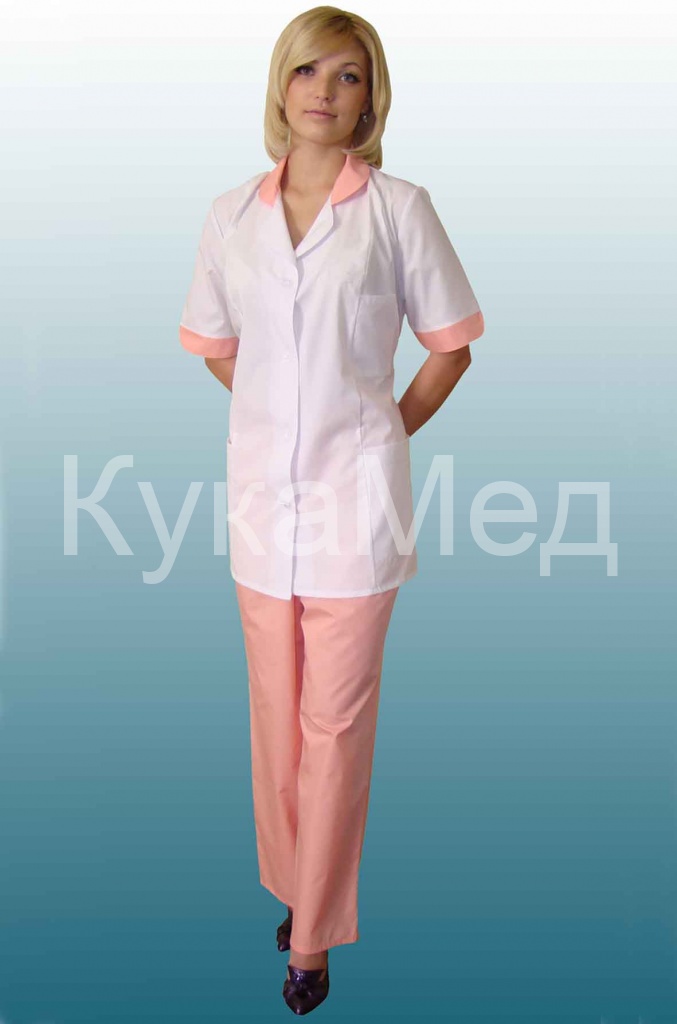 Блуза белого цвета полуприлегающего силуэта с рельефами из плечевого шва, короткими рукавами и отложным круглым воротником, на пуговицах. Отделка воротника и манжет рукавов под цвет брюк.