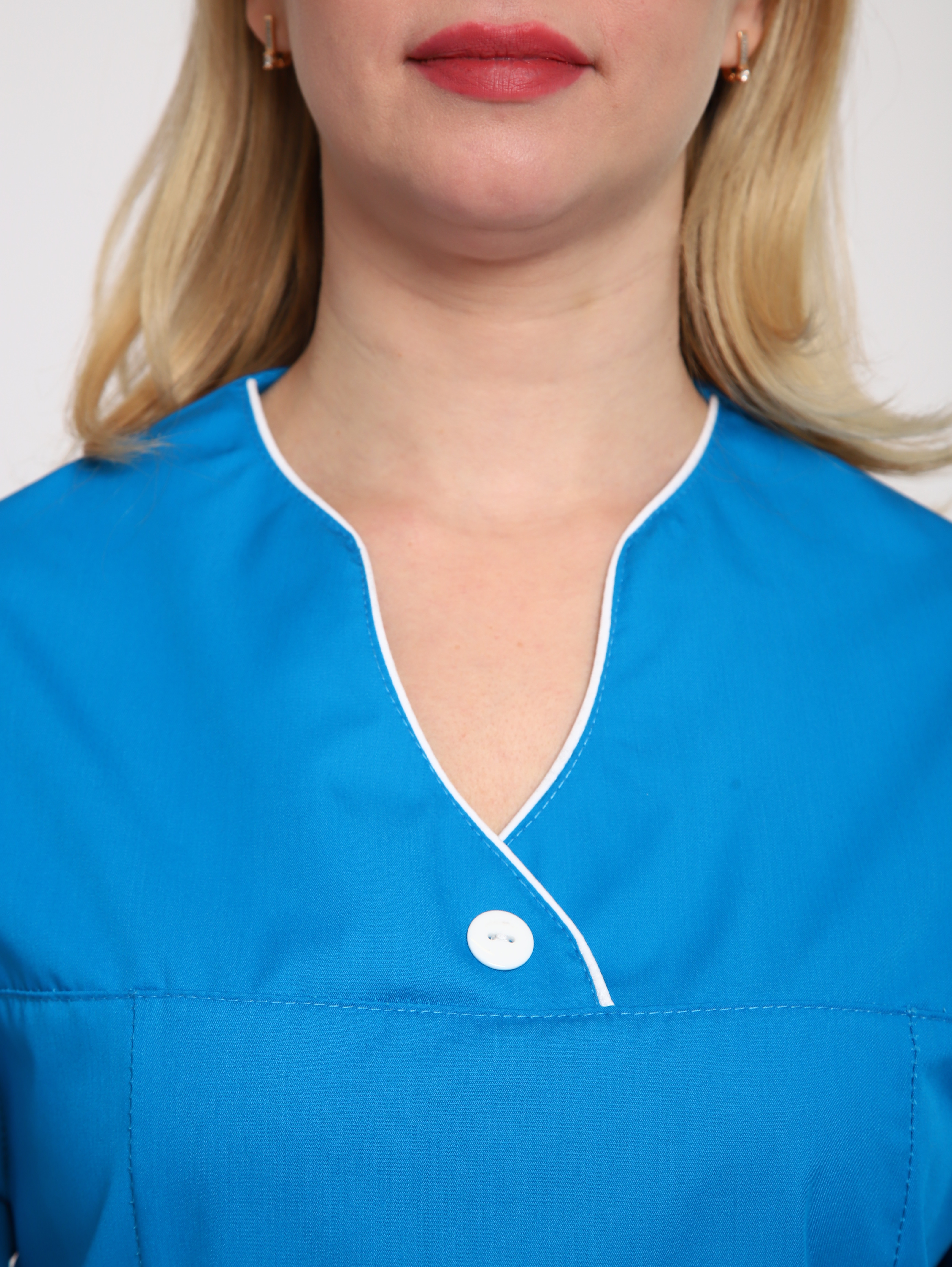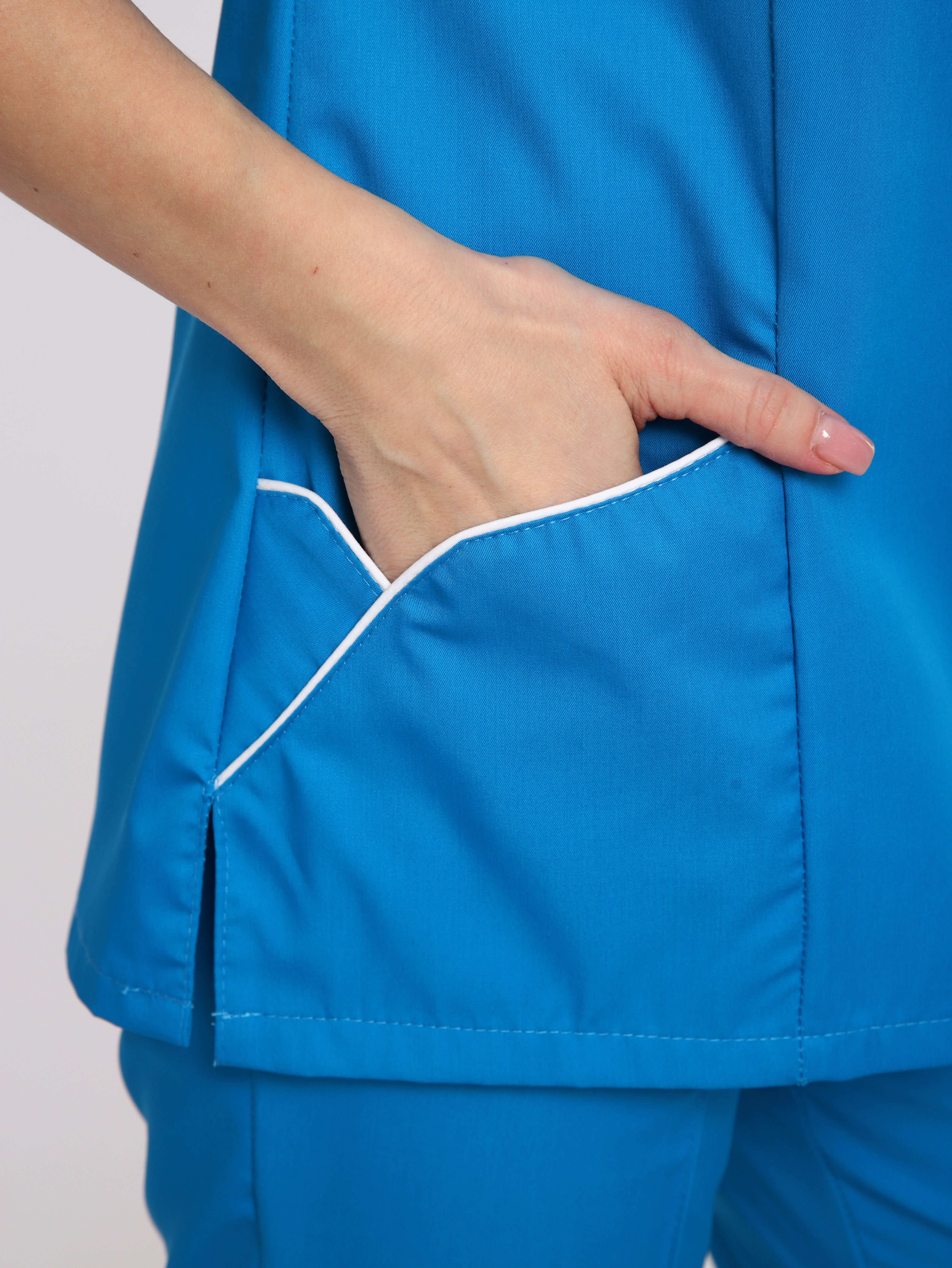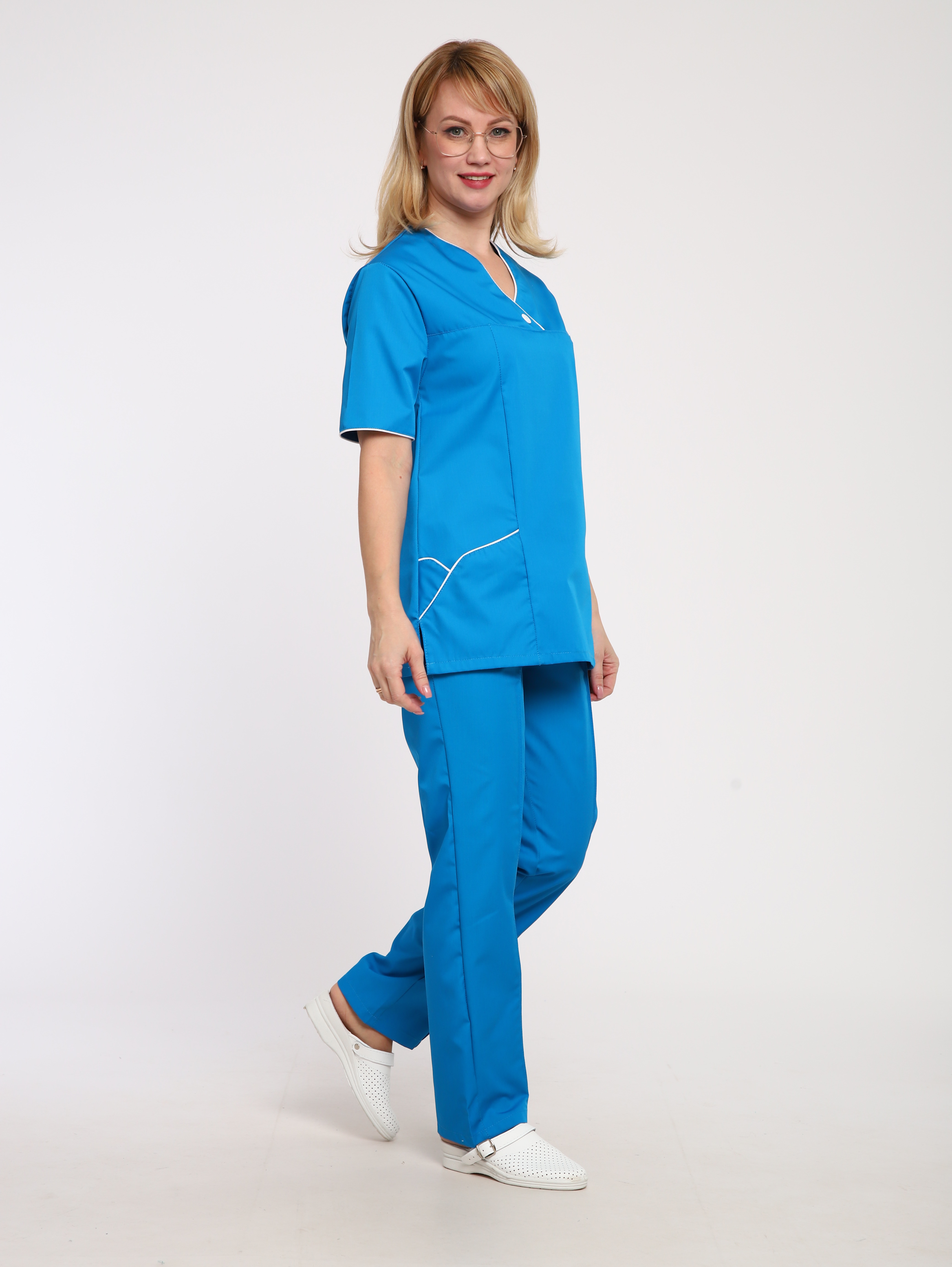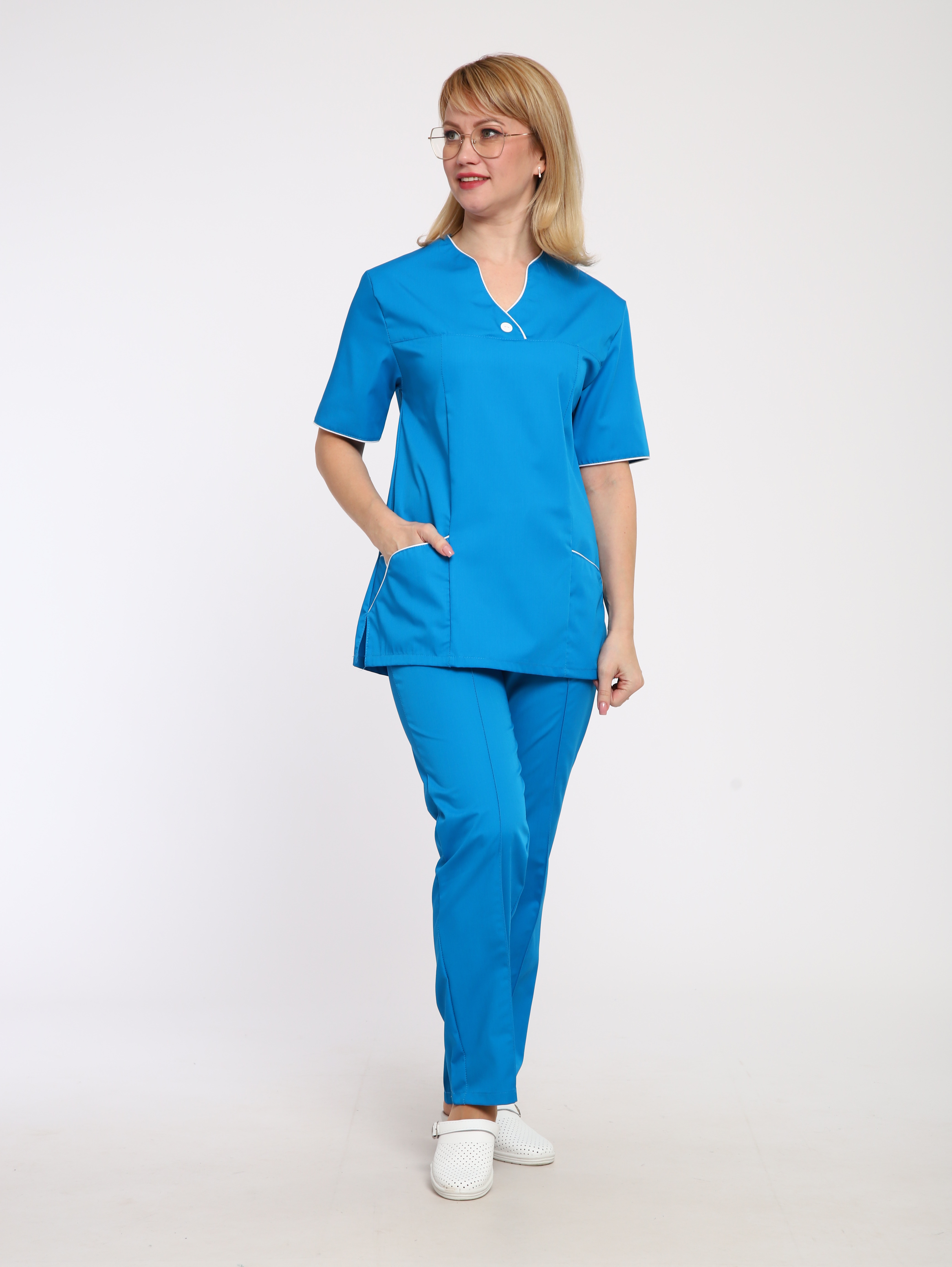 Костюм медицинский, короткий рукав, фигурный вырез горловины. С отделочным кантом по горловине, рукавам и карманам.