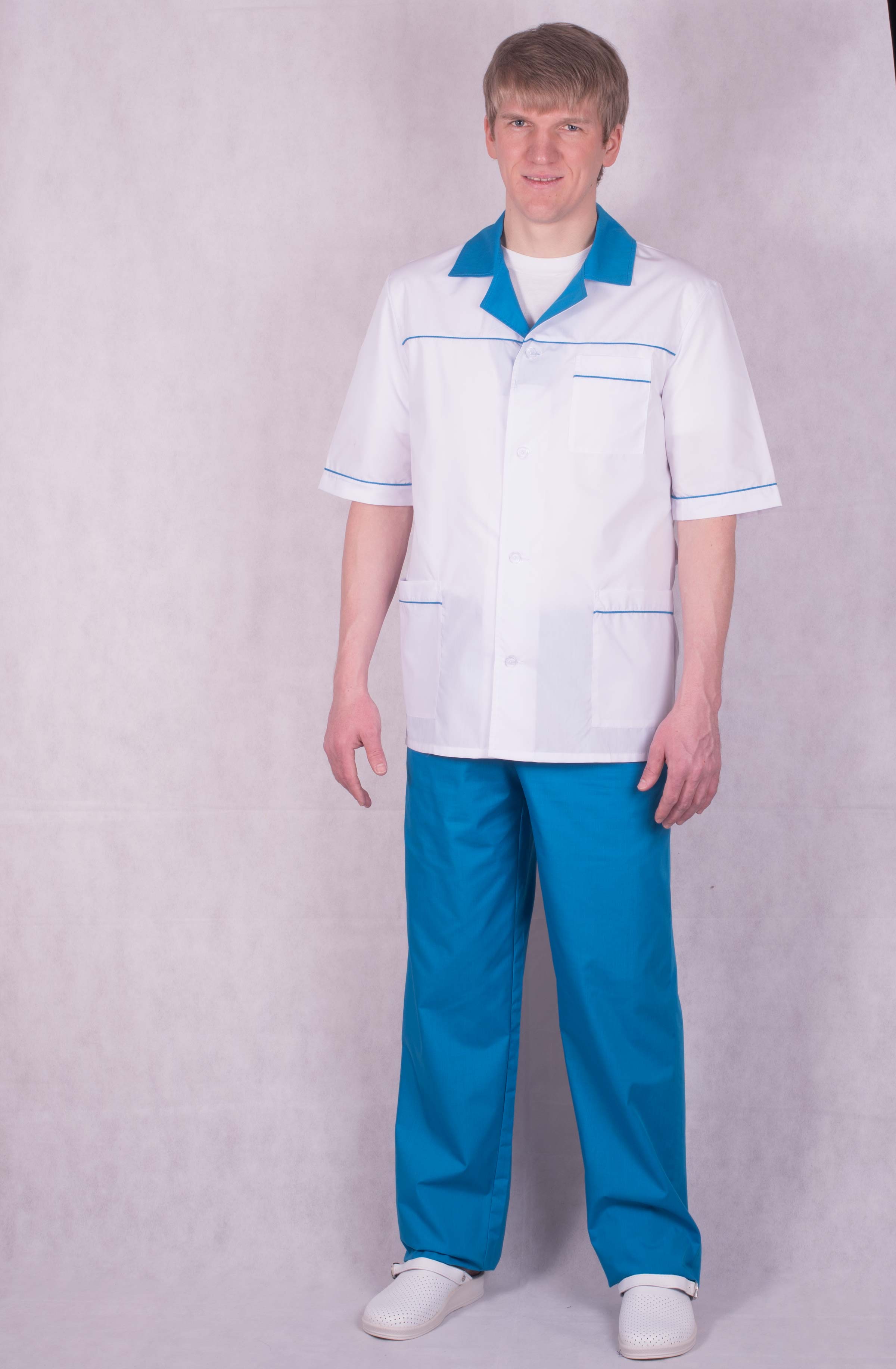 Мужской медицинский костюм с коротким рукавом на пуговицах. Ворот и отвороты в цвет брюк Отделочный кант в цв. по кокетке рукавами карманам.