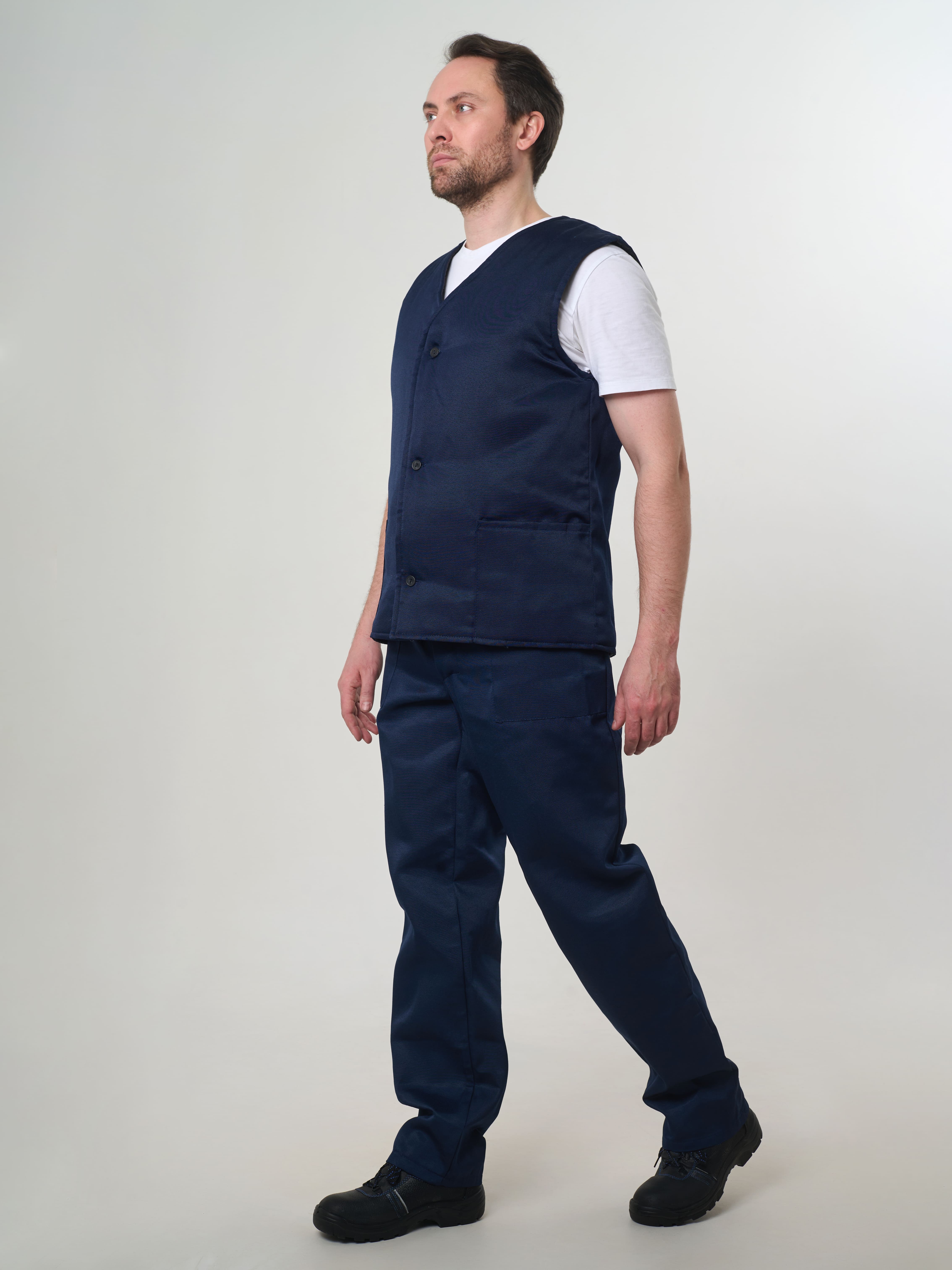 Описание: Жилет прямого силуэта, с V- образным вырезом, с притачной утепленной подкладкой, центральной застежкой на три петли- пуговицы, двумя нижними боковыми накладными карманами.