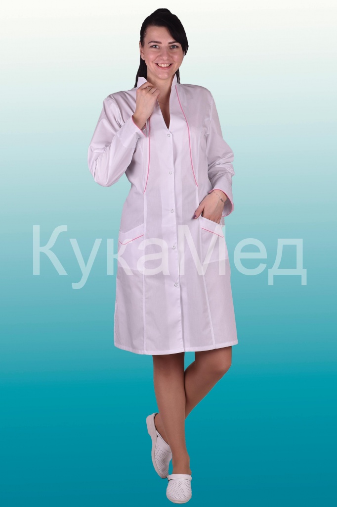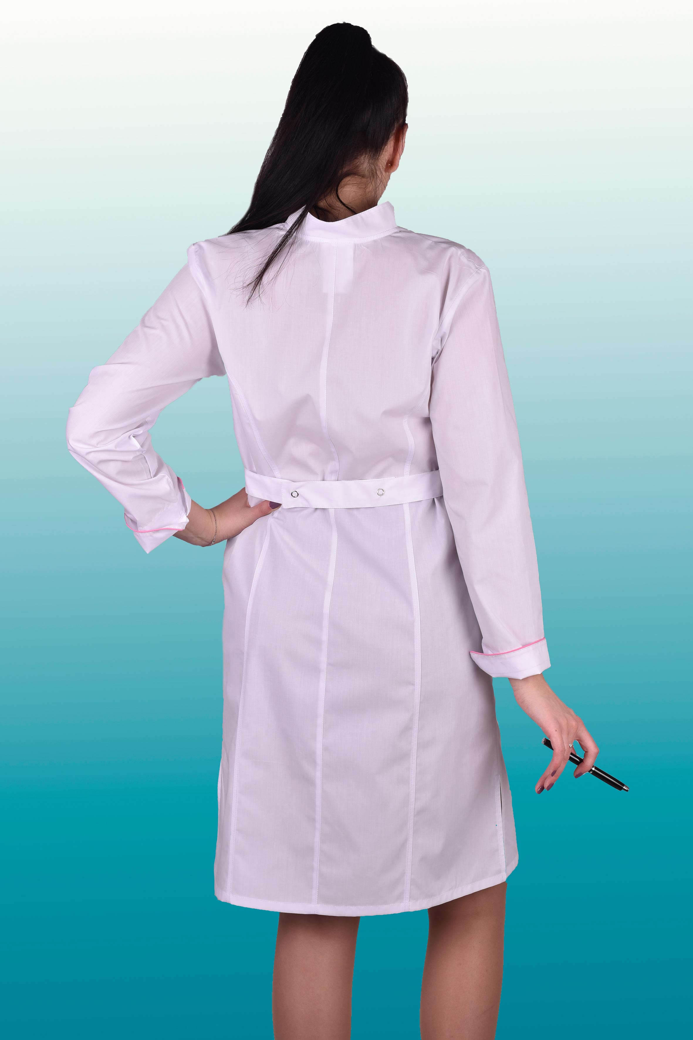 Описание: Халат приталенного силуэта, с V вырезом воротник стойка, с застежкой на кнопки. Боковые разрезы.