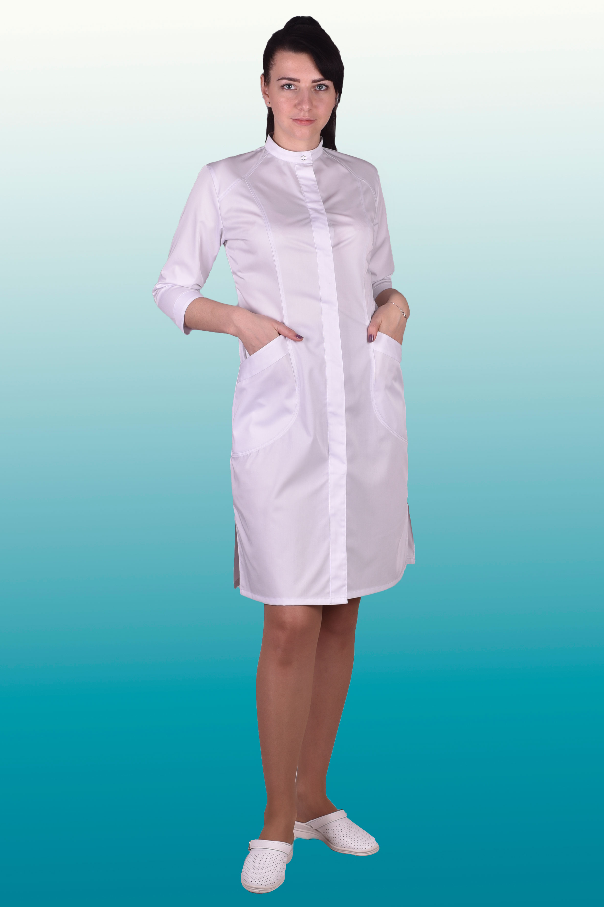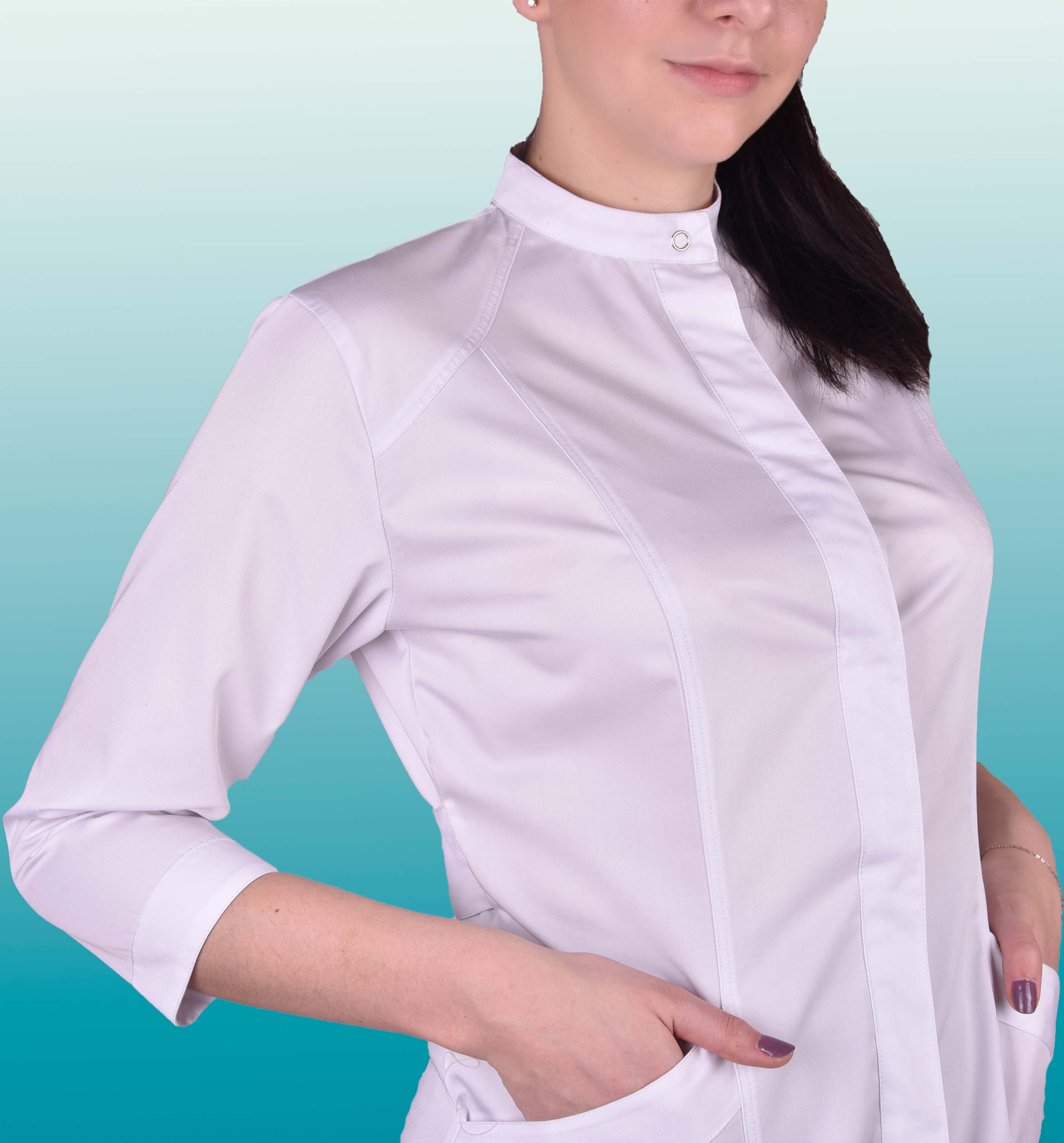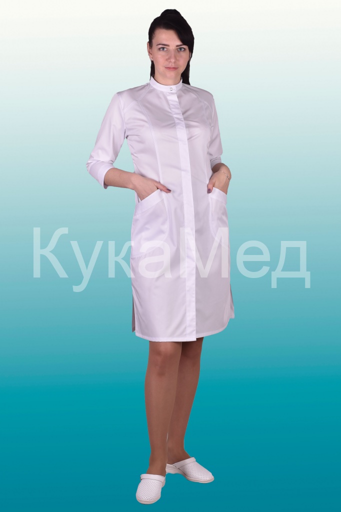 Описание: Супатной застежкой на кнопках, воротник-стойка. Рукава 3/4. Два нижних накладных кармана.