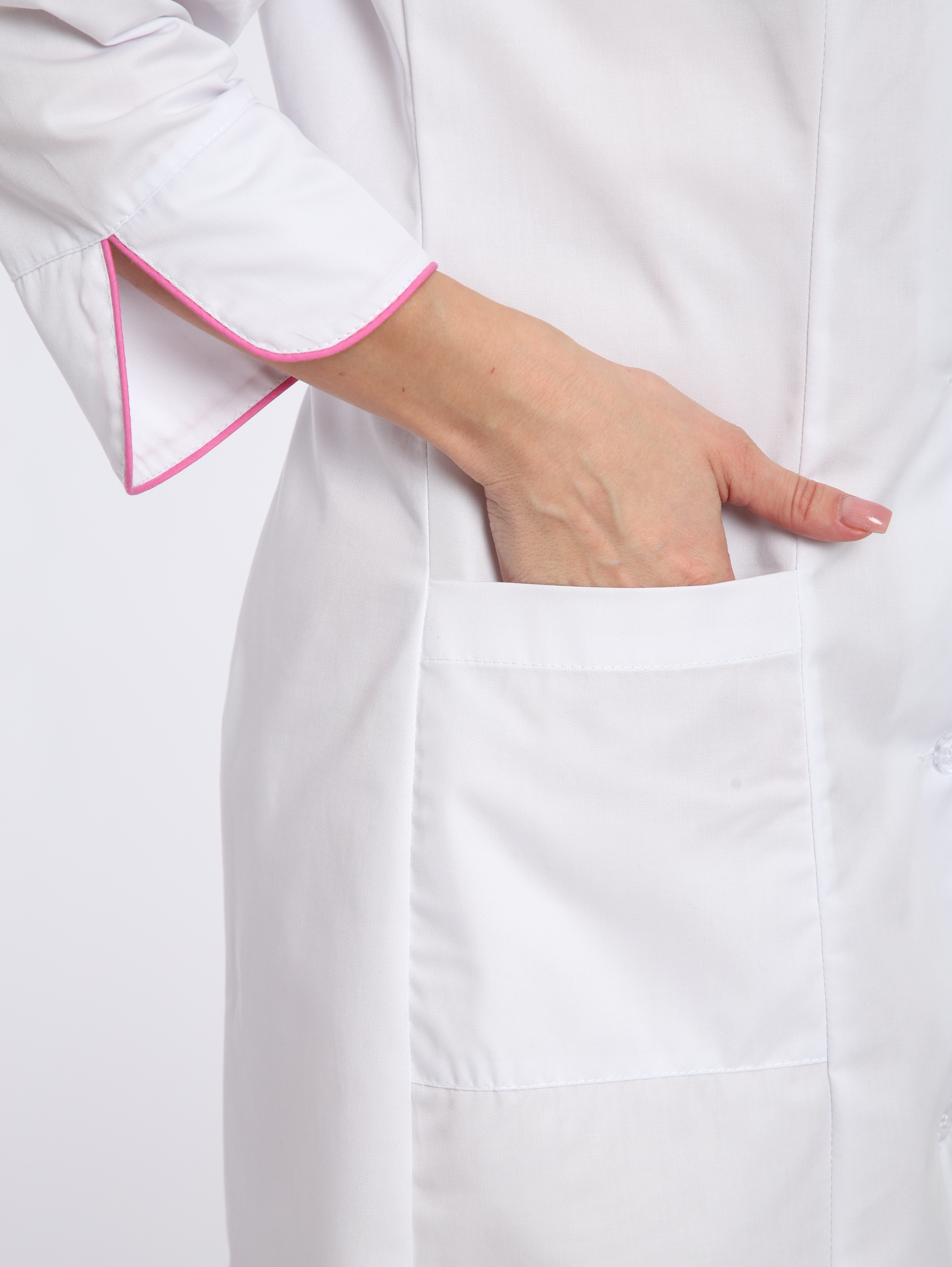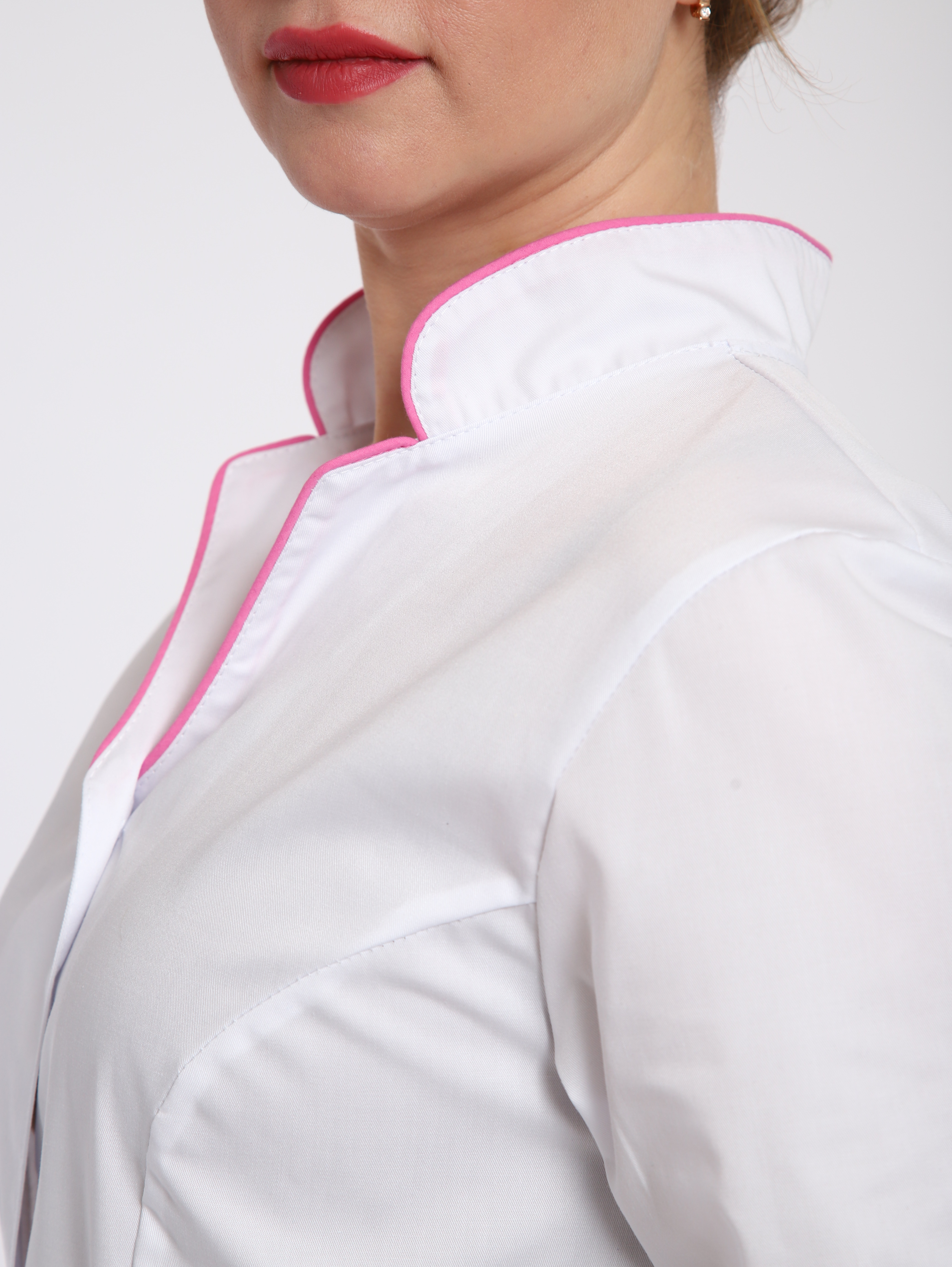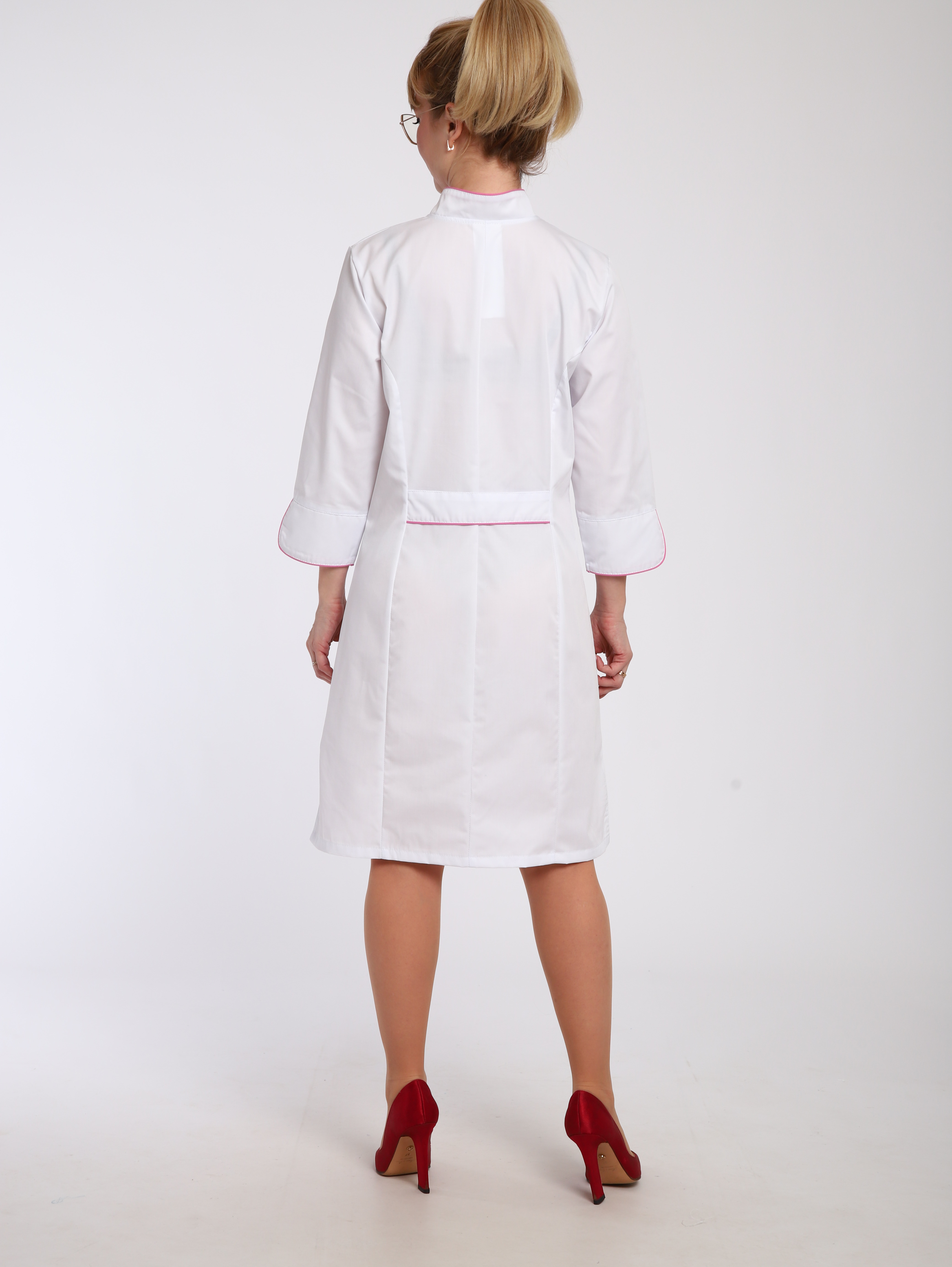 Описание: Халат укороченный полуприлегающего силуэта, рукав 3/4, на пуговицах отделочный кант по воротнику стойки и рукавам, в боковых швах разрезы.