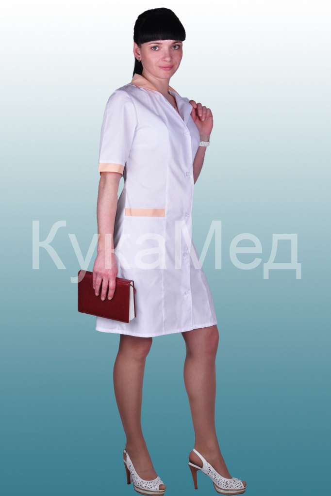 Описание: Полуприлегающий силуэт, с вертикальными рельефами и отложным воротником. Рукава короткие. По талии регулируется хлястиком. Отделка воротника, 2-х накладных карманов и рукавов.