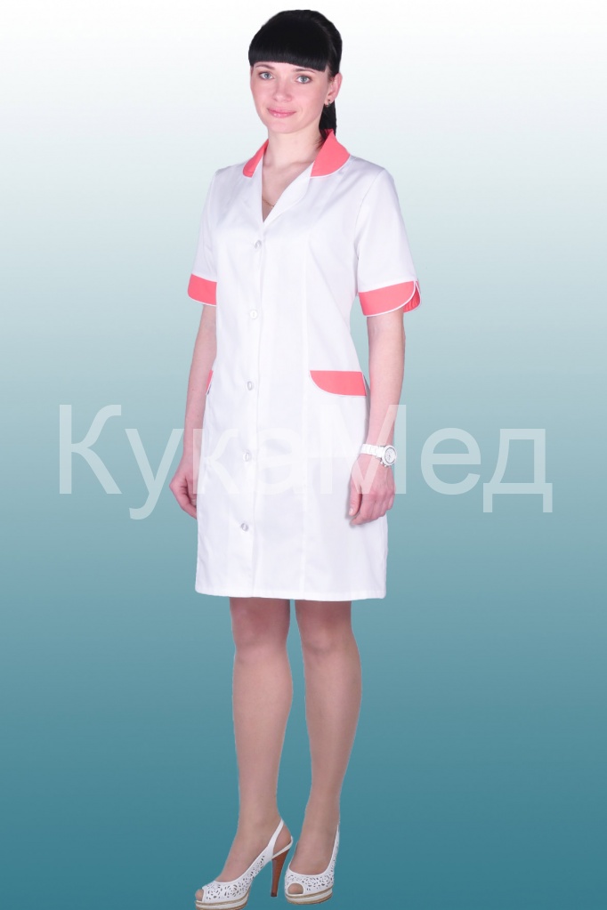 Описание: Халат укороченный полуприлегающего силуэта с короткими рукавами на пуговицах. Воротник, манжеты, клапаны на карманах из отделочной ткани с кантом.