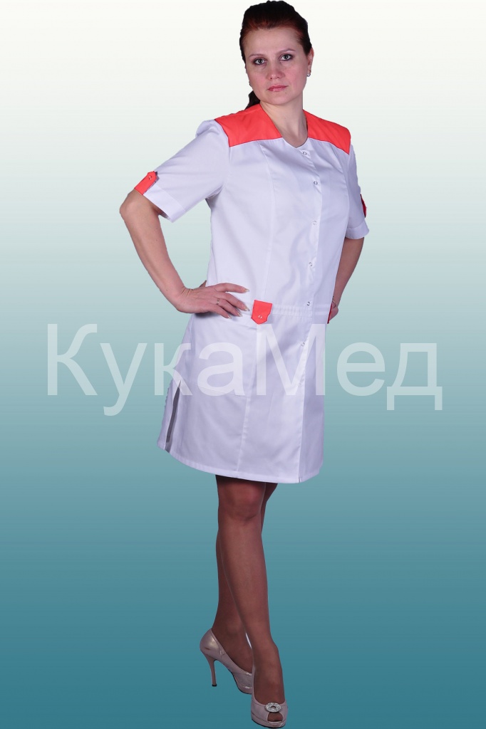 Описание: Халат укороченный с коротким рукавом на кнопках. Кокетка, паты на рукавах и пояс контрастного цвета.
