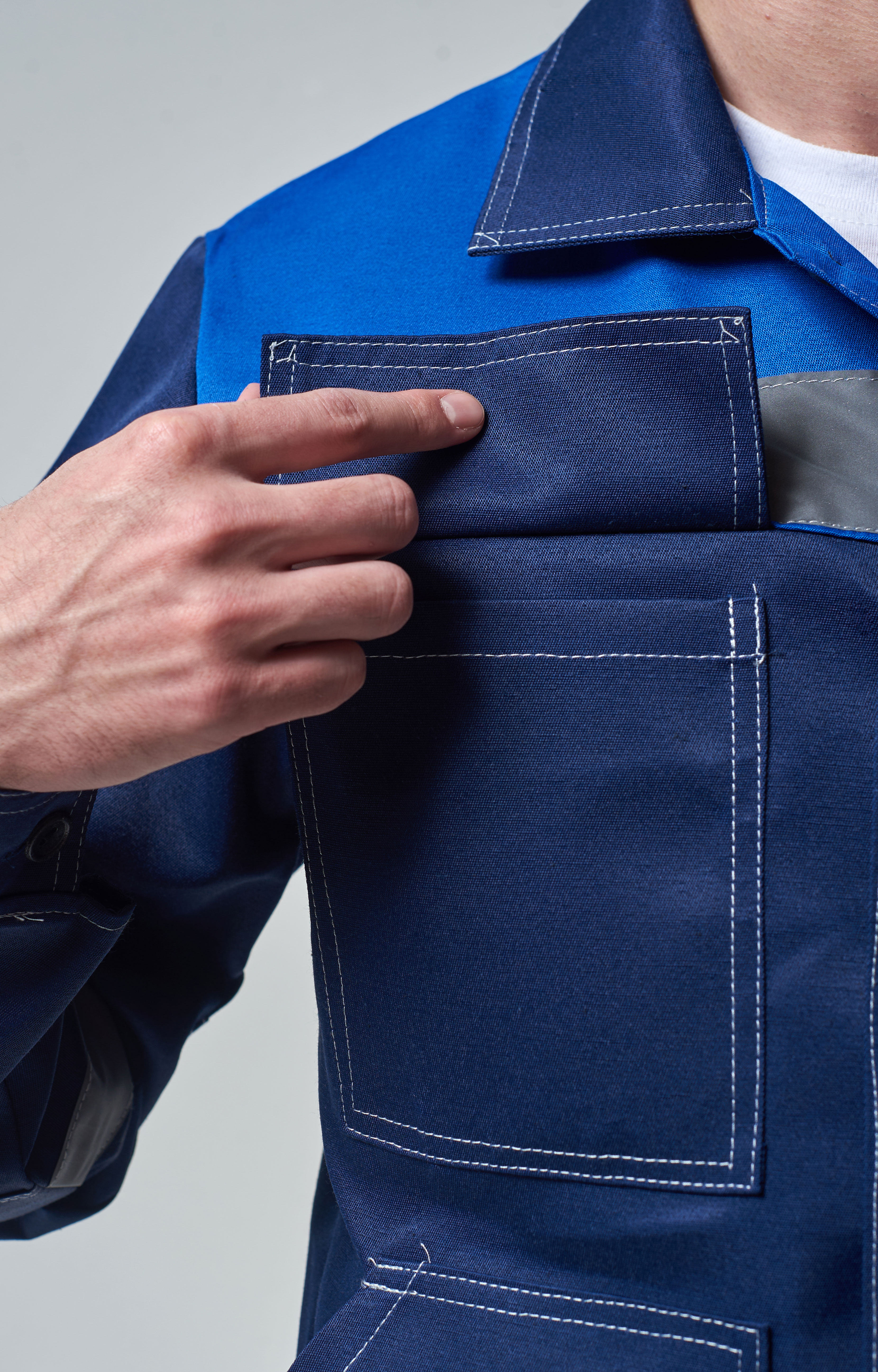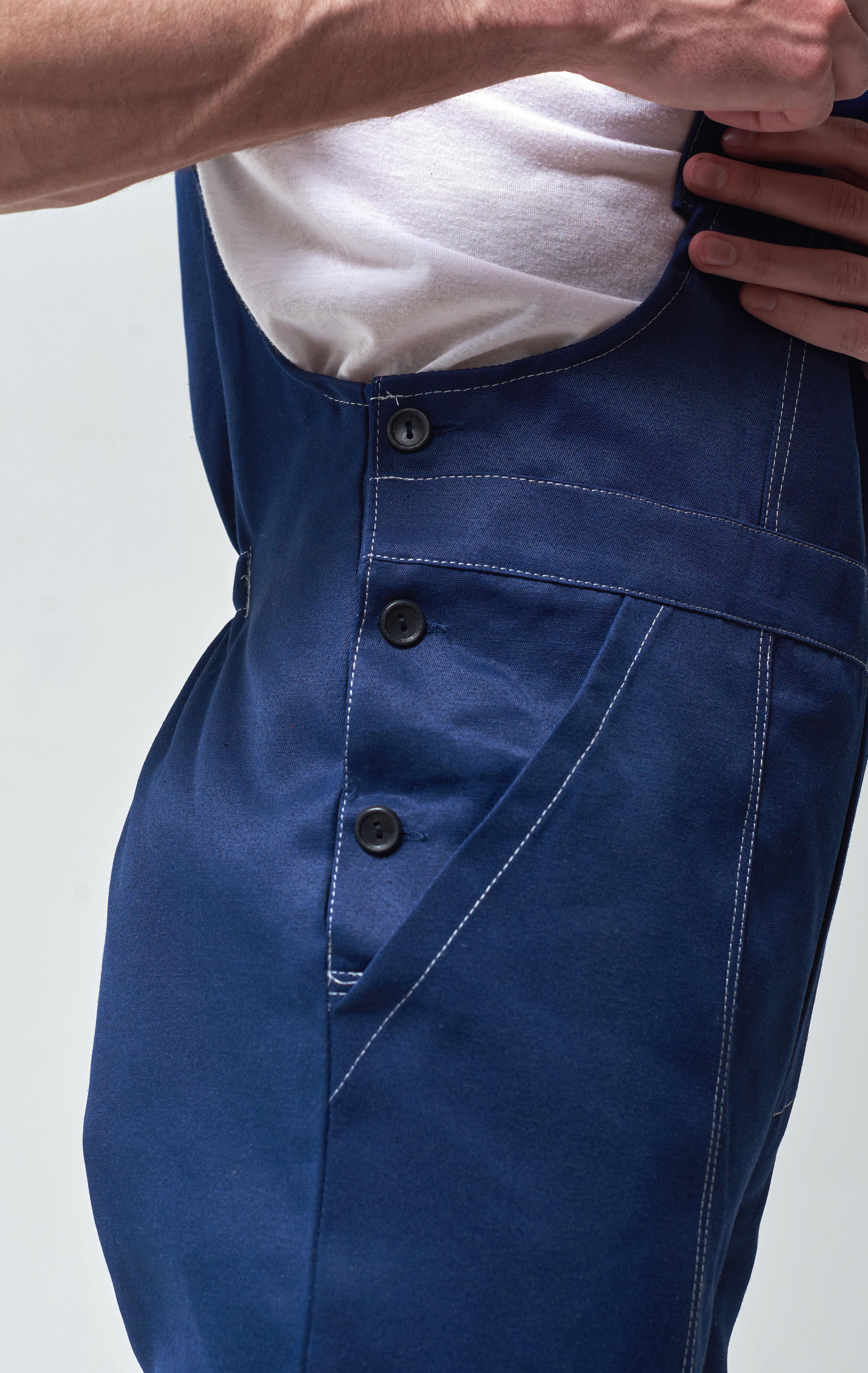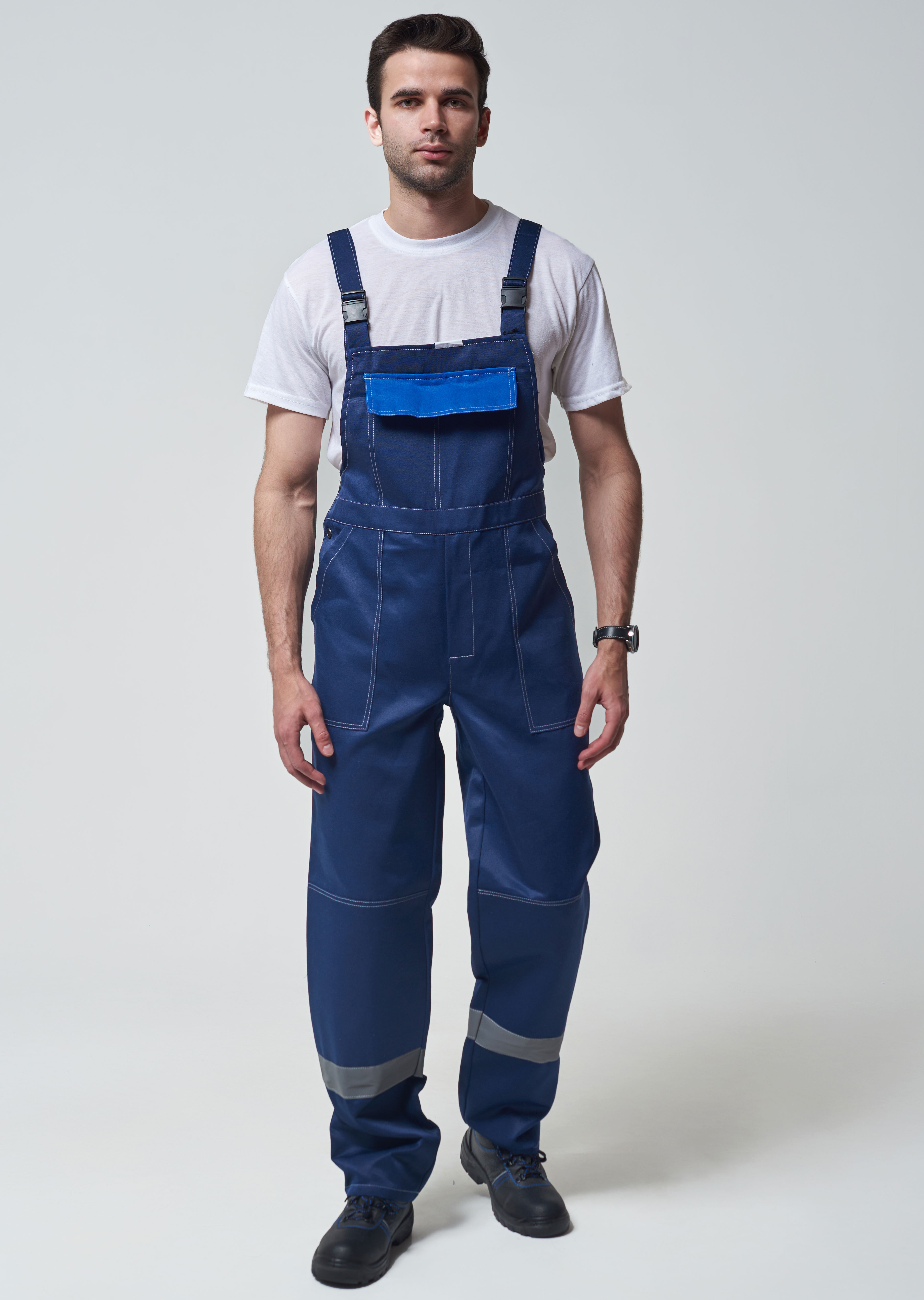 Полукомбинезон с боковыми накладными карманами и накладным нагрудным карманом разделенный на два одела с клапаном. На костюме присутствую усилители в области коленей и локтей.