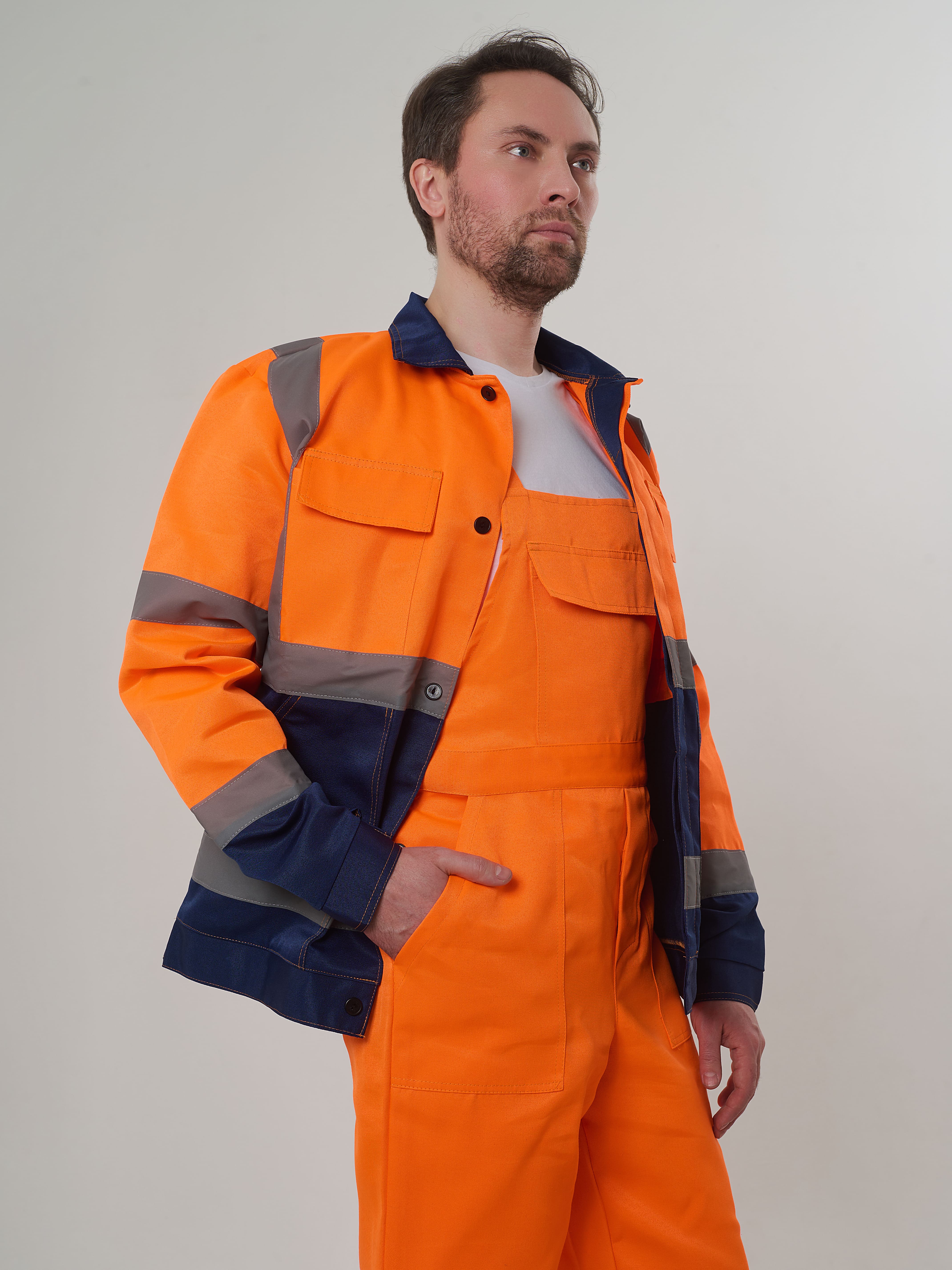 Куртка, с отложным воротником, с центральной супатной застежкой на пуговицы, с нагрудным и двумя накладными боковыми карманами. СОП -50 мм