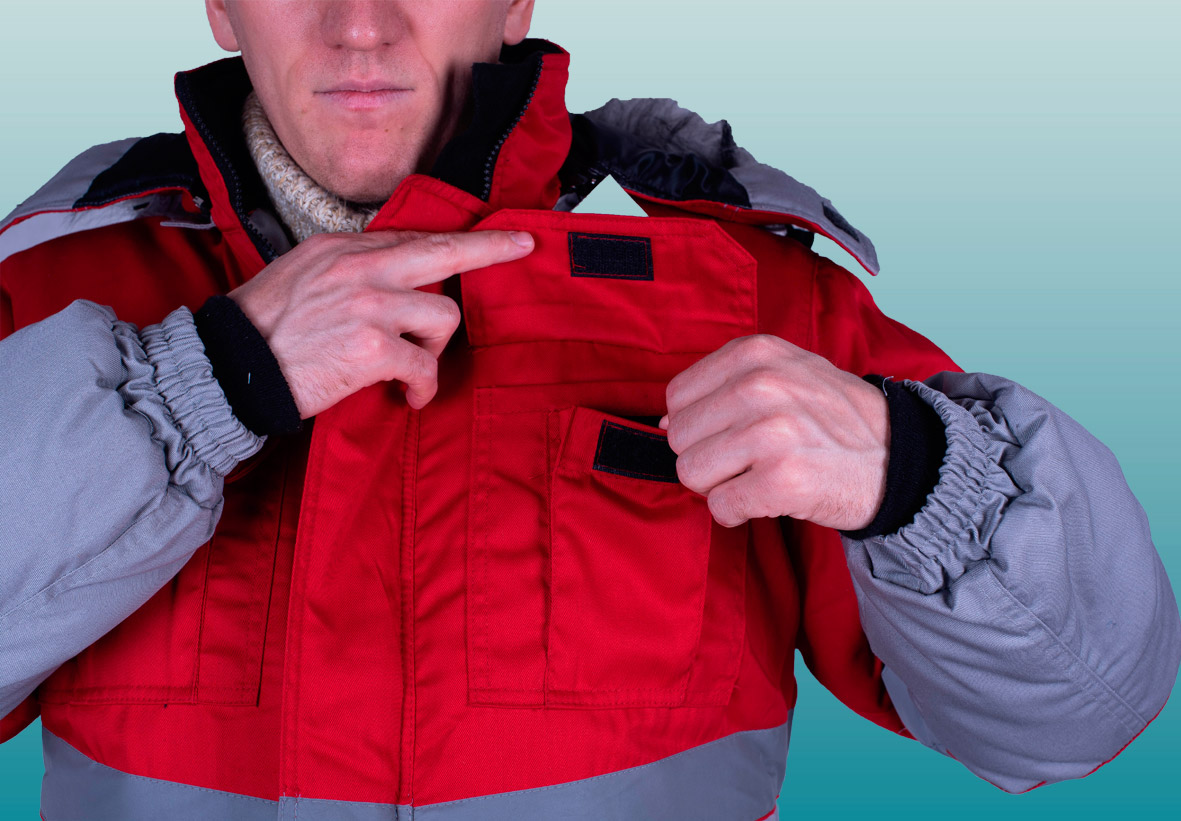 Куртка прямого силуэта, (ткань верха + ветрозащитная ткань + 2 слоя утеплителя + спандбонд + подкладка); с застежкой на 2-х замковую молнию, с ветрозащитным клапаном, застегивающимся на петли и пуговицы, воротник стойка, со съемным утепленным капюшоном. Нижние накладные карманы, которые закрываются клапанами. Верхние двойные карманы с фигурным клапаном на липучке. Спинка с кокеткой, по линии талии стягивается эластичной тесьмой. Внутренняя стойка выполнена из флиса. Съемный утепленный капюшон с мехом. пристегивается к куртке на молнию. По лицевому вырезу капюшона проходит кулиса, которая стягивается шляпной резинкой. На средней части капюшона – затяжник, который фиксируется на контактную ленту. Низ куртки с кулисой, которая стягивается шляпной резинкой и регулируется фиксаторами. На притачной утепленной подкладке с левой и правой полочки расположен нагрудный накладной карман, который фиксируется на контактную ленту и выполнен на усилителе из основной ткани верха. Рукава притачной подкладки с трикотажными напульсниками. По шву горловины спинки расположена вешалка.