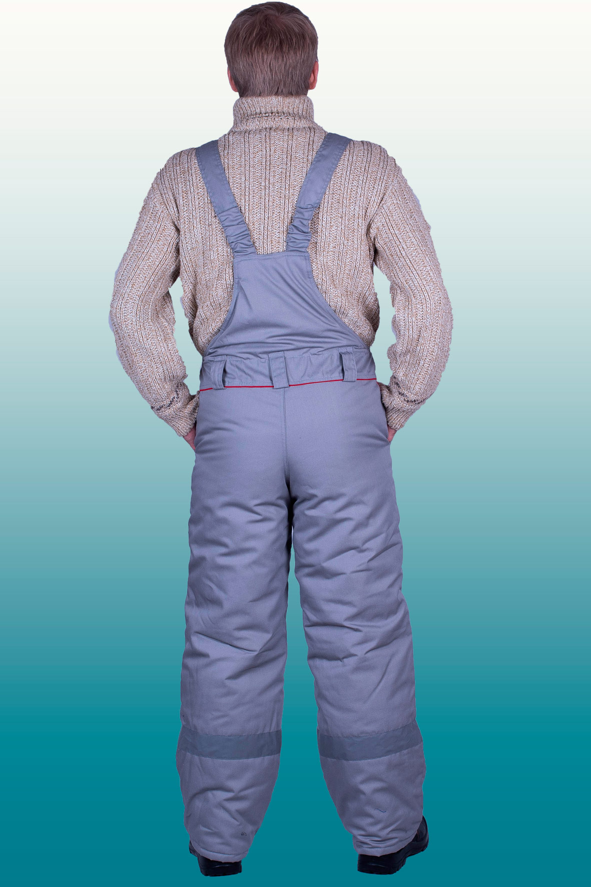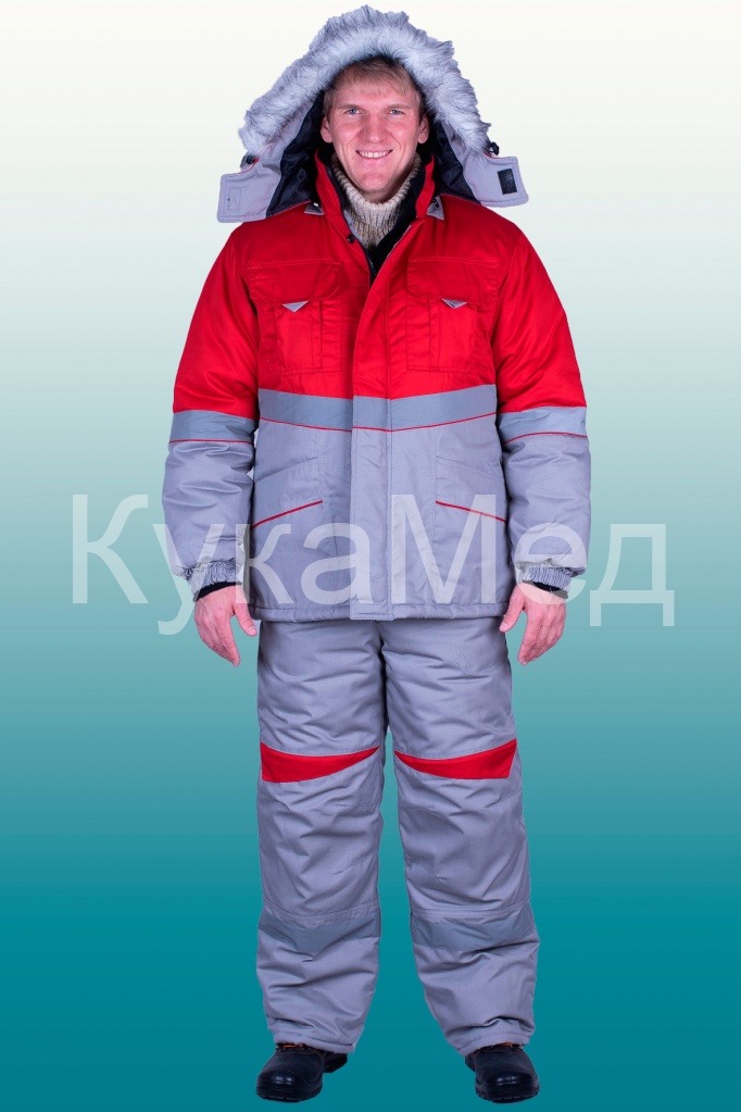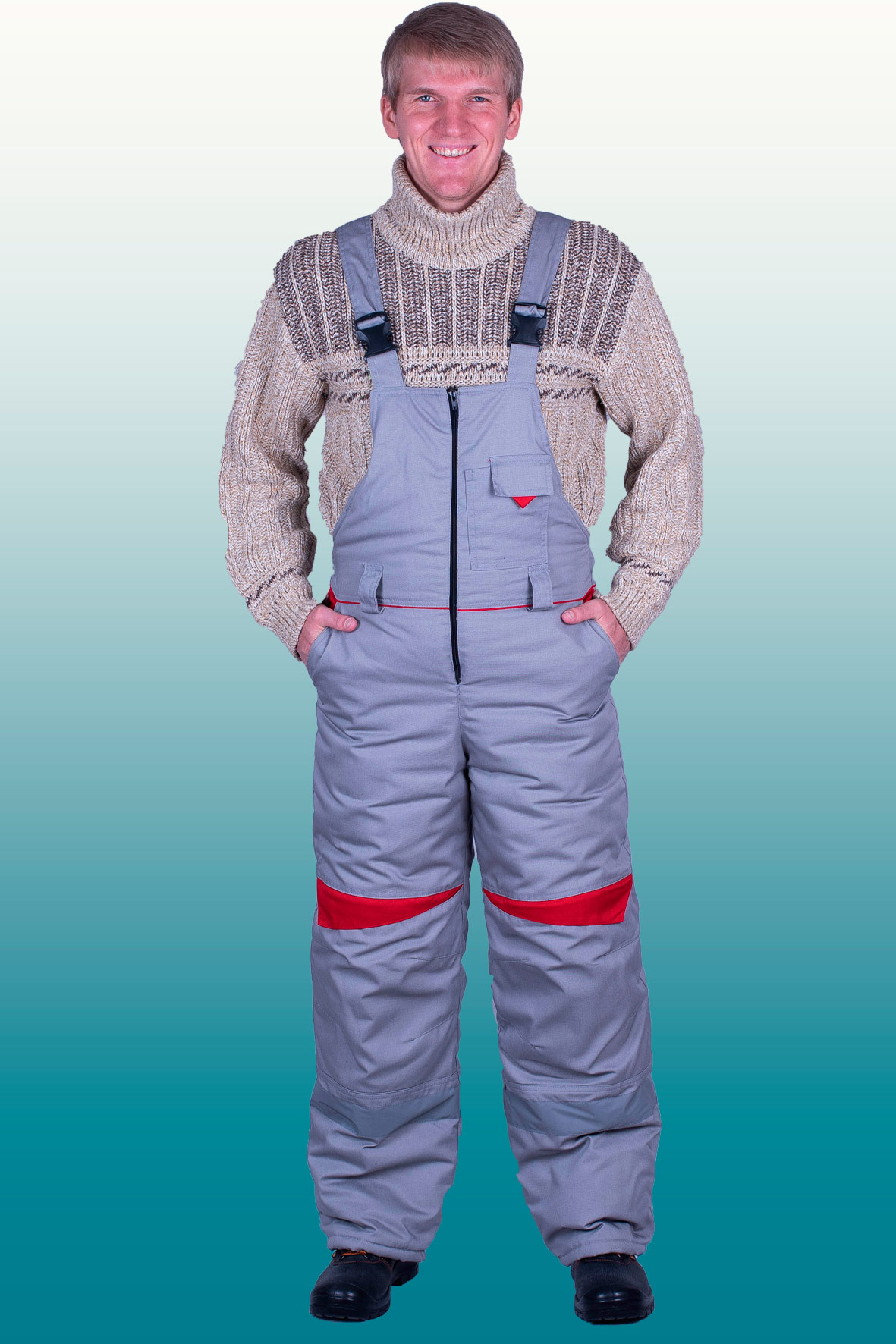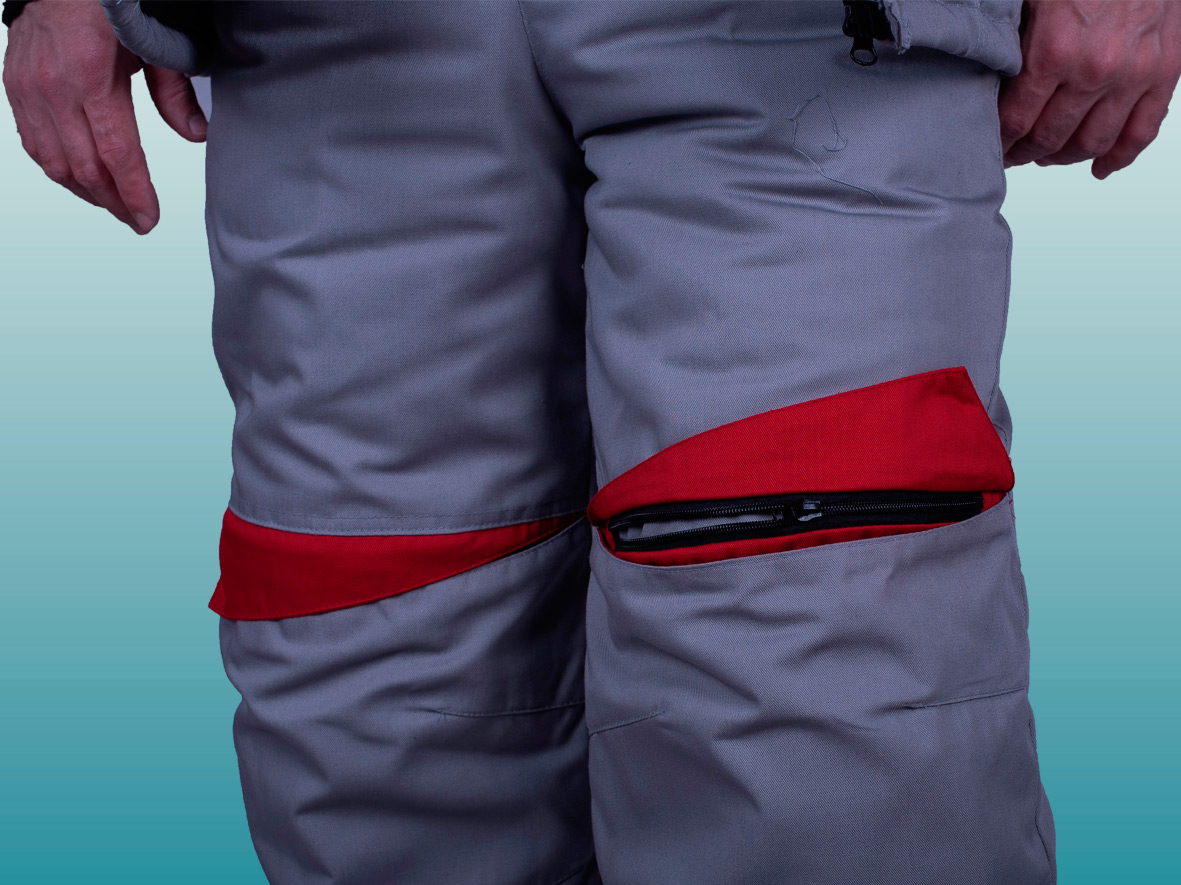 Полукомбинезон (ткань верха + ветрозащитная ткань + 1 слоя утеплителя + спандбонд + подкладка), с застежкой на двухзамковую молнию, с бретелями с втачной эластичной тесьмой, пристегивающимися на пряжки-трезубцы. Полукомбинезон выполнен из основной ткани серого цвета. Объемные наколеники с фигурным клапаном застегивающиеся на молнию. Внизу брюк полукомбинезона проходит СОП 50 мм .