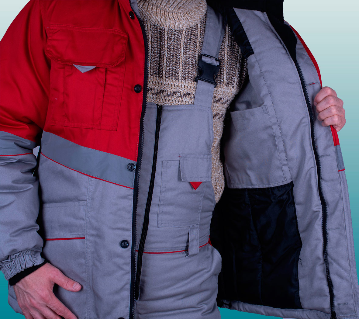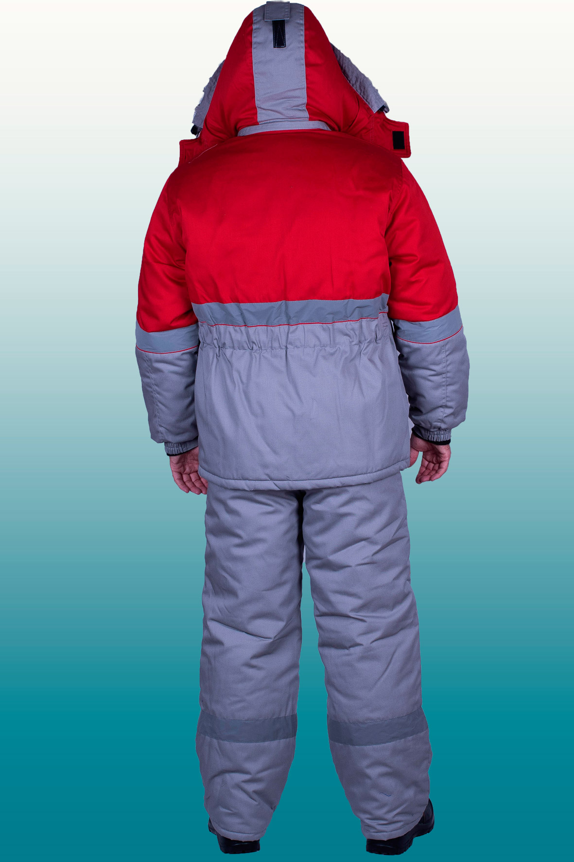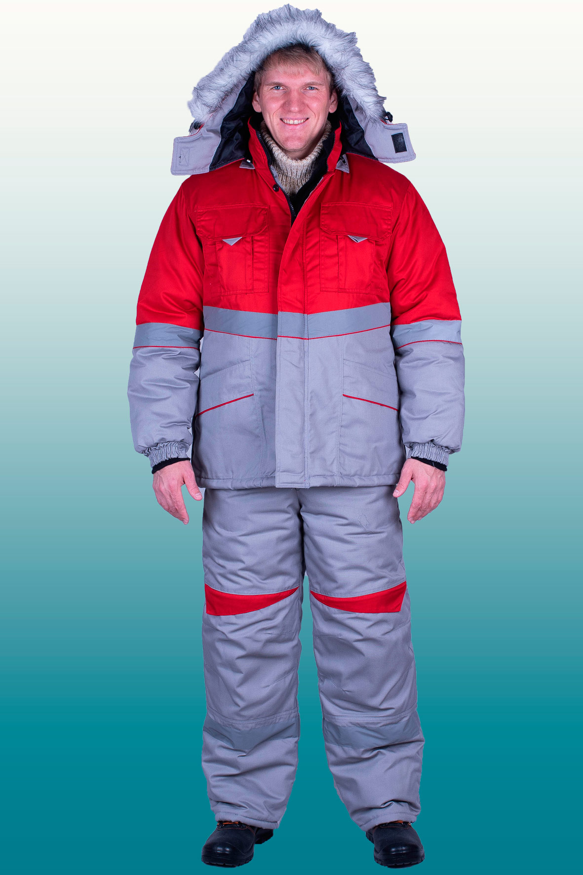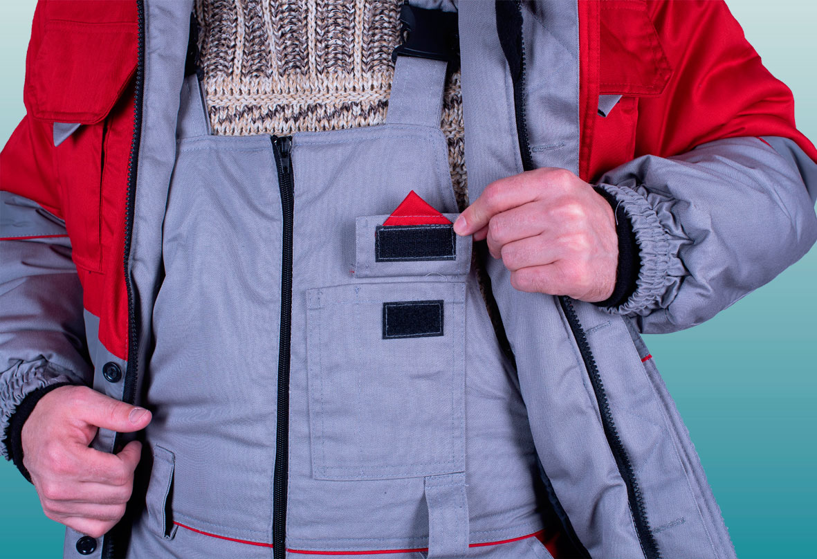 Полукомбинезон (ткань верха + ветрозащитная ткань + 1 слоя утеплителя + спандбонд + подкладка), с застежкой на двухзамковую молнию, с бретелями с втачной эластичной тесьмой, пристегивающимися на пряжки-трезубцы. Полукомбинезон выполнен из основной ткани серого цвета. Объемные наколеники с фигурным клапаном застегивающиеся на молнию. Внизу брюк полукомбинезона проходит СОП 50 мм .