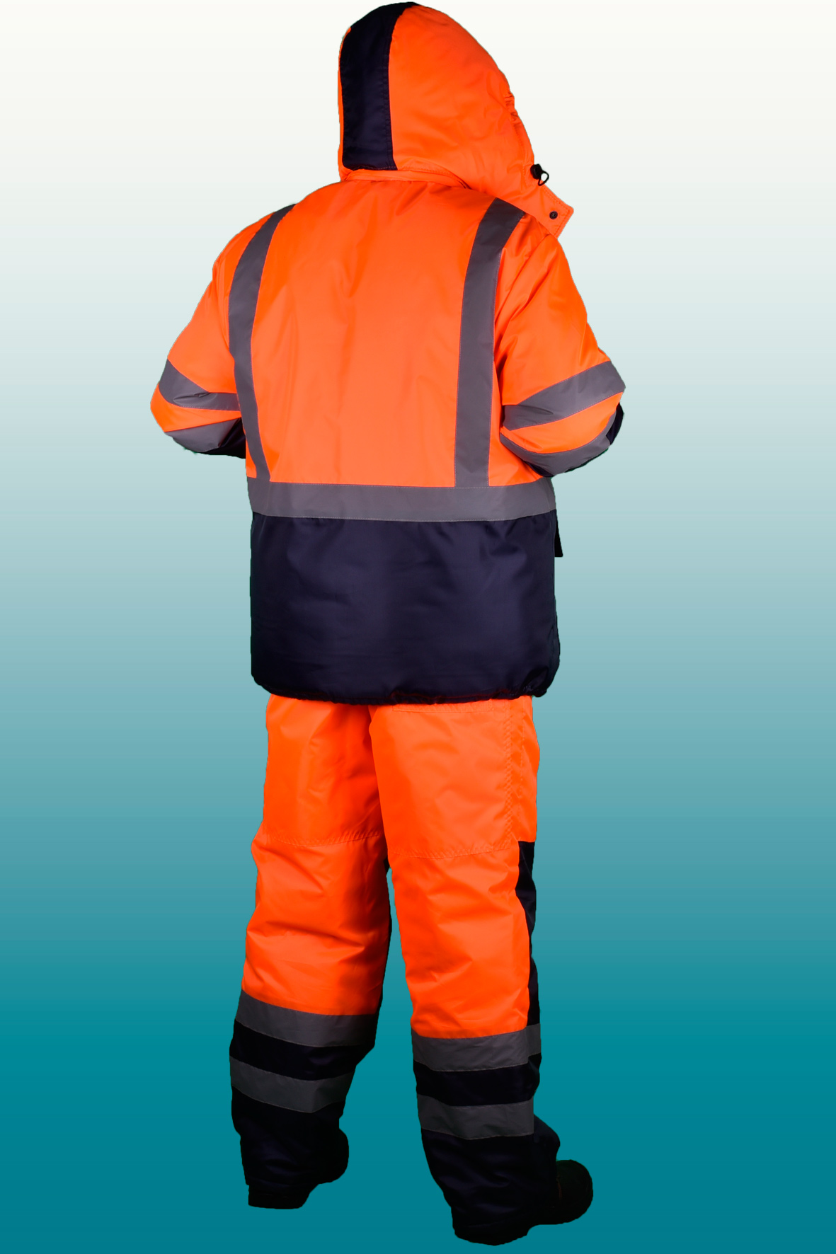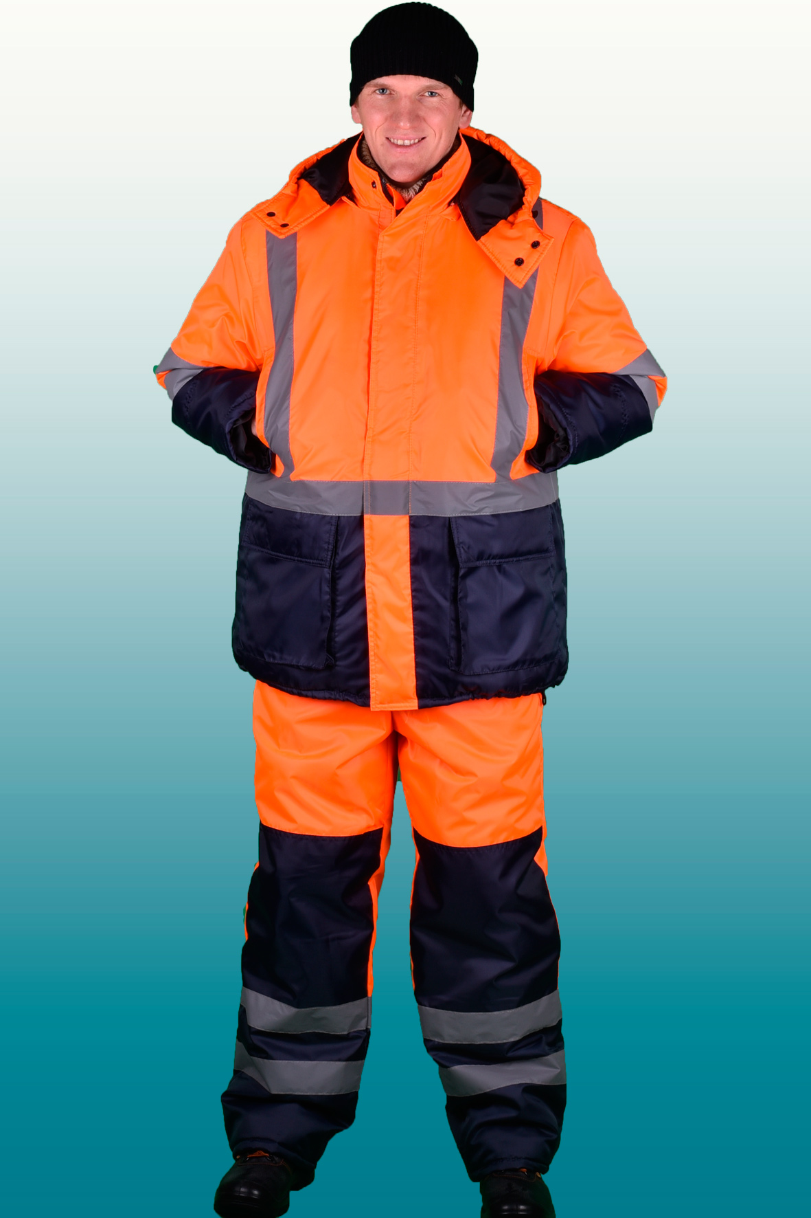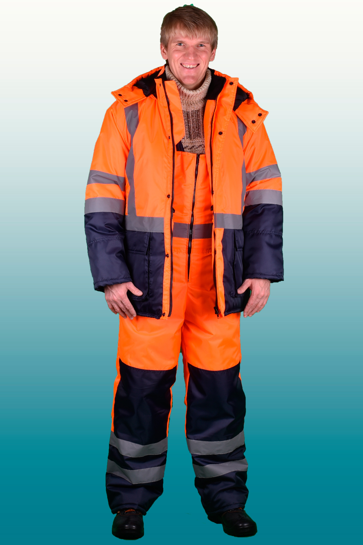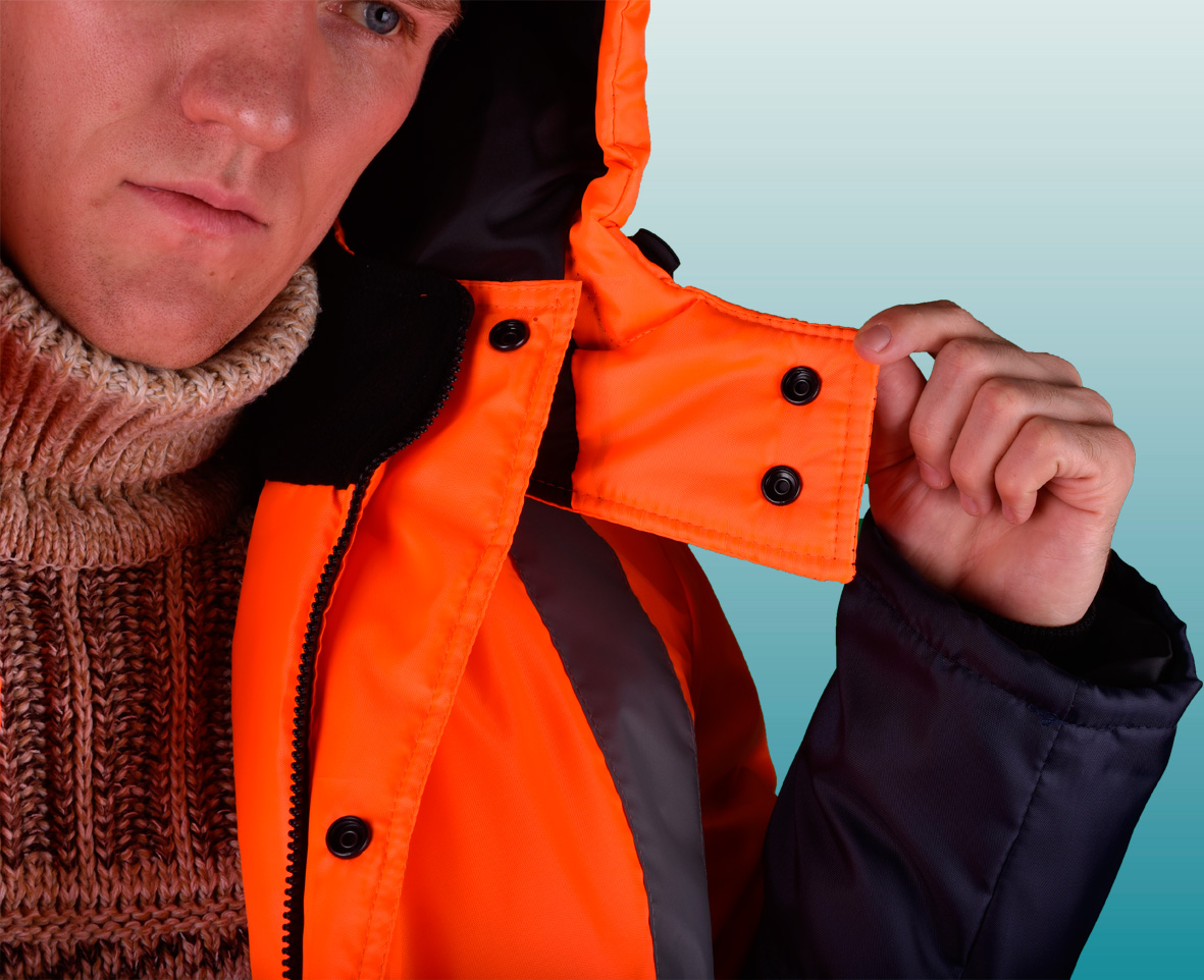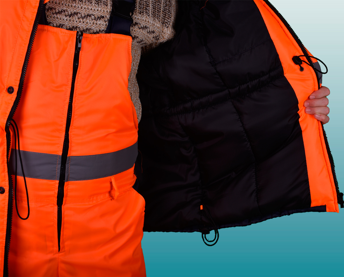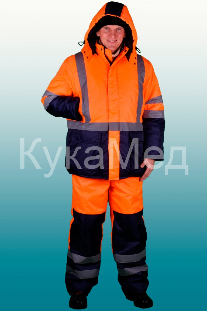 Костюм состоит из куртки и полукомбинезона. Куртка с застежкой на двухзамковую молнию и ветрозащитным клапаном застегивающимся на кнопки с двумя нагрудными прорезными и двумя боковыми накладными полуобьемными карманами с утепленными клапанами. Рукава с трикотажным напульсником. Регулировка по талии с помощью кулисы, регулировка объема низа куртки с помощи кулисы. Воротник стойка на флисе и утеплённый капюшон, регулирующийся по объему. Полукомбинезон с застежкой на двухзамковую молнию, внутрение теплые карманы.. Дополнительная накладка из основной ткани в области задней части полукомбенизона.Задний накладной карман. СОП по талии. В области коленей - усилительные накладки. Капюшон пристегивается на молнию. Яркая сигнальная ткань оранжевого цвета в сочетании со светоотражающими полосами обеспечивают высокий уровень безопасности проведения дорожных работ.