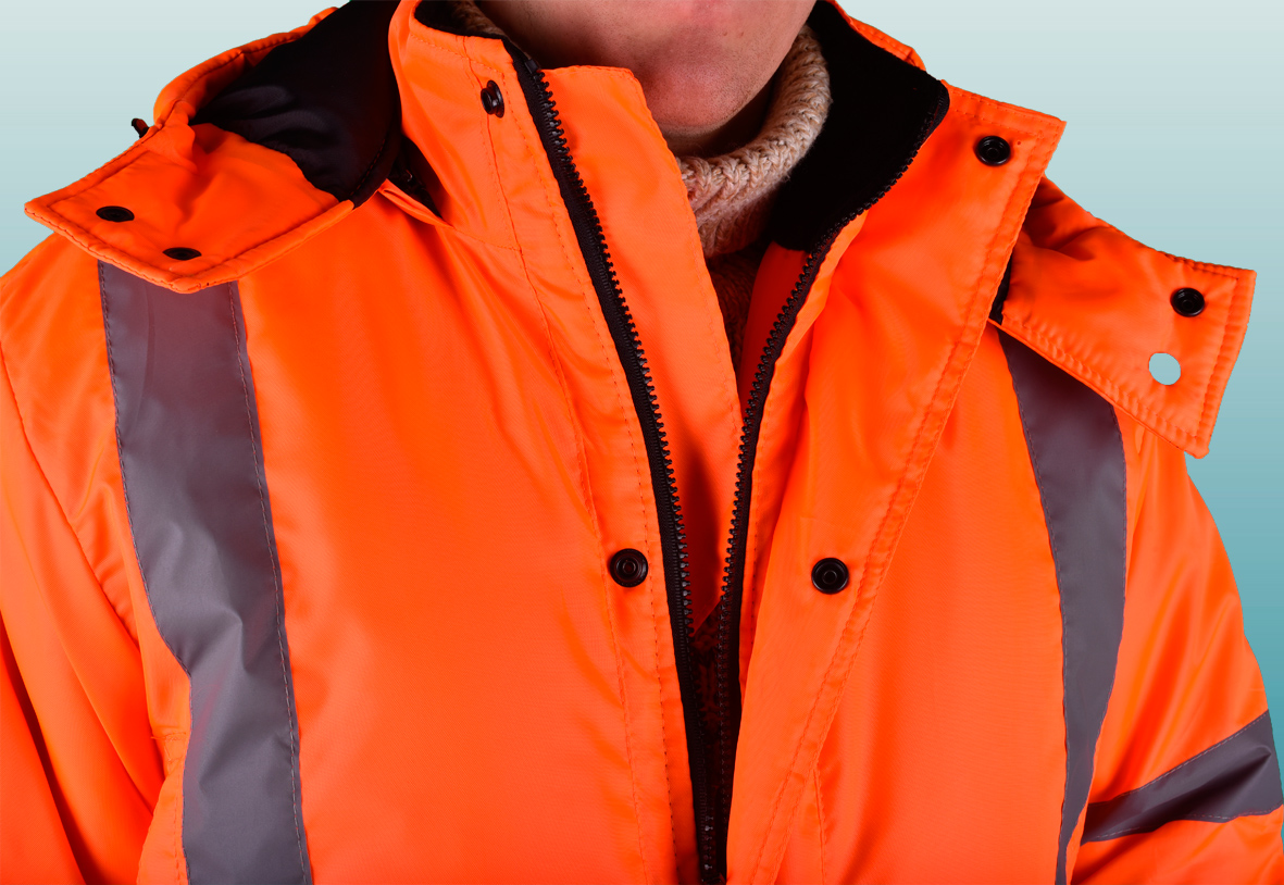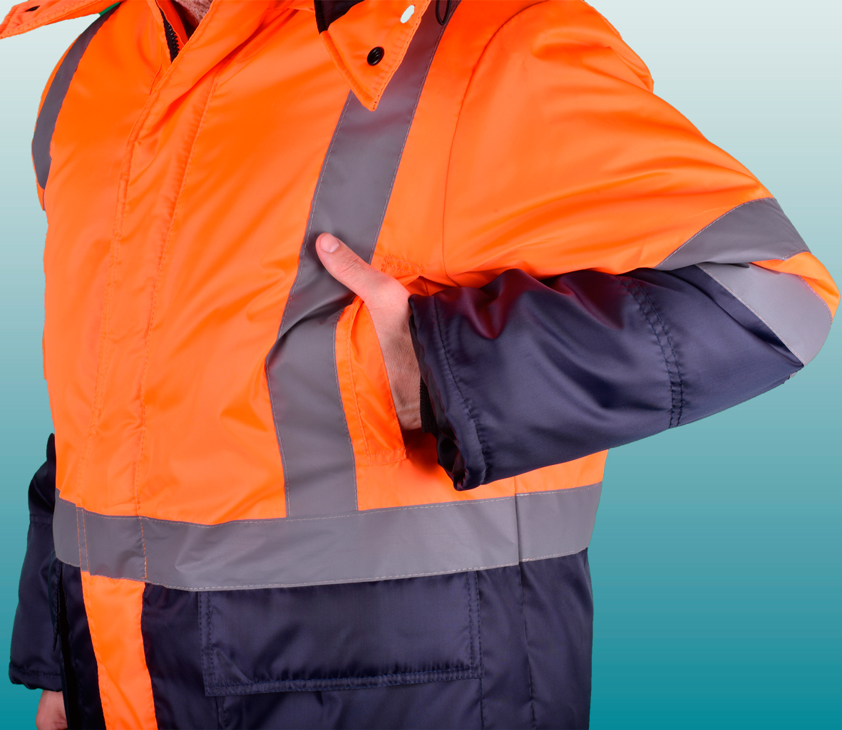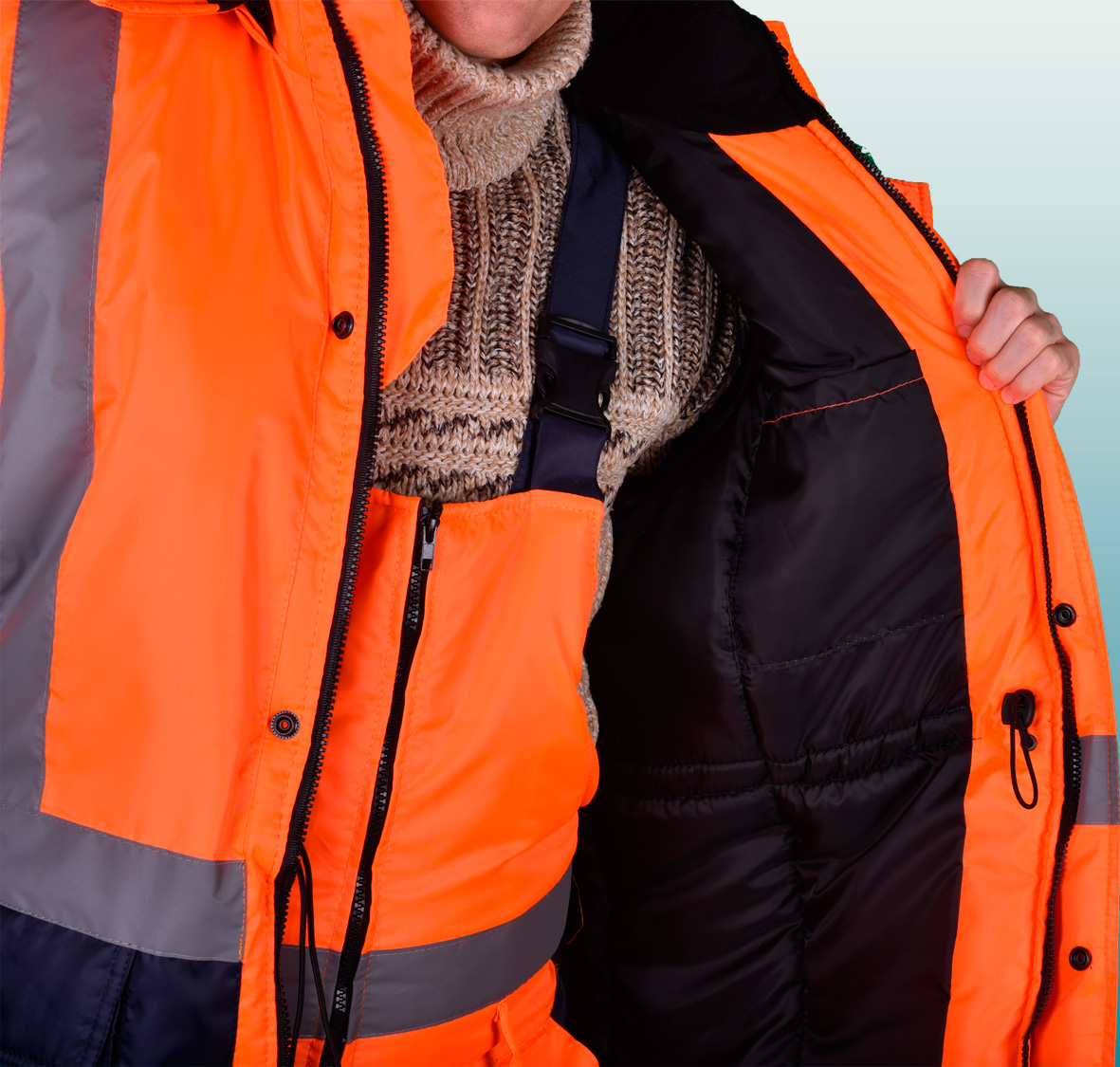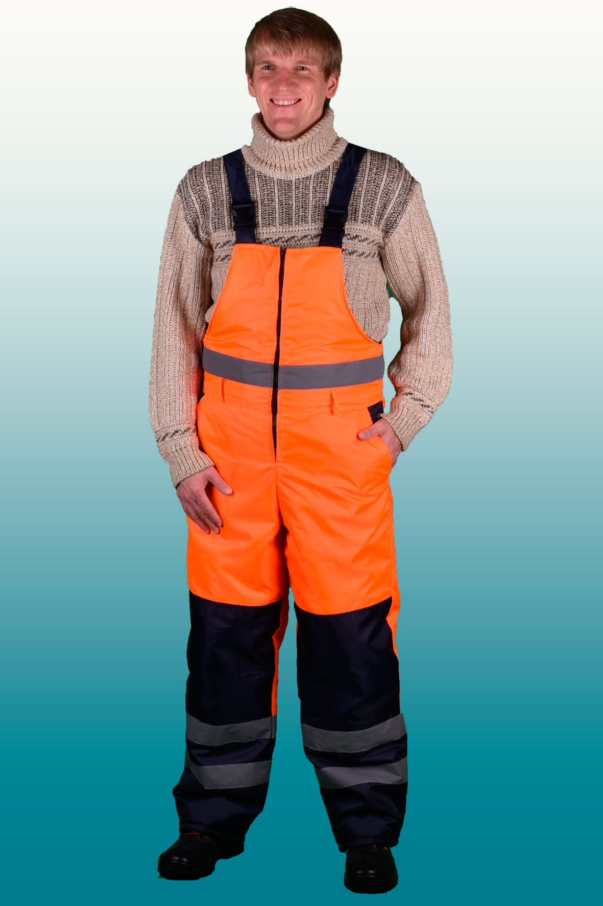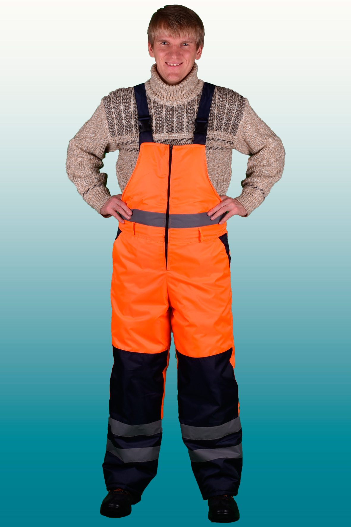 Костюм состоит из куртки и полукомбинезона. Куртка с застежкой на двухзамковую молнию и ветрозащитным клапаном застегивающимся на кнопки с двумя нагрудными прорезными и двумя боковыми накладными полуобьемными карманами с утепленными клапанами. Рукава с трикотажным напульсником. Регулировка по талии с помощью кулисы, регулировка объема низа куртки с помощи кулисы. Воротник стойка на флисе и утеплённый капюшон, регулирующийся по объему. Полукомбинезон с застежкой на двухзамковую молнию, внутрение теплые карманы.. Дополнительная накладка из основной ткани в области задней части полукомбенизона.Задний накладной карман. СОП по талии. В области коленей - усилительные накладки. Капюшон пристегивается на молнию. Яркая сигнальная ткань оранжевого цвета в сочетании со светоотражающими полосами обеспечивают высокий уровень безопасности проведения дорожных работ.