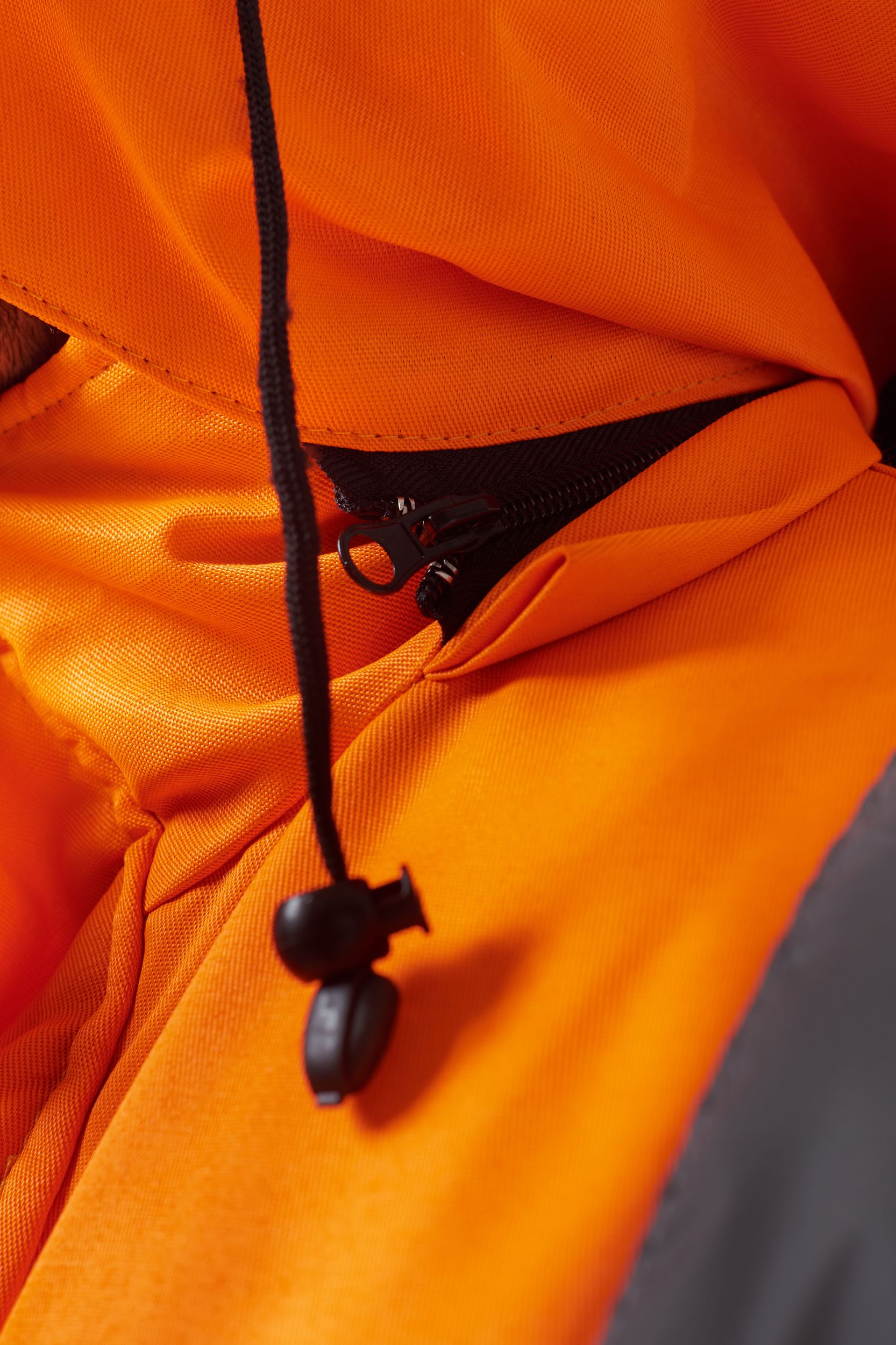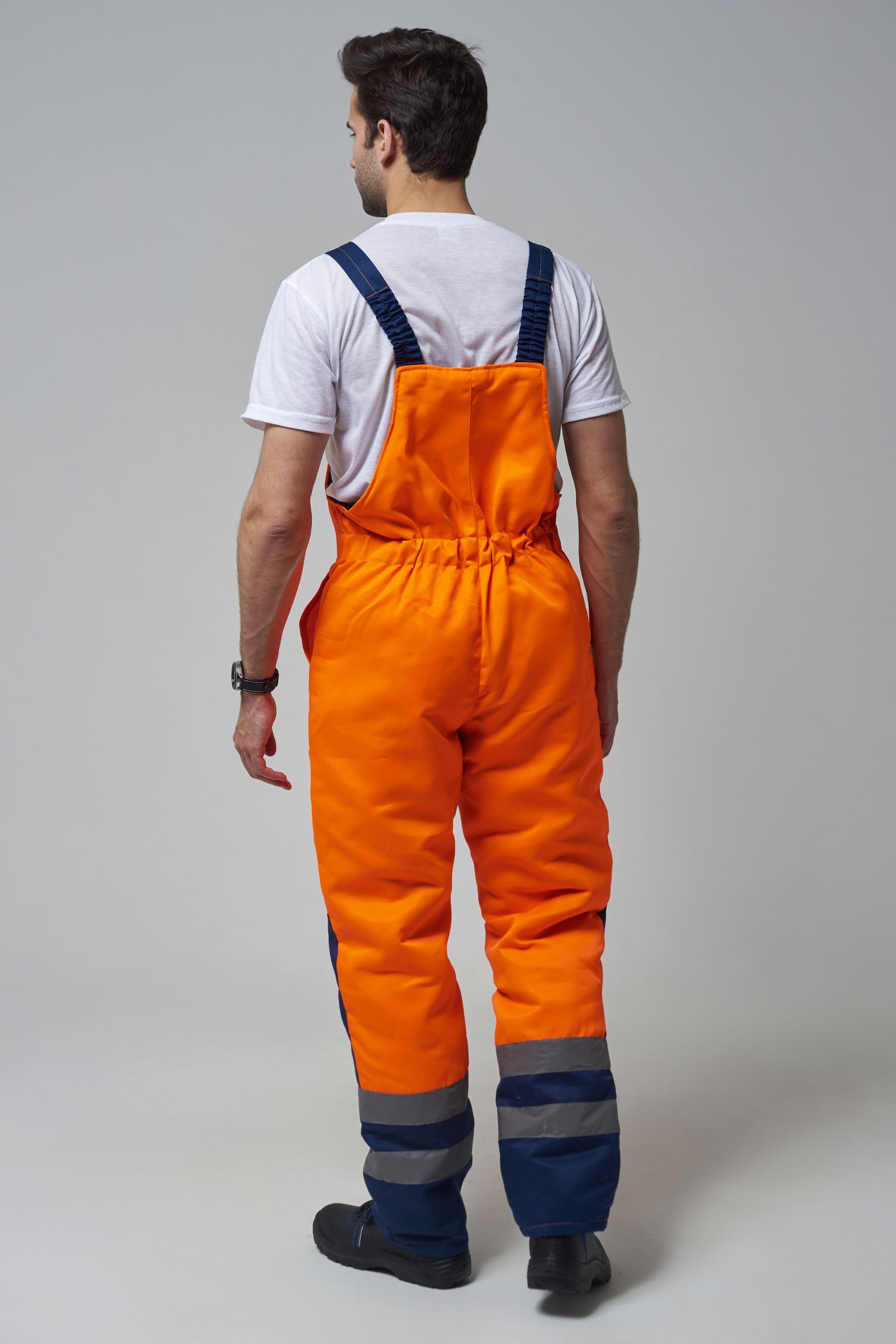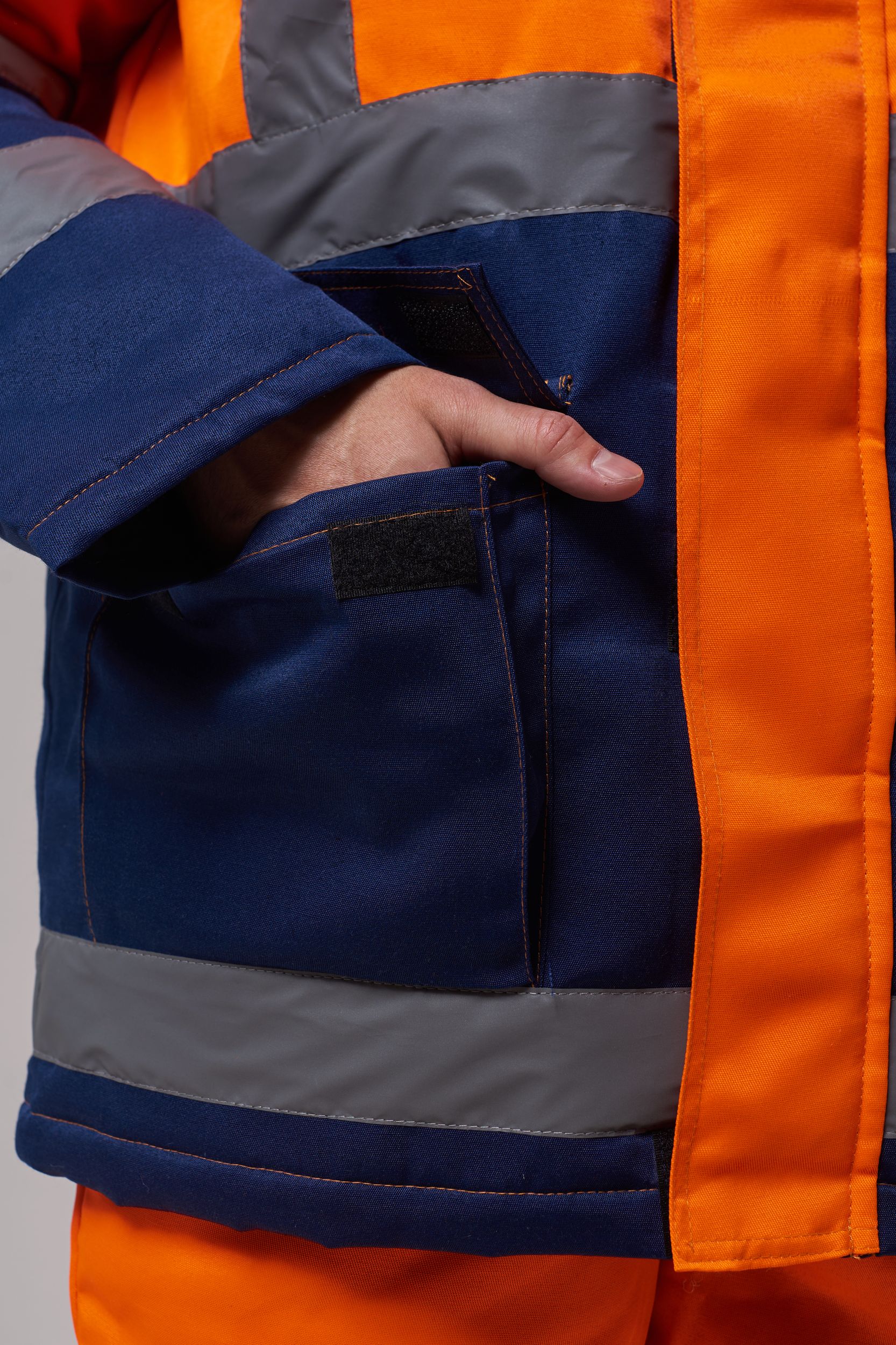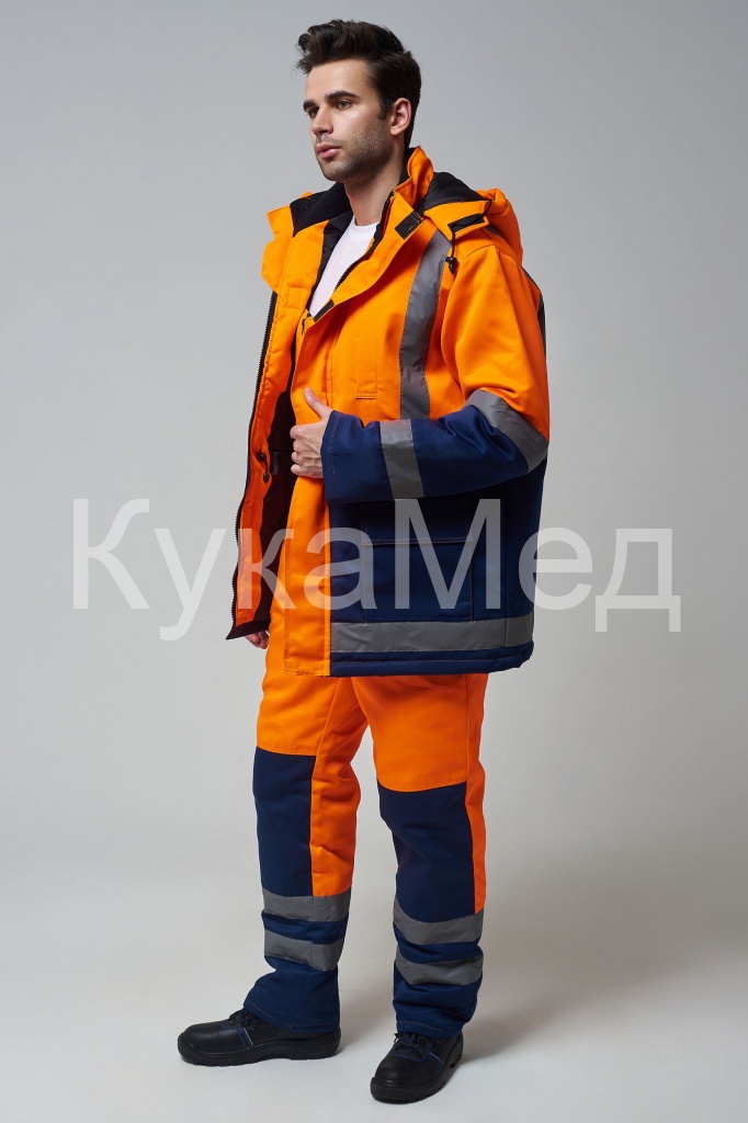 Костюм состоит из куртки и полукомбинезона. Куртка с застежкой на молнию и ветрозащитным клапаном застегивающимся на контактную ленту с нагрудным прорезным карманом и двумя боковыми накладными карманами с клапанами. Регулировка по талии с помощью кулисы воротник стойка с флисовой подкладкой и утеплённый капюшон, регулирующийся по объему. Полукомбинезон с застежкой на молнию. Рукава с внутренними трикотажными манжетами. В области коленей - усилительные накладки. Яркая сигнальная ткань оранжевого цвета в сочетании со светоотражающими полосами обеспечивают высокий уровень безопасности проведения дорожных работ.