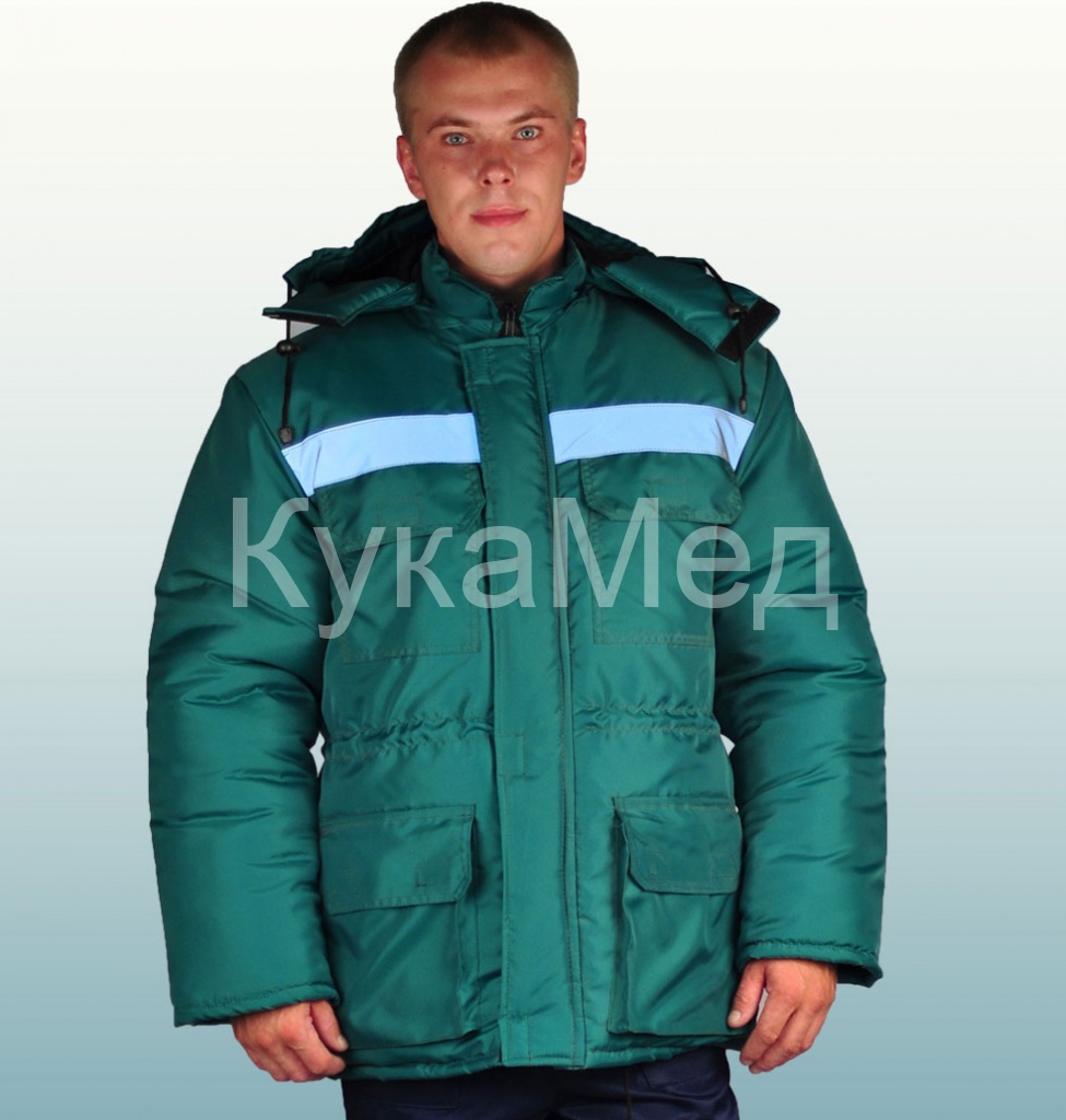 Куртка комбинированная на молний с супатной застежкой на липупчке, отстегивающимся капюшоном, накладными объёмными боковыми карманами, в обласи пояса внутрений шнурок.