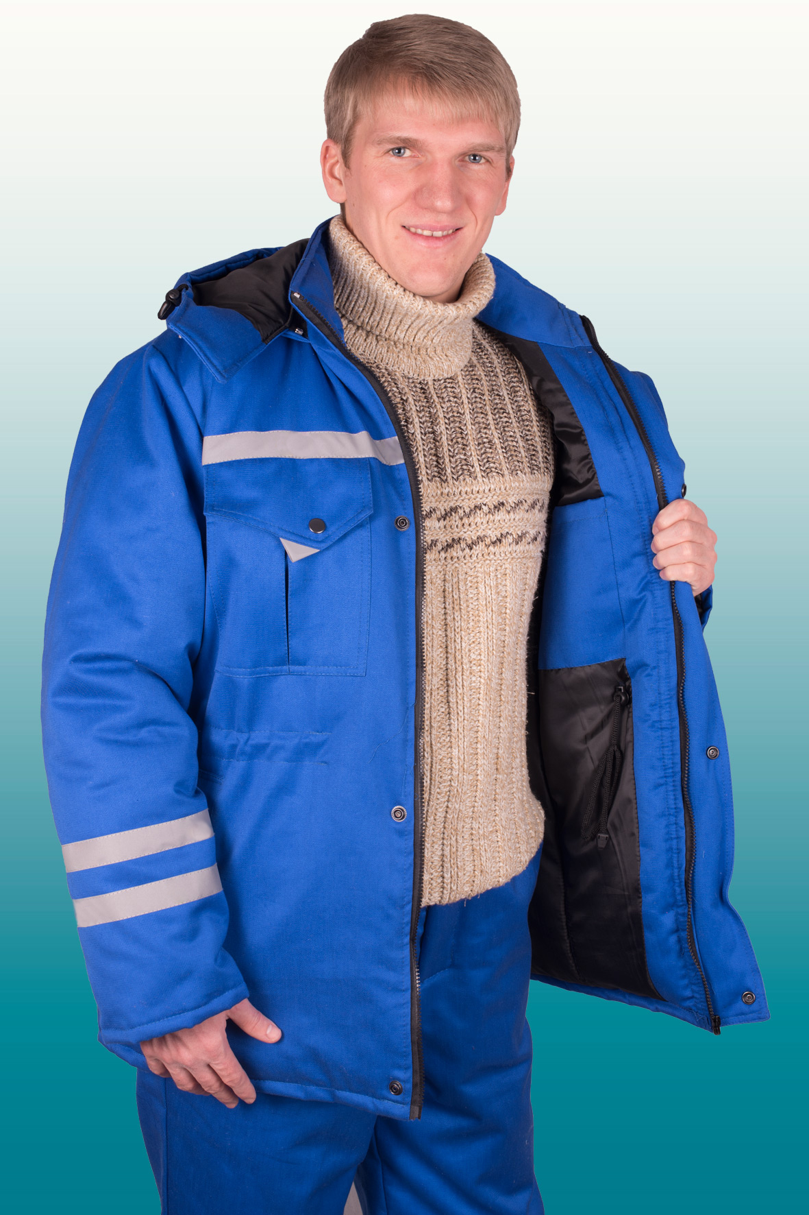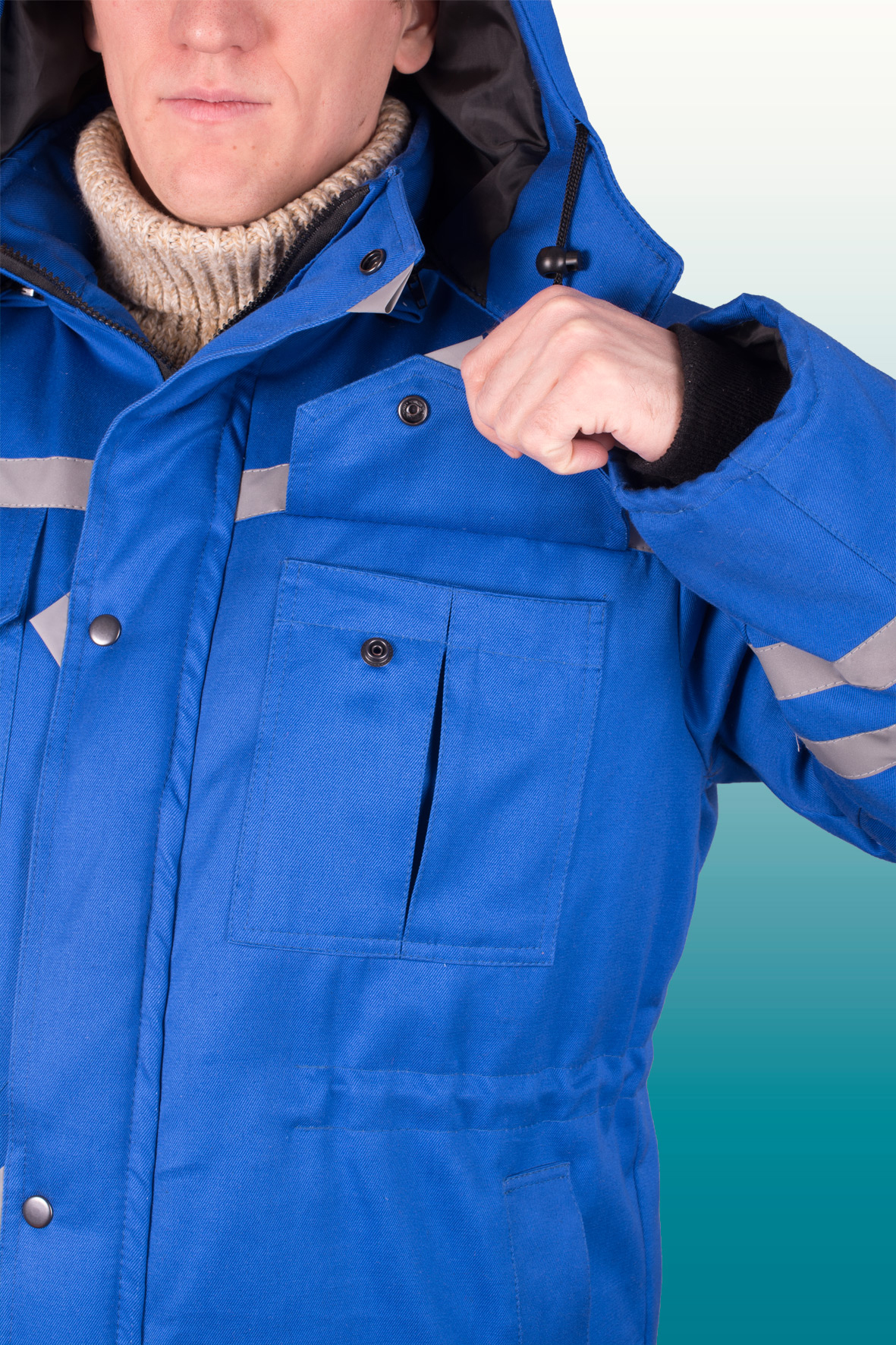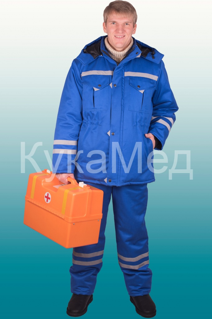 Куртка комбинированная со световозвращающими полосами 03 на кокетке спереди и с зади, две световозвращающие полосы 03 на рукавах, застежка на молнию,с ветрозащитной планкой на кнопки, кулисой на уровне талии, воротник стойка, верхние фигурные накладные карманы с клапаном на кнопке, нижние прорезные карманы в рамку,трикотажными напульсниками.