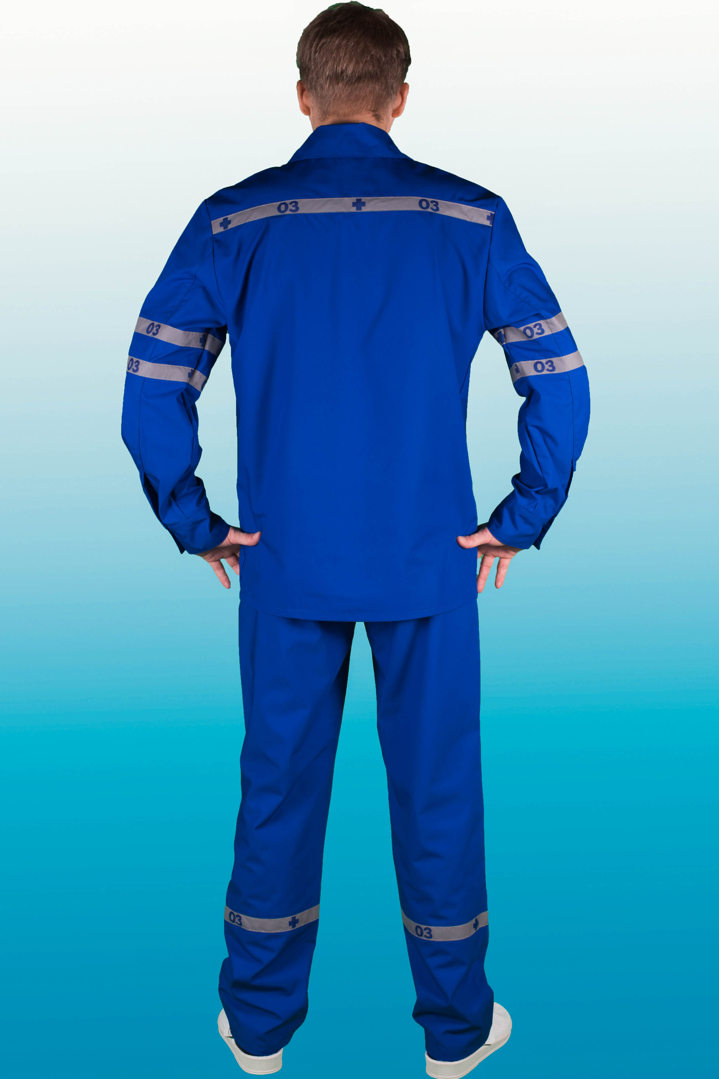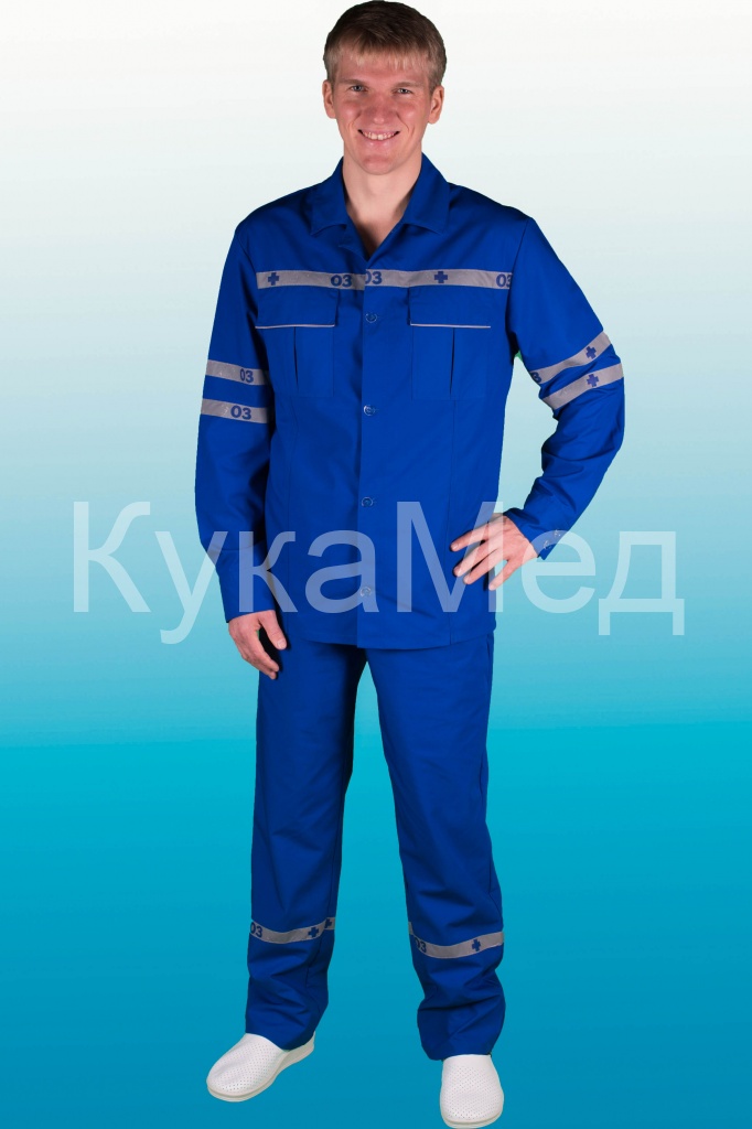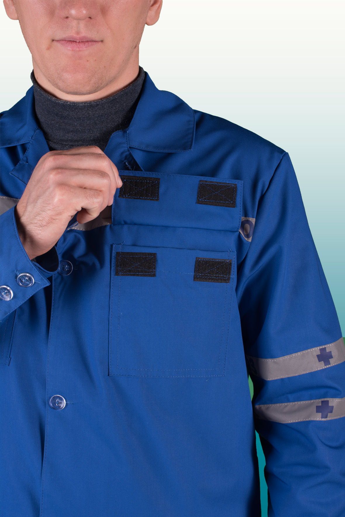 Мужской медицинский костюм с длинным рукавом на пуговицах. Воротик отложной. Два нагрудных кармана с клапанами на липучке. СОП-25 мм