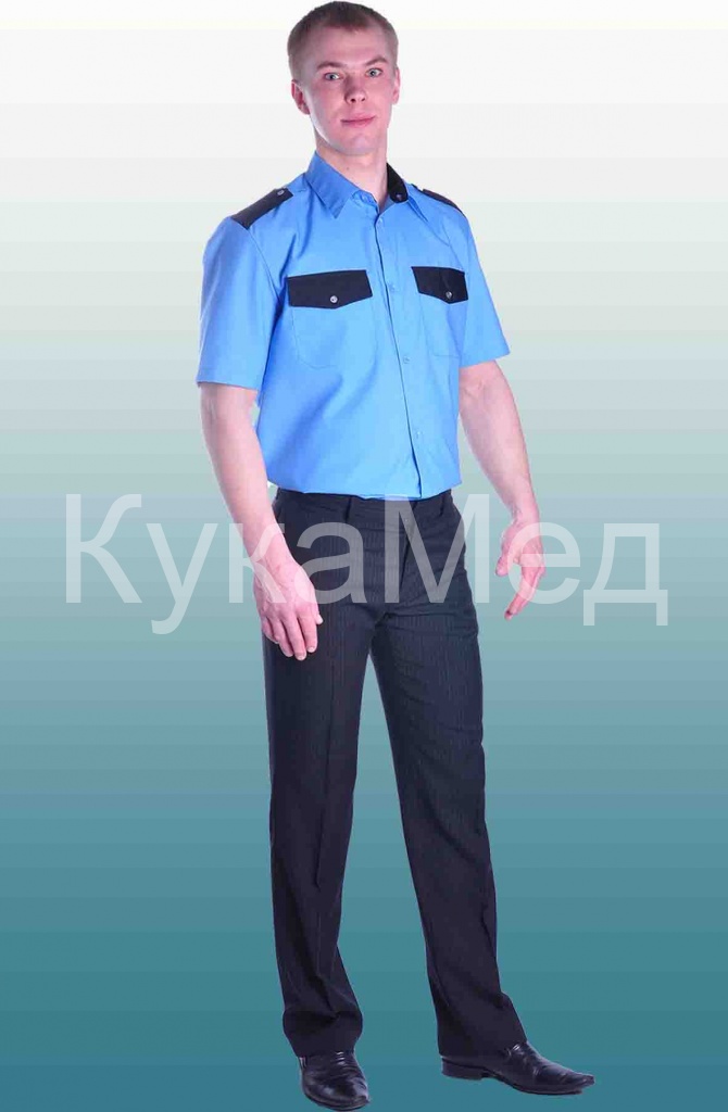 Описание: Мужская рубашка охранника с коротким руквом на пуговицах. Стойка на воротнике, погоны и на полочке клапаны на карманах из отделочной ткани размеры по вороту с 37 по 48