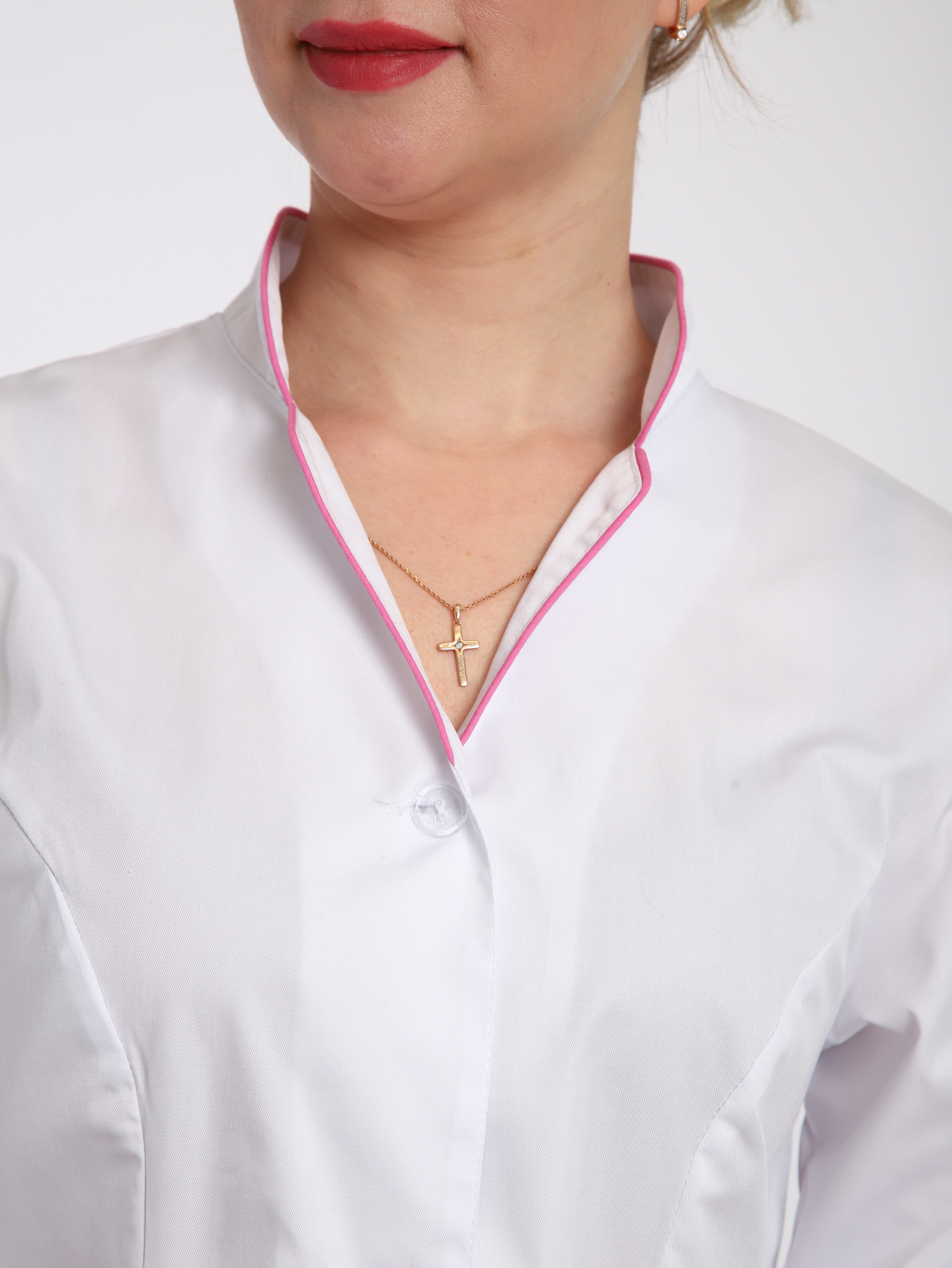 Описание: Халат укороченный полуприлегающего силуэта, рукав 3/4, на пуговицах отделочный кант по воротнику стойки и рукавам, в боковых швах разрезы.