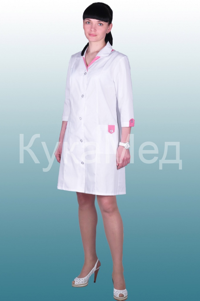 Описание: Халат укороченный полуприлегающего силуэта, рукав 3/4, на пуговицах. Паты из отделочной ткани на рукавах и карманах. Отделка под воротником.