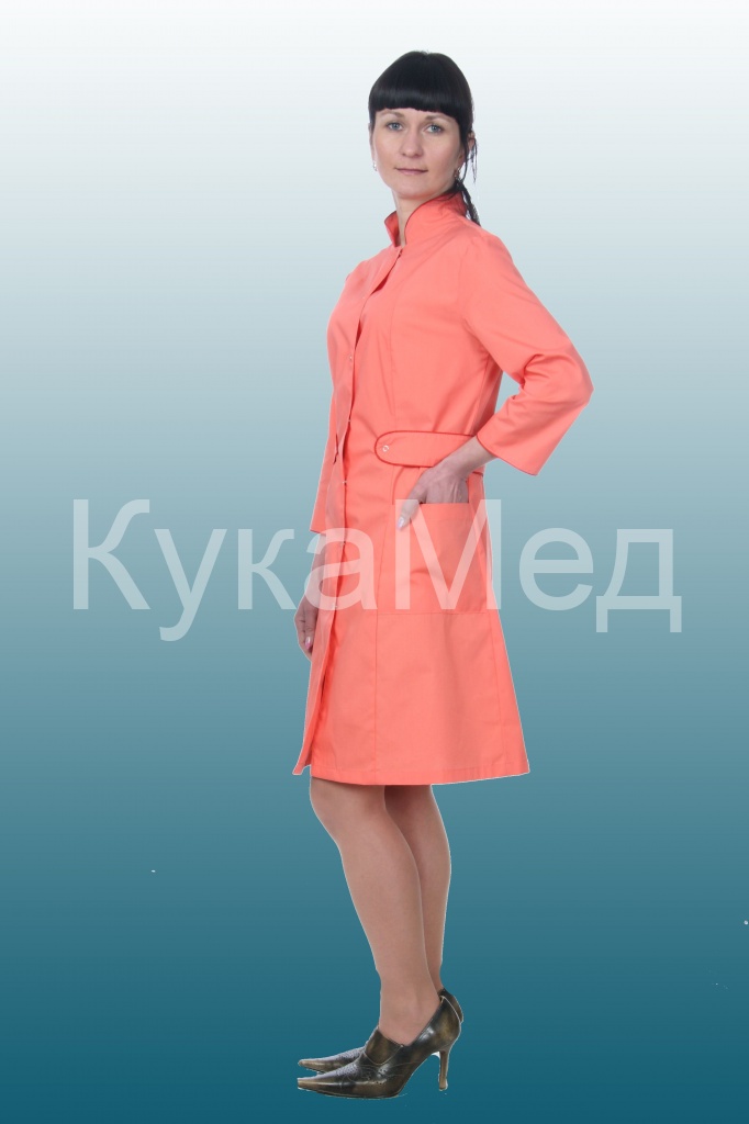 Описание: Халат полуприлегающего силуэта, с вертикальными рельефами на полочке и спинке, на кнопках. Воротник-стойка, пояс, 2 кармана и длинные рукава отделаны кантом. Пояс, выходящий из рельефов спинки, застёгивается спереди на кнопку.