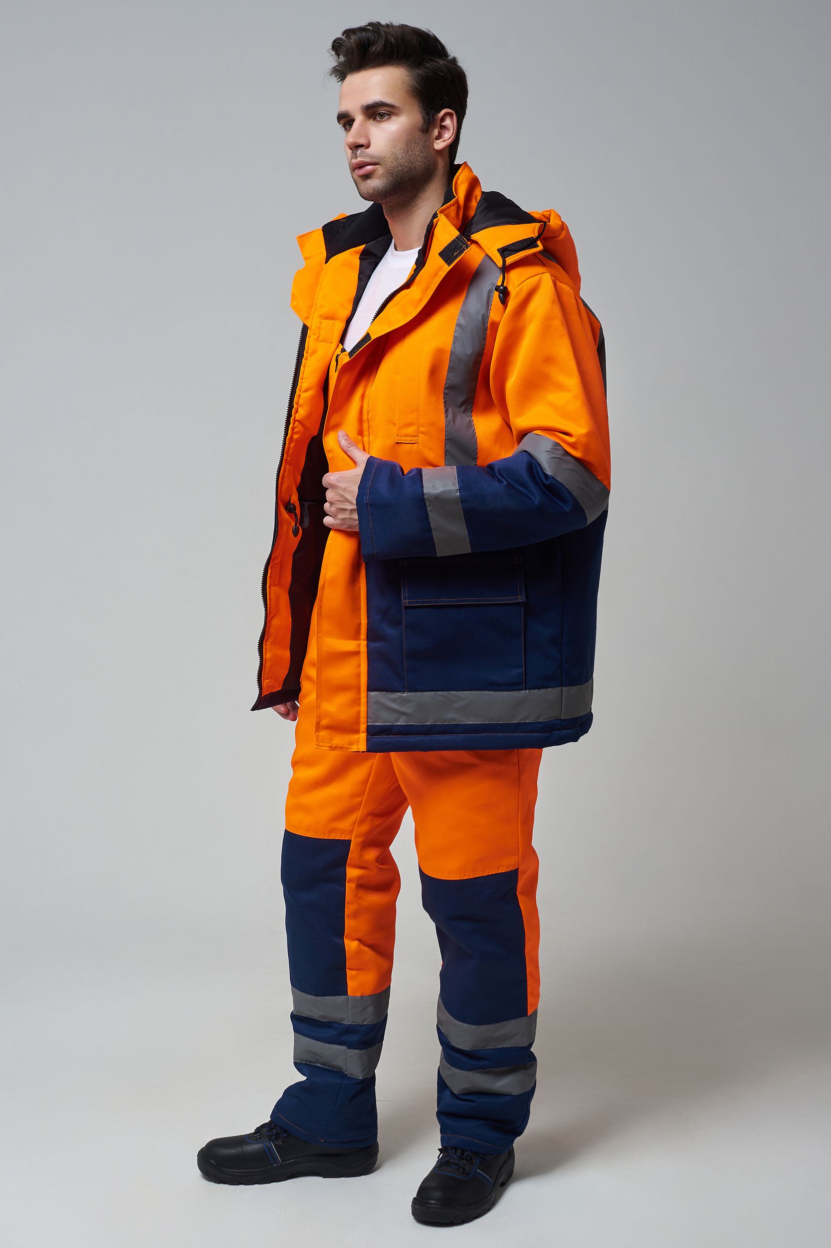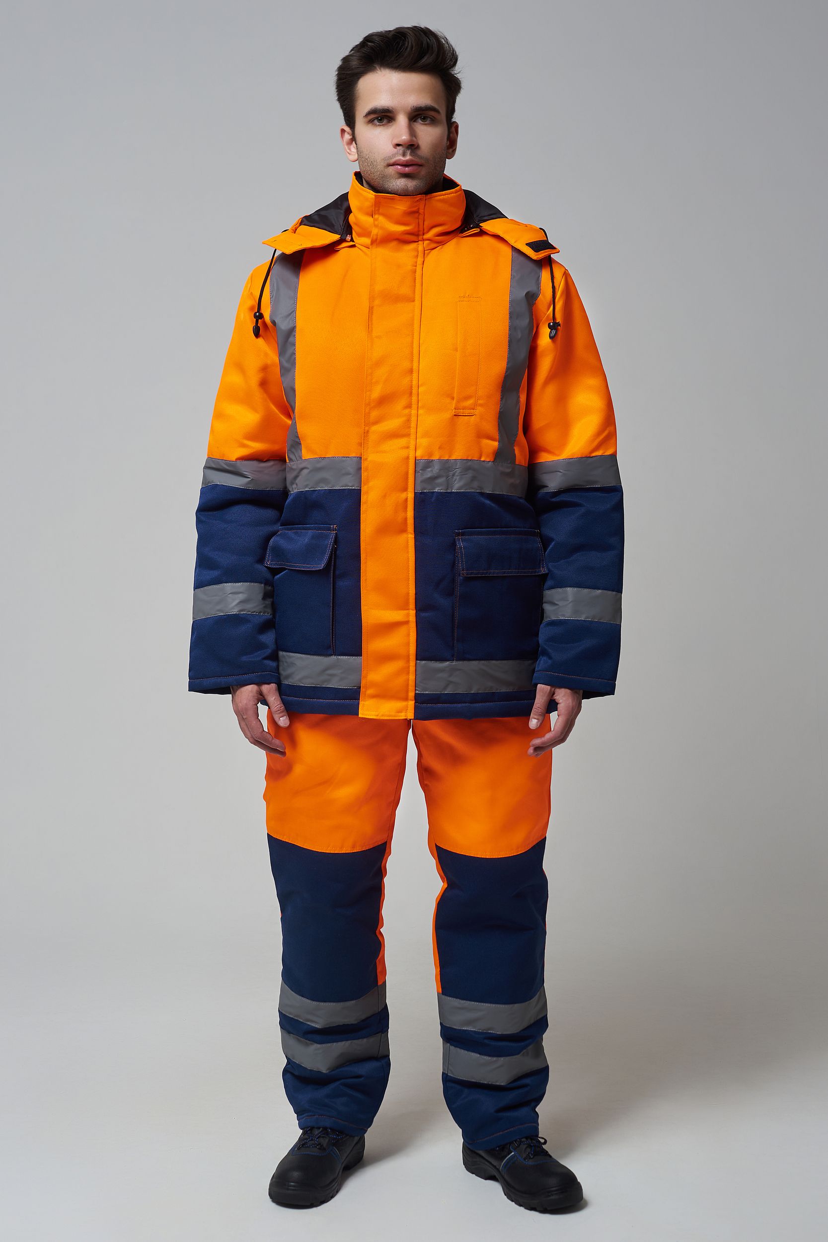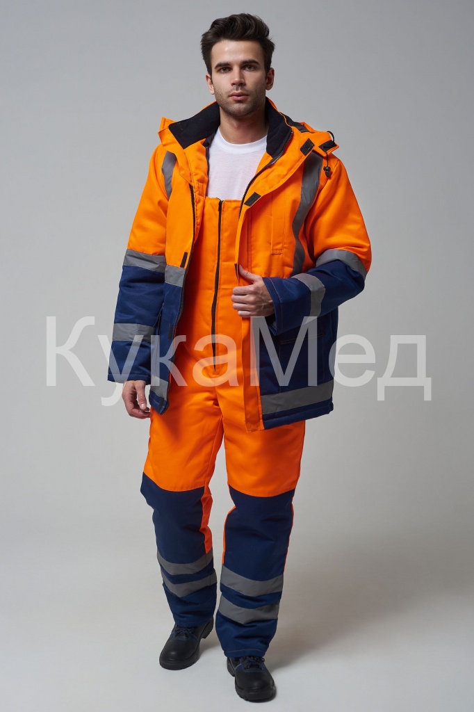 Костюм состоит из куртки и полукомбинезона. Куртка с застежкой на молнию и ветрозащитным клапаном застегивающимся на контактную ленту с нагрудным прорезным карманом и двумя боковыми накладными карманами с клапанами. Регулировка по талии с помощью кулисы воротник стойка с флисовой подкладкой и утеплённый капюшон, регулирующийся по объему. Полукомбинезон с застежкой на молнию. Рукава с внутренними трикотажными манжетами. В области коленей - усилительные накладки. Яркая сигнальная ткань оранжевого цвета в сочетании со светоотражающими полосами обеспечивают высокий уровень безопасности проведения дорожных работ.