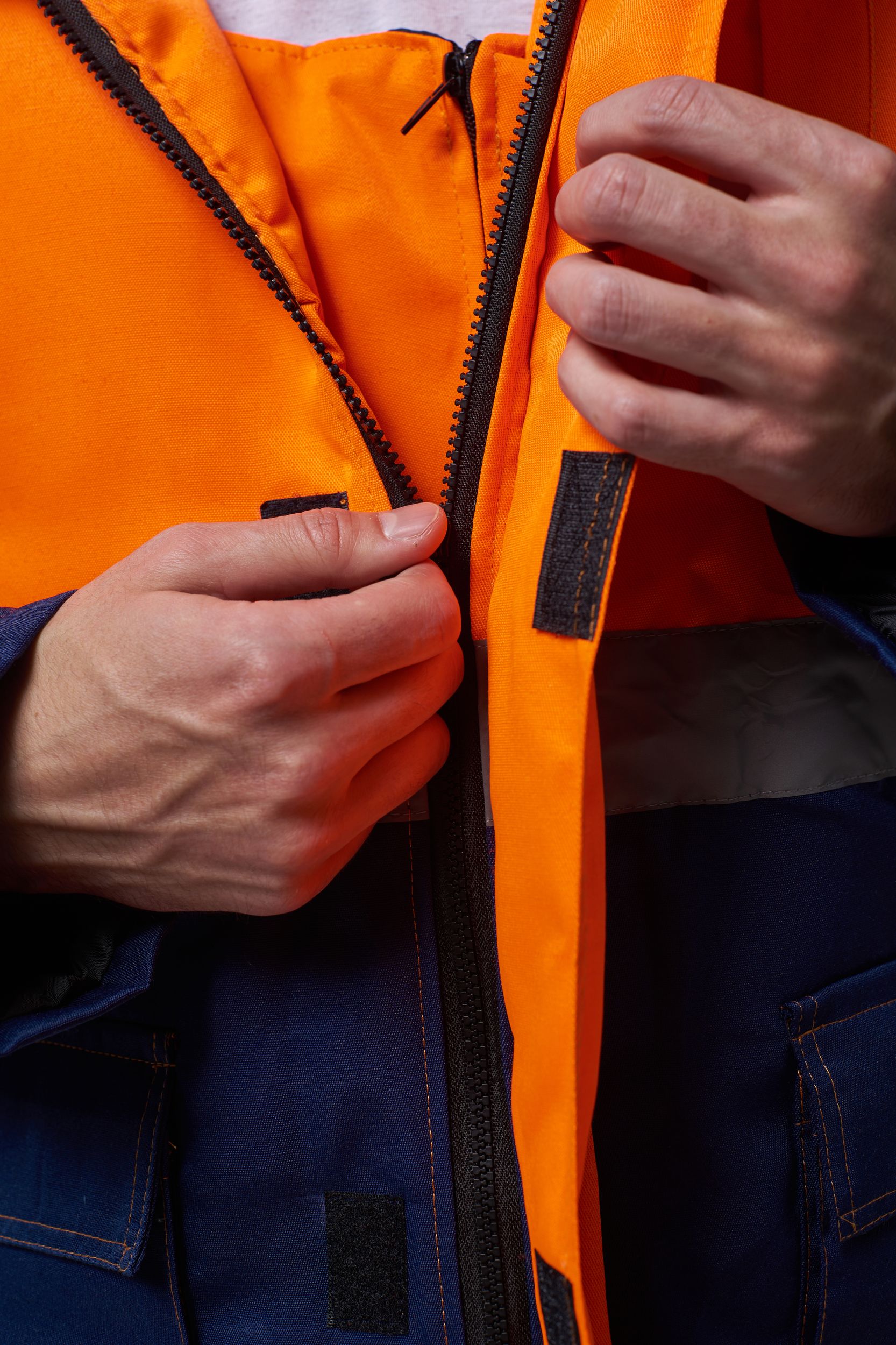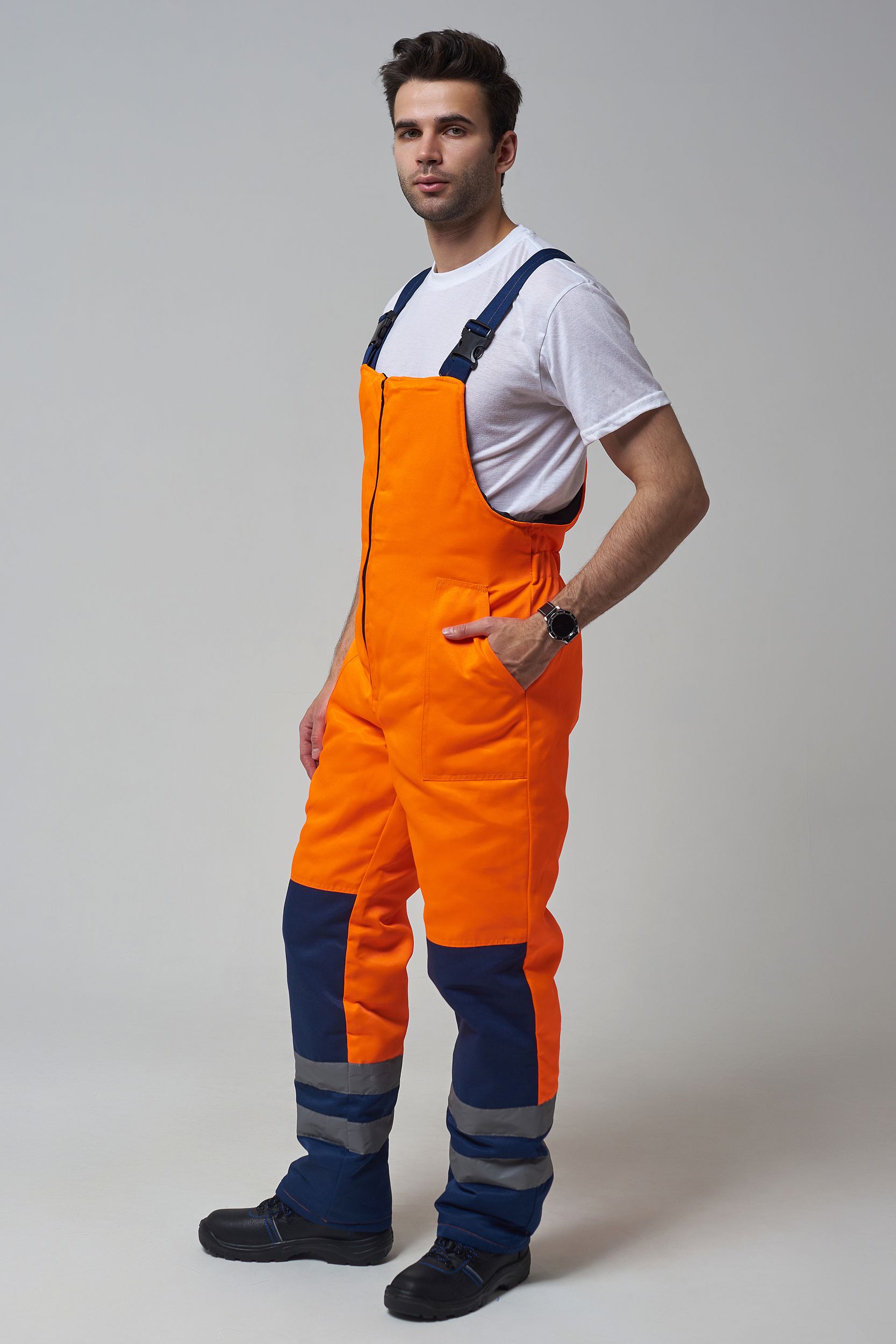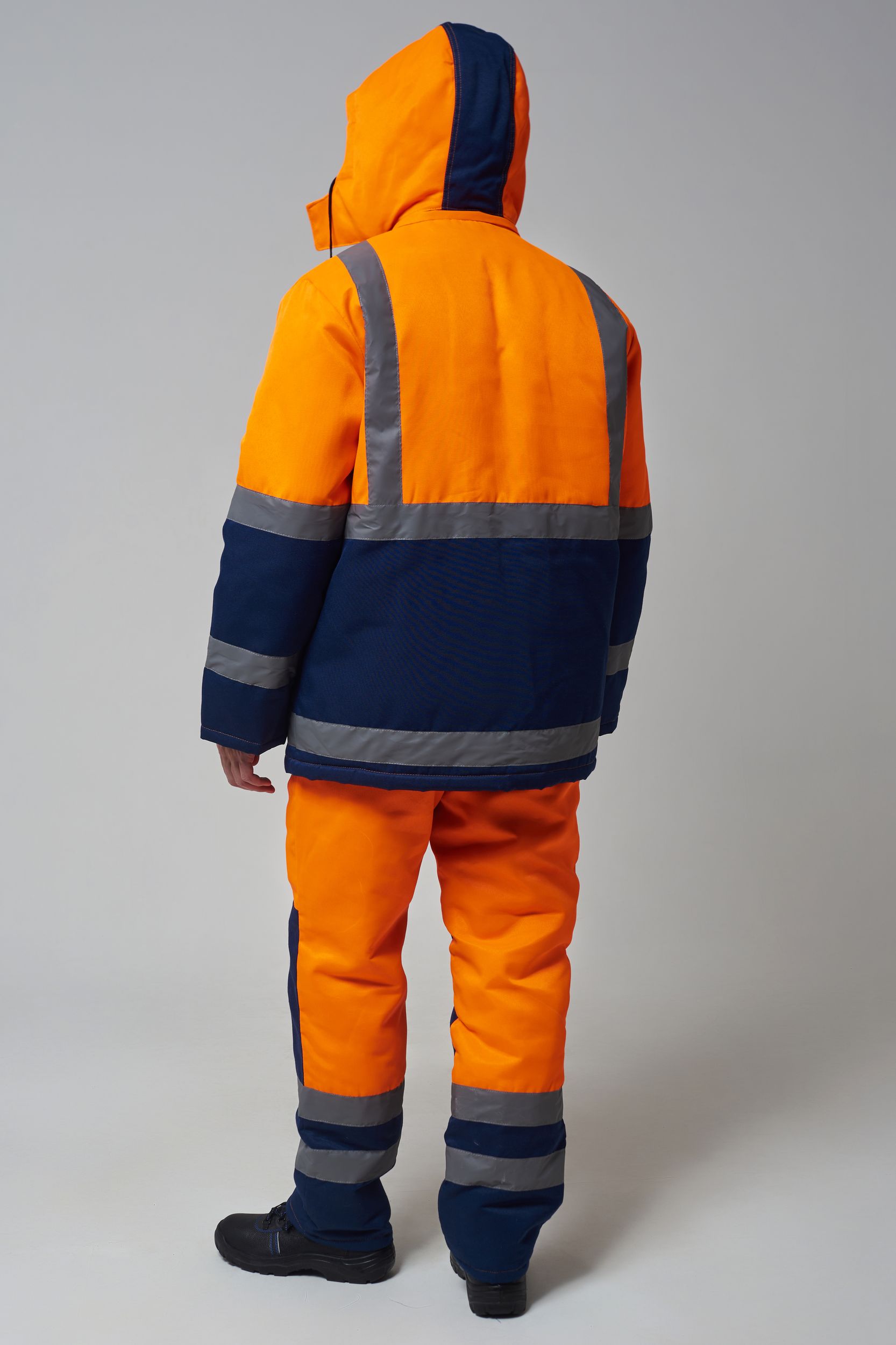 Костюм состоит из куртки и полукомбинезона. Куртка с застежкой на молнию и ветрозащитным клапаном застегивающимся на контактную ленту с нагрудным прорезным карманом и двумя боковыми накладными карманами с клапанами. Регулировка по талии с помощью кулисы воротник стойка с флисовой подкладкой и утеплённый капюшон, регулирующийся по объему. Полукомбинезон с застежкой на молнию. Рукава с внутренними трикотажными манжетами. В области коленей - усилительные накладки. Яркая сигнальная ткань оранжевого цвета в сочетании со светоотражающими полосами обеспечивают высокий уровень безопасности проведения дорожных работ.