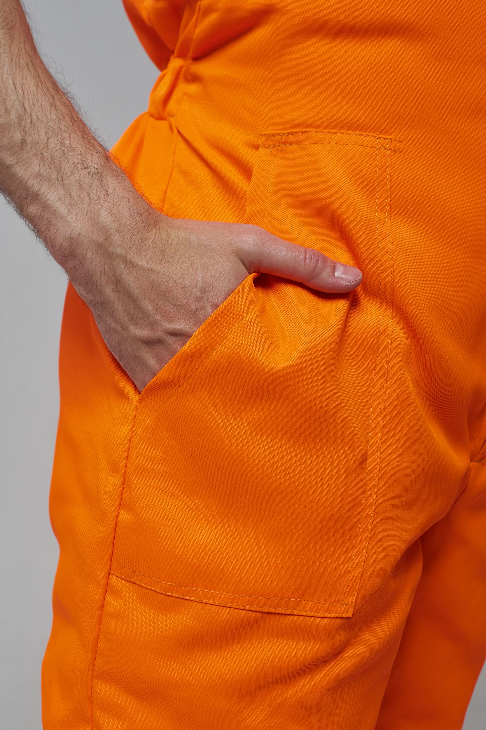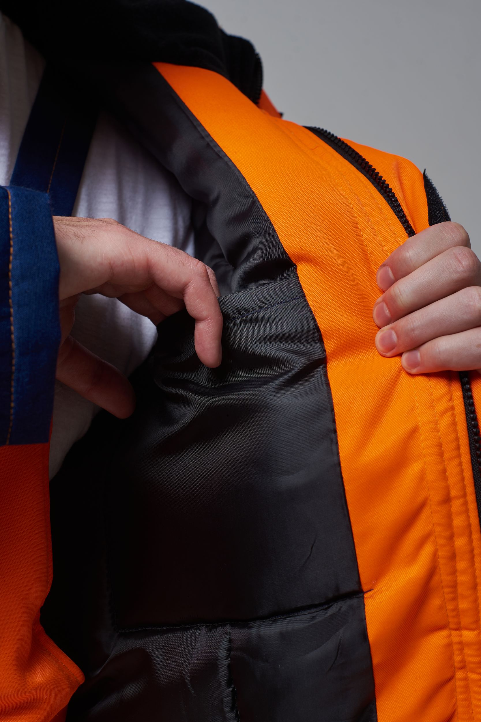 Костюм состоит из куртки и полукомбинезона. Куртка с застежкой на молнию и ветрозащитным клапаном застегивающимся на контактную ленту с нагрудным прорезным карманом и двумя боковыми накладными карманами с клапанами. Регулировка по талии с помощью кулисы воротник стойка с флисовой подкладкой и утеплённый капюшон, регулирующийся по объему. Полукомбинезон с застежкой на молнию. Рукава с внутренними трикотажными манжетами. В области коленей - усилительные накладки. Яркая сигнальная ткань оранжевого цвета в сочетании со светоотражающими полосами обеспечивают высокий уровень безопасности проведения дорожных работ.