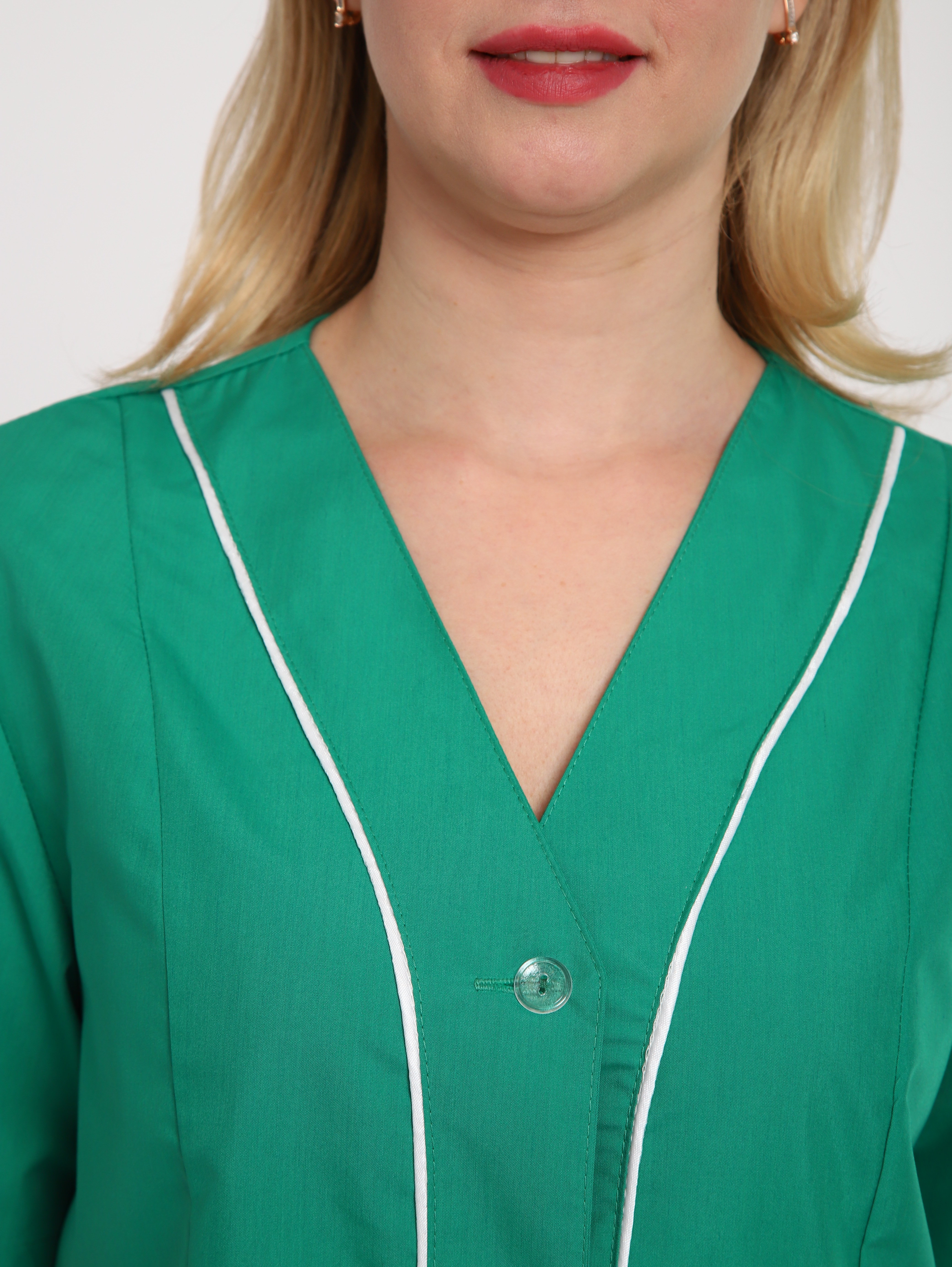 Блуза полуприлегающего силуэта с V-образным вырезом, короткими рукавами, с 2-мя накладными карманами. Белая отделка по планке и карманам.
