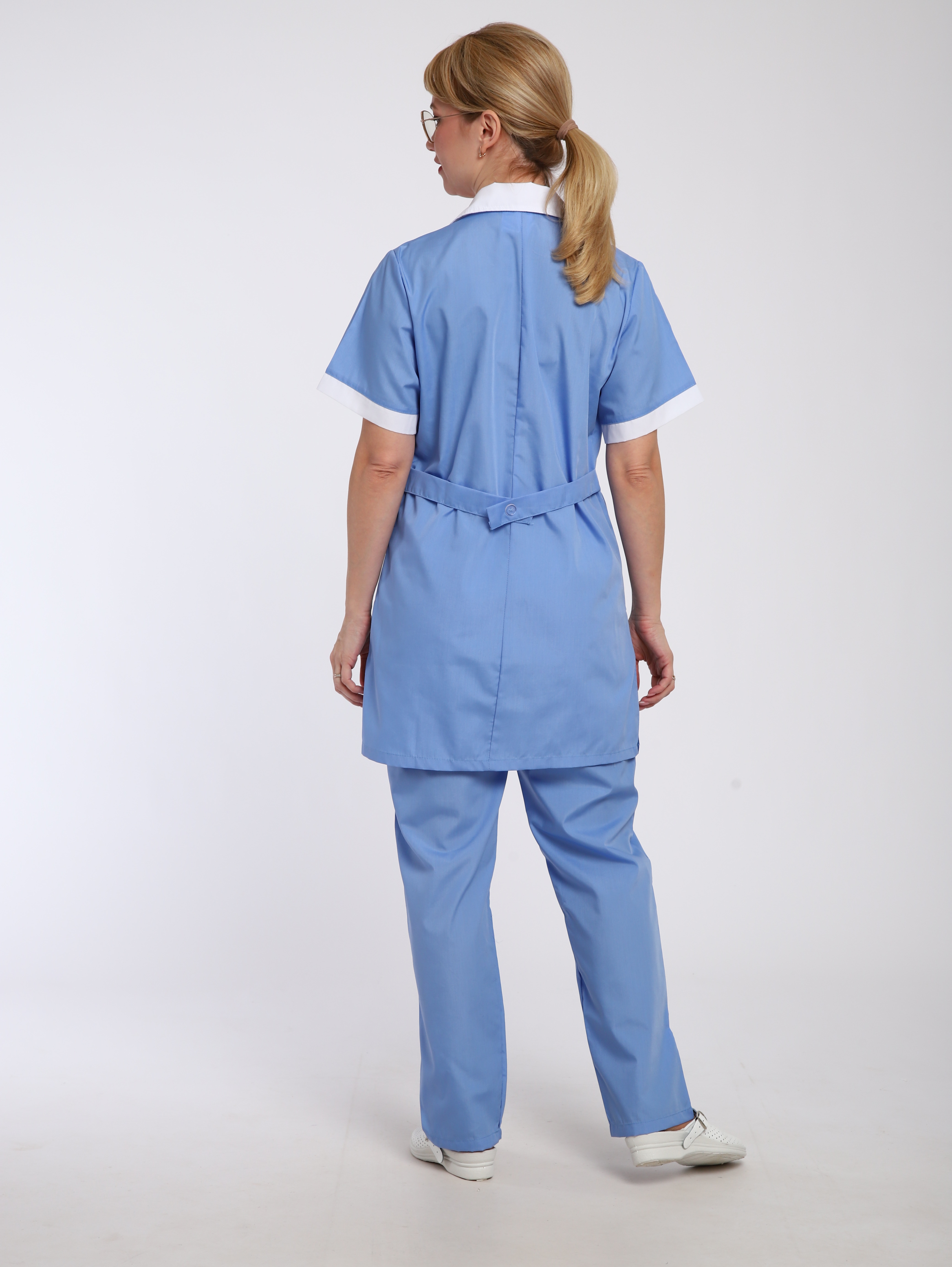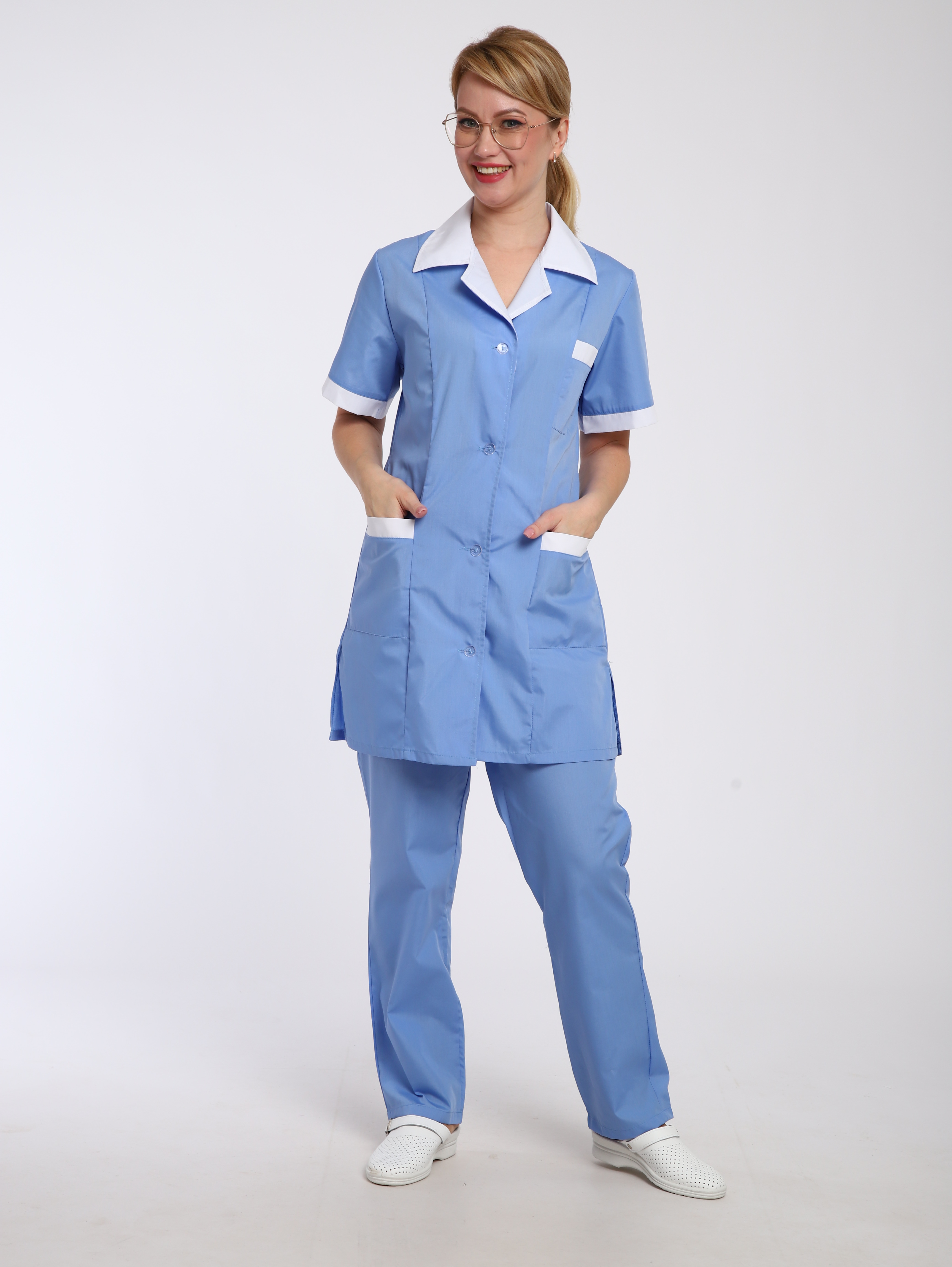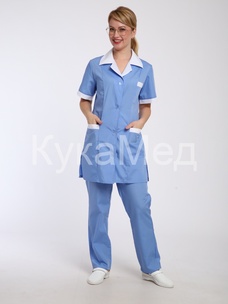 Костюм сине-голубого цвета с удлиненной блузой на пуговицах с коротким рукавом. Отделка ворота, отвороты, рукава, карманы.