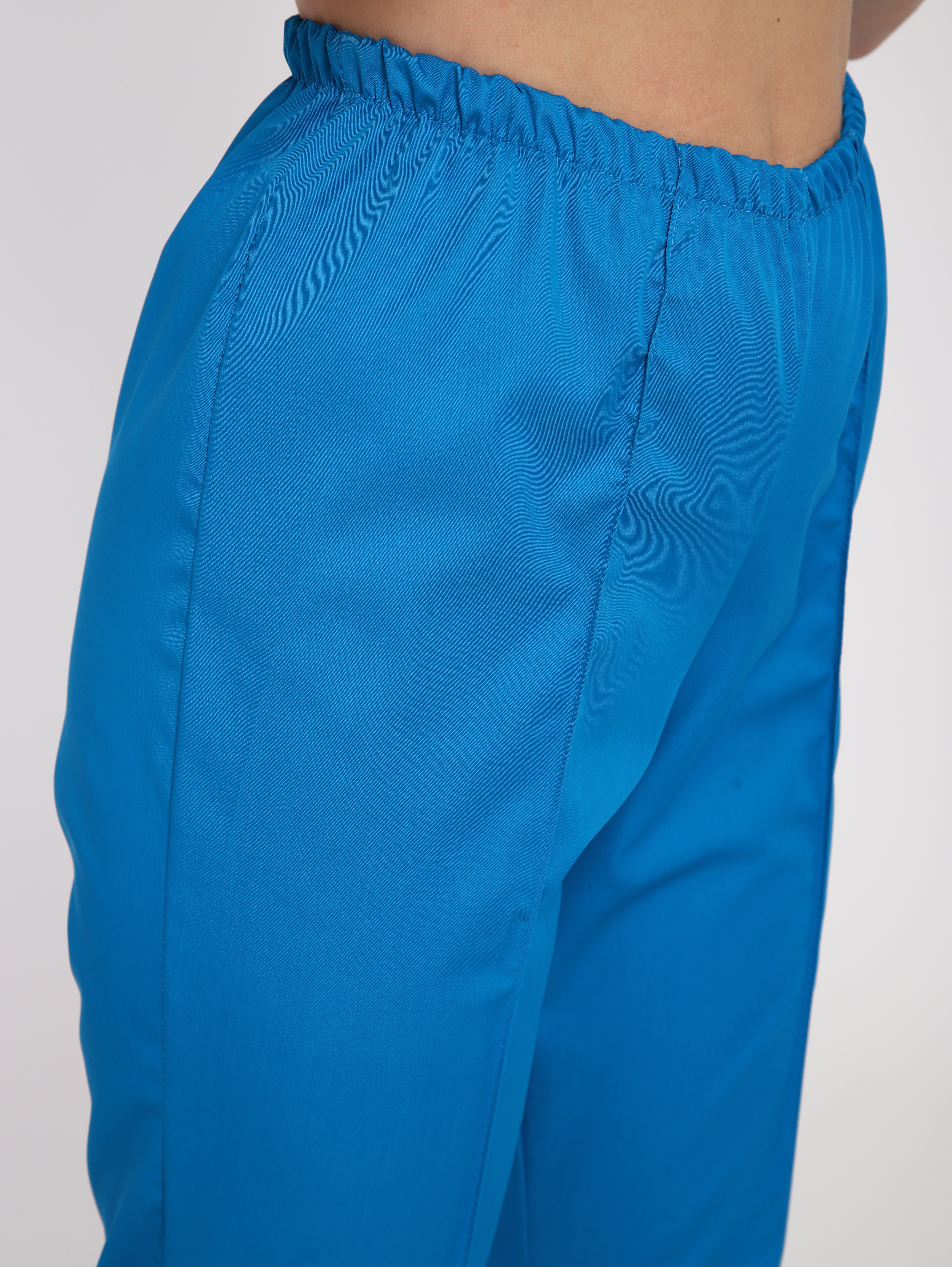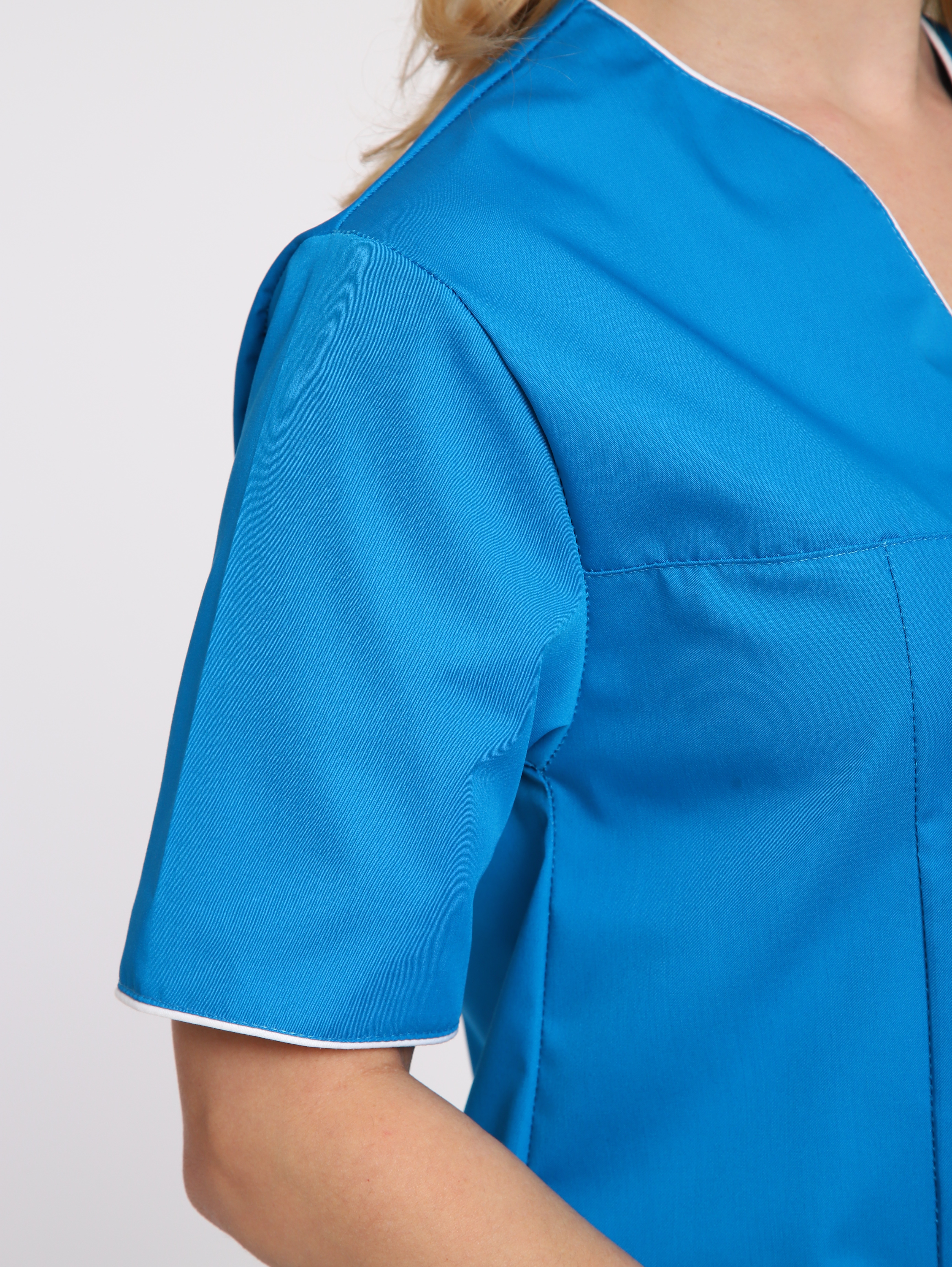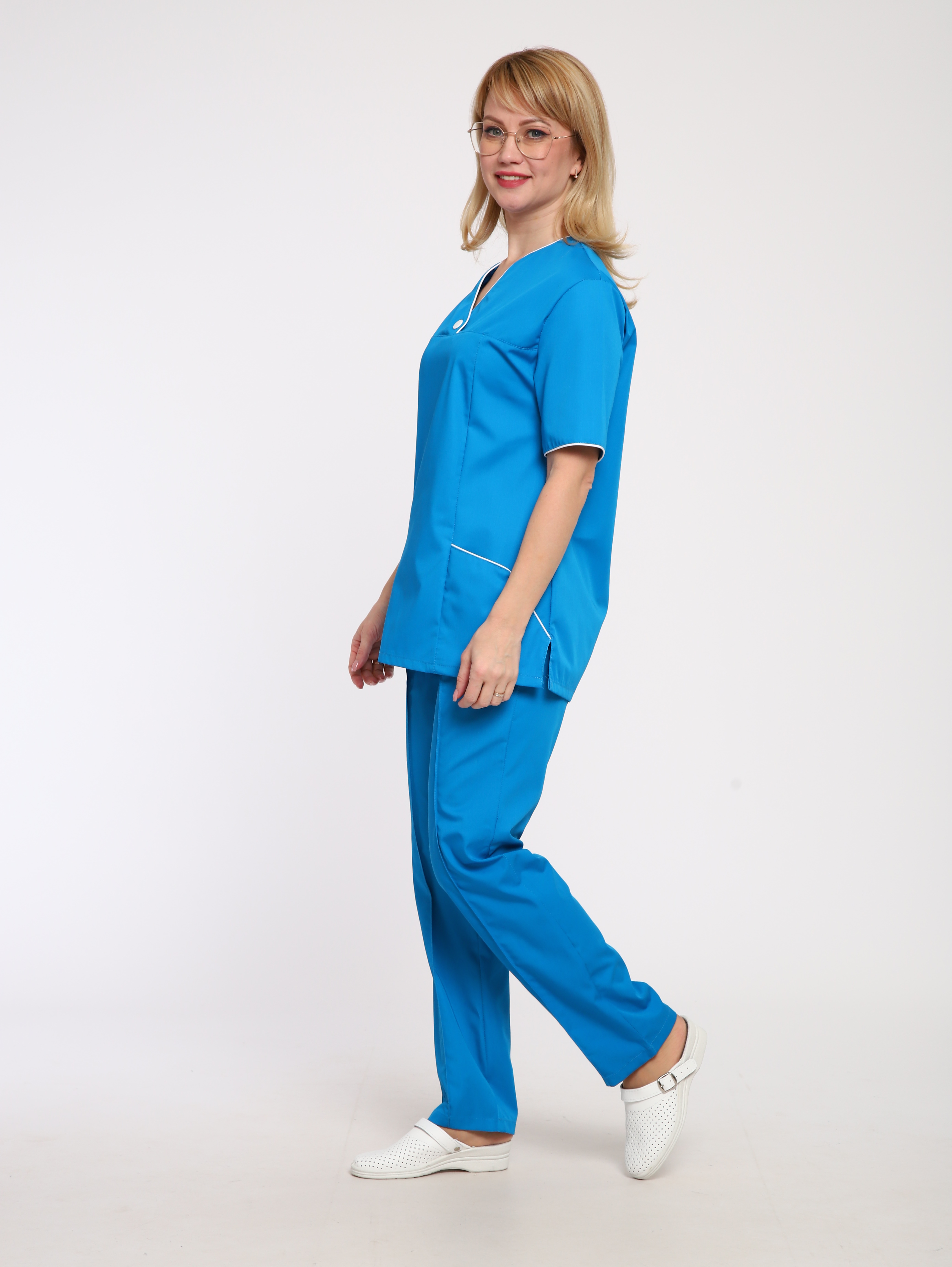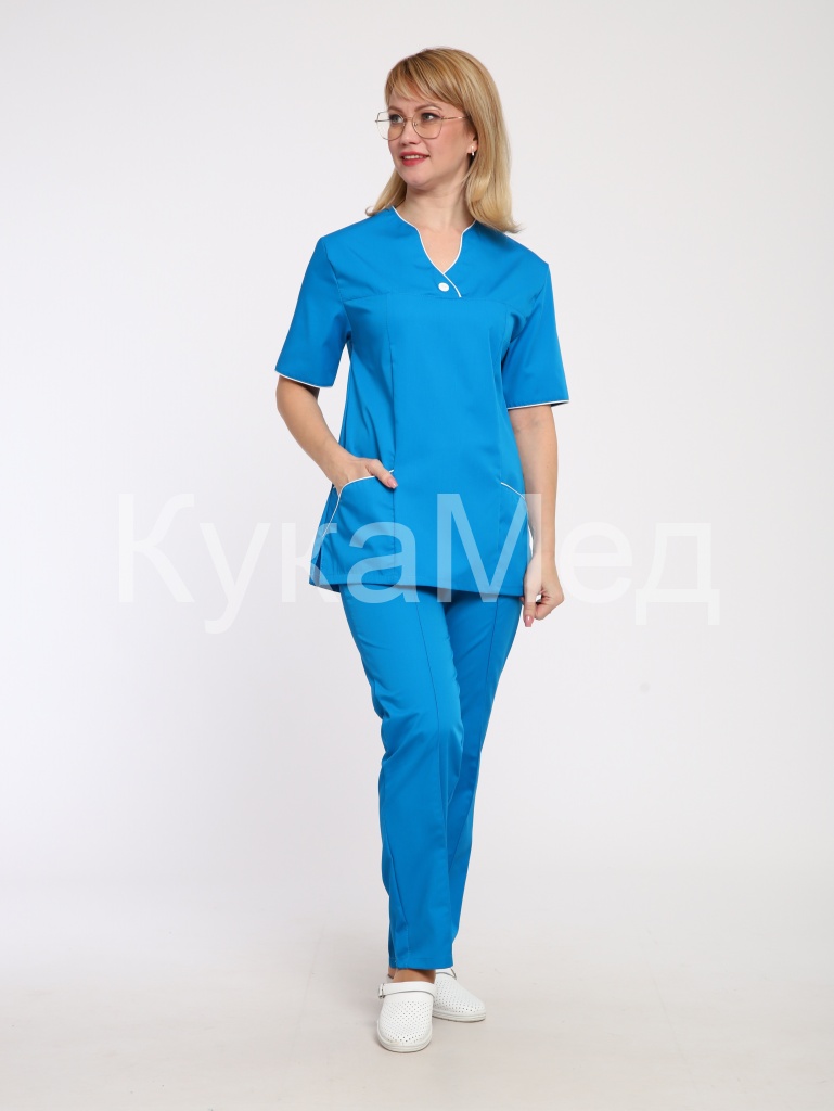 Костюм медицинский, короткий рукав, фигурный вырез горловины. С отделочным кантом по горловине, рукавам и карманам.