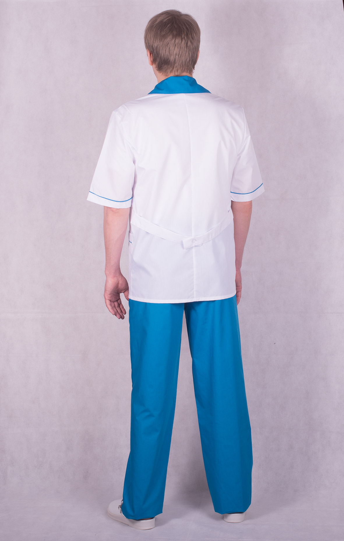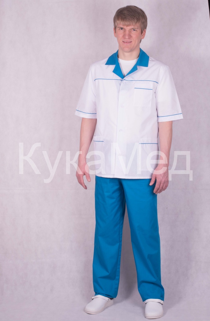 Мужской медицинский костюм с коротким рукавом на пуговицах. Ворот и отвороты в цвет брюк Отделочный кант в цв. по кокетке рукавами карманам.