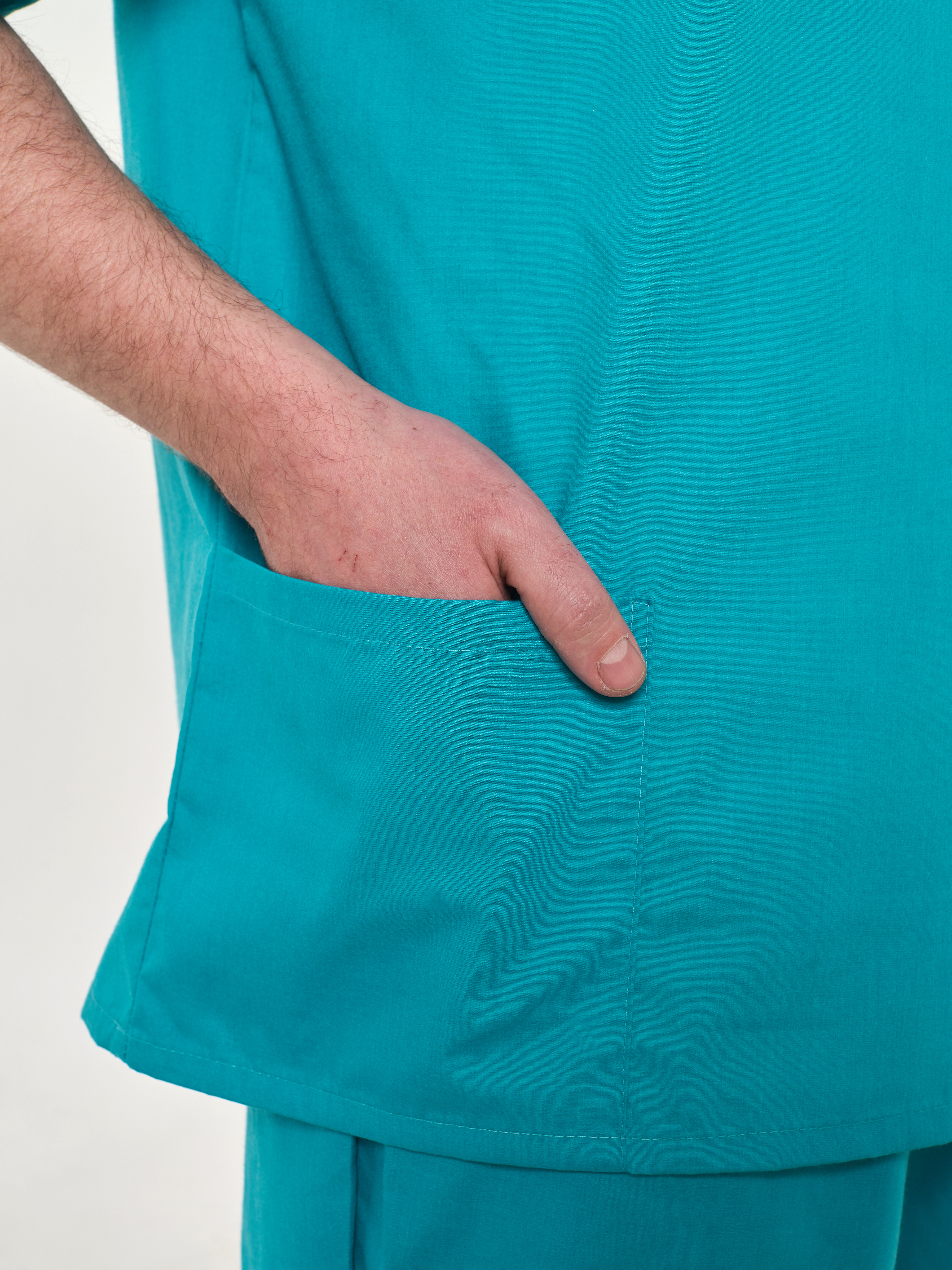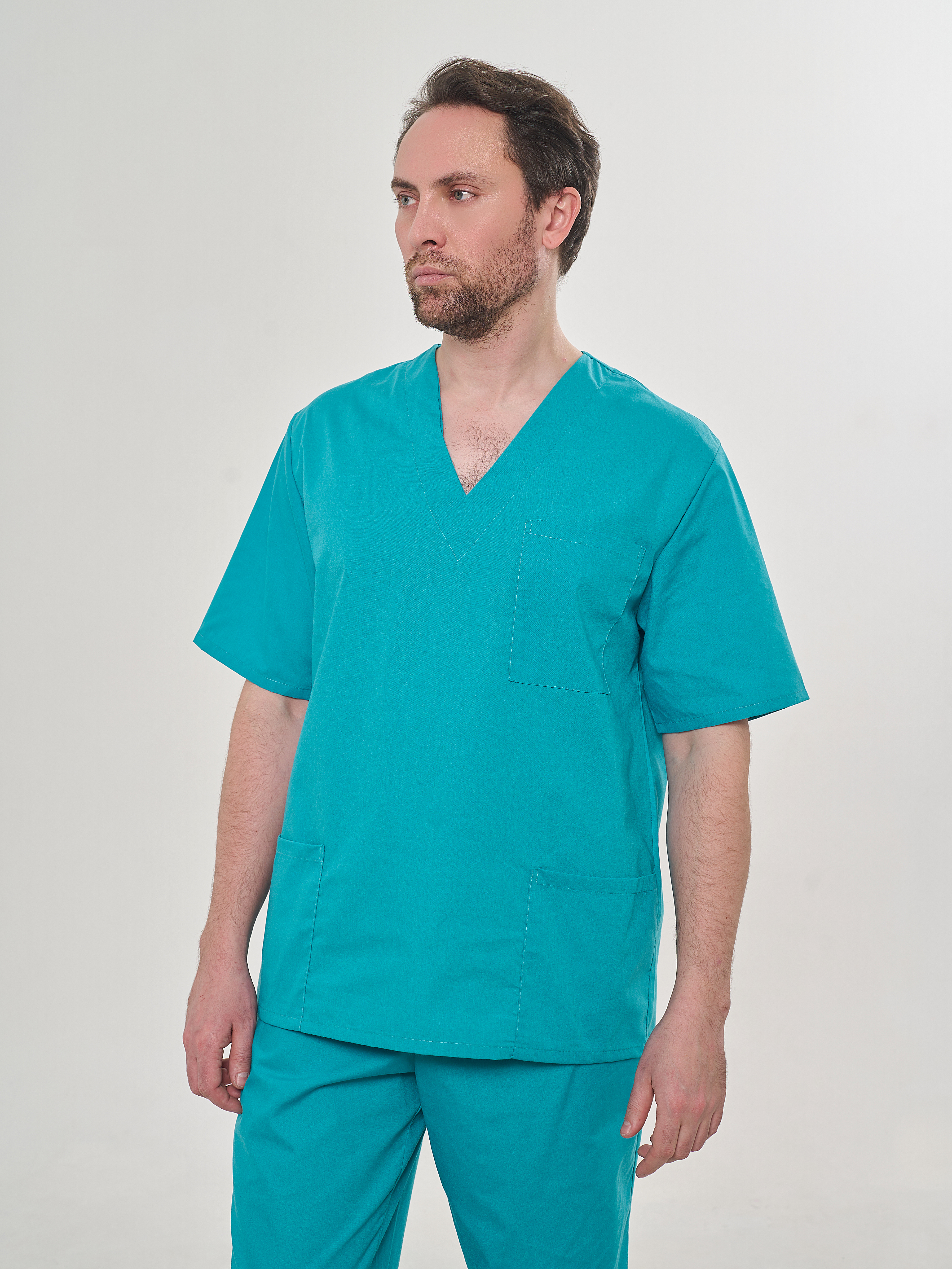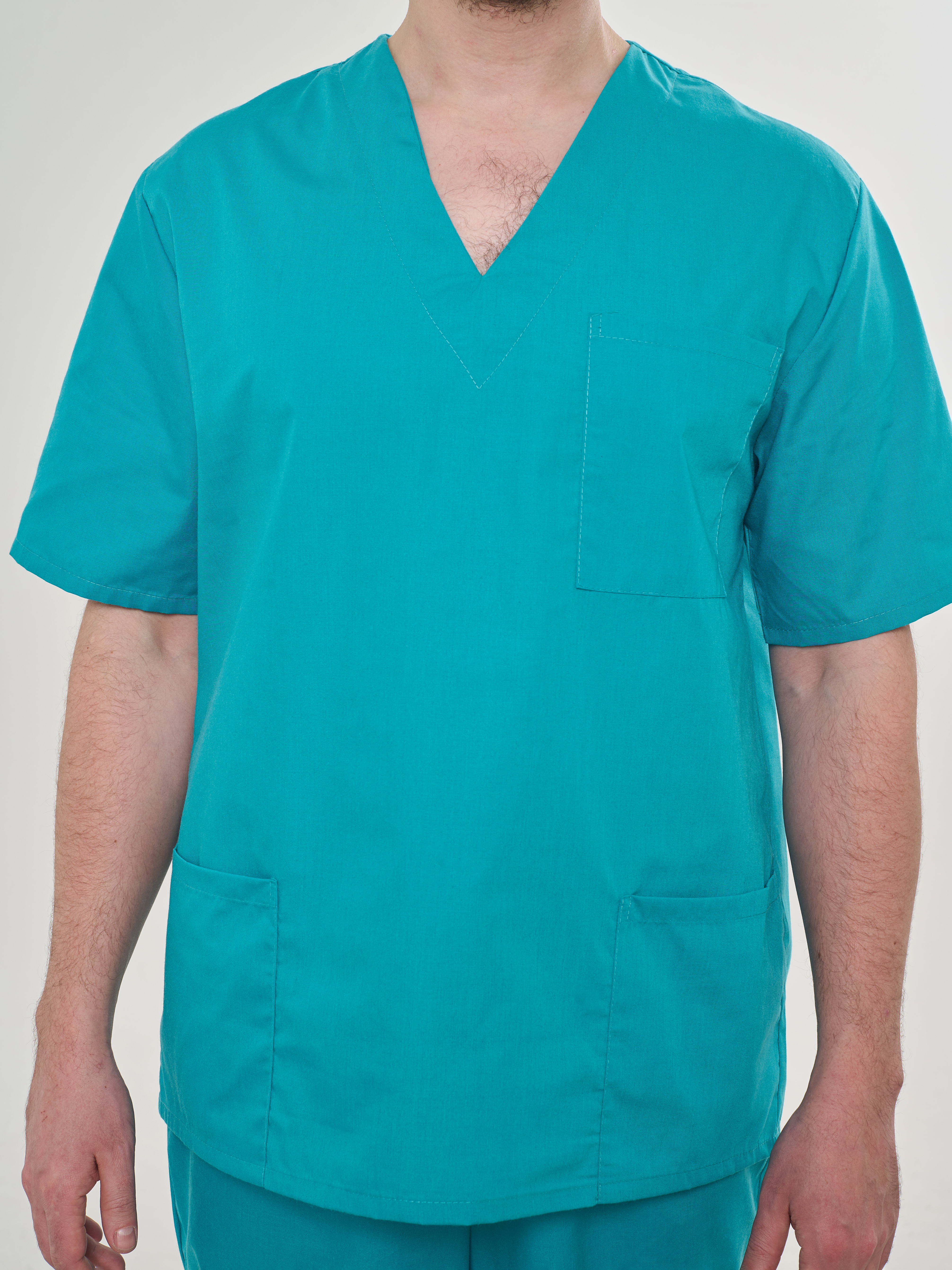 Блуза с V-образной горловиной, короткими рукавами, 3-мя накладными карманами.